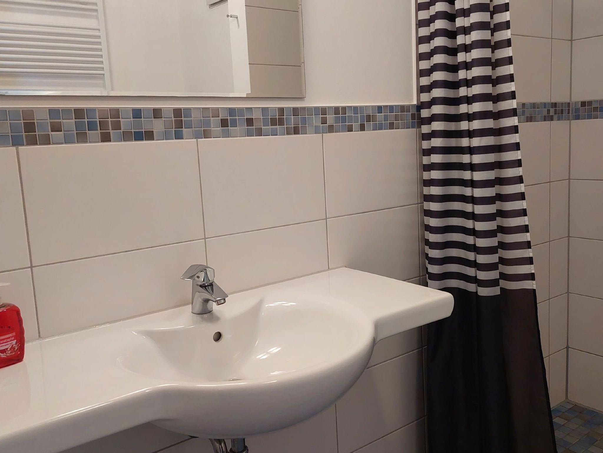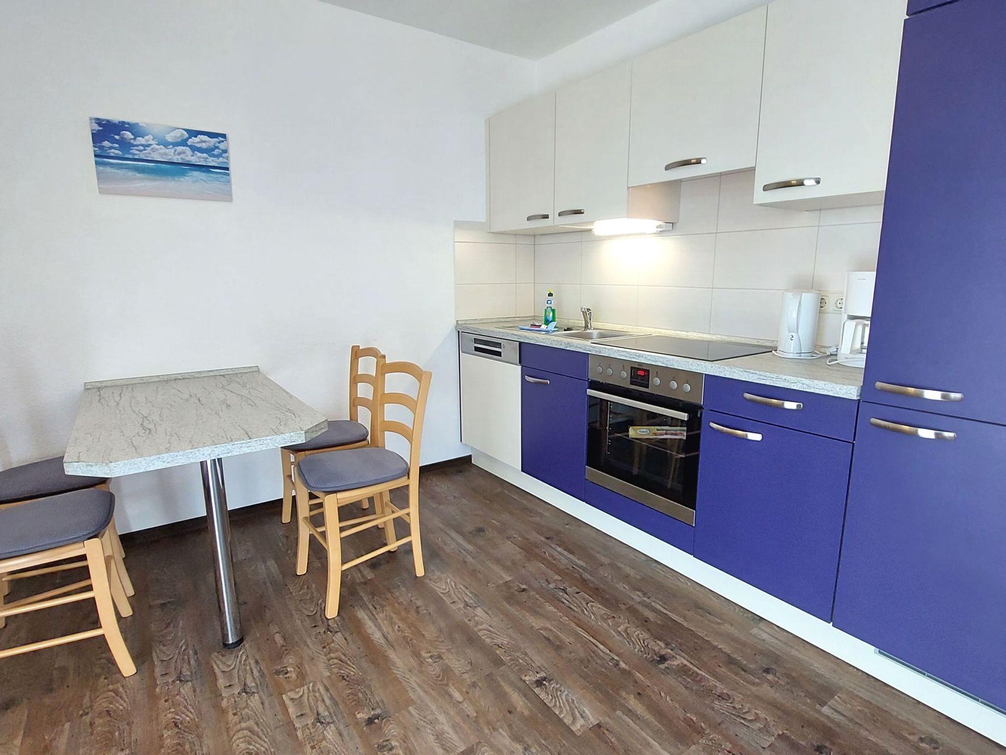 Diese freundliche Wohnung ist aufgeteilt in einen Wohnraum mit Balkon und integrierter Küchenzeile, ein Schlafzimmer und ein Duschbad mit Waschtisch und WC. Das Wohnzimmer begrüßt Sie mit einem Schlafsofa und Sessel sowie Flachbild-TV. Das Schlafzimmer verfügt über ein Doppelbett (1,80m x 2m) sowie einen Kleiderschrank. Die Küchenzeile ist mit Backofen, Geschirrspüler, Cerankochfeld, Kühlschrank mit kleinem Gefrierfach, Cerankochfeld, Mikrowelle, Kaffeemaschine, Wasserkocher und Toaster ausgestattet. Highlights: Kostenfreies WLAN sowie ein frei wählbarer PKW-Stellplatz direkt am Haus.