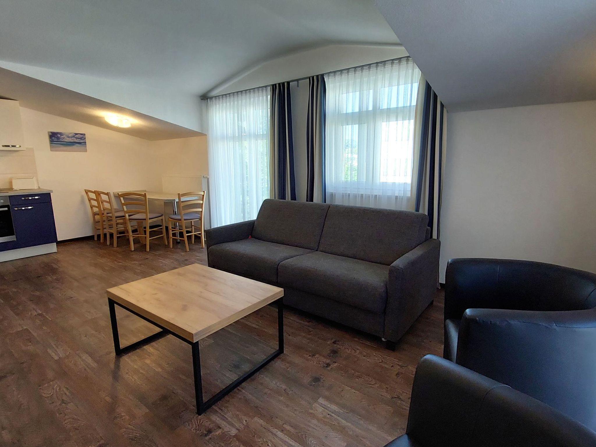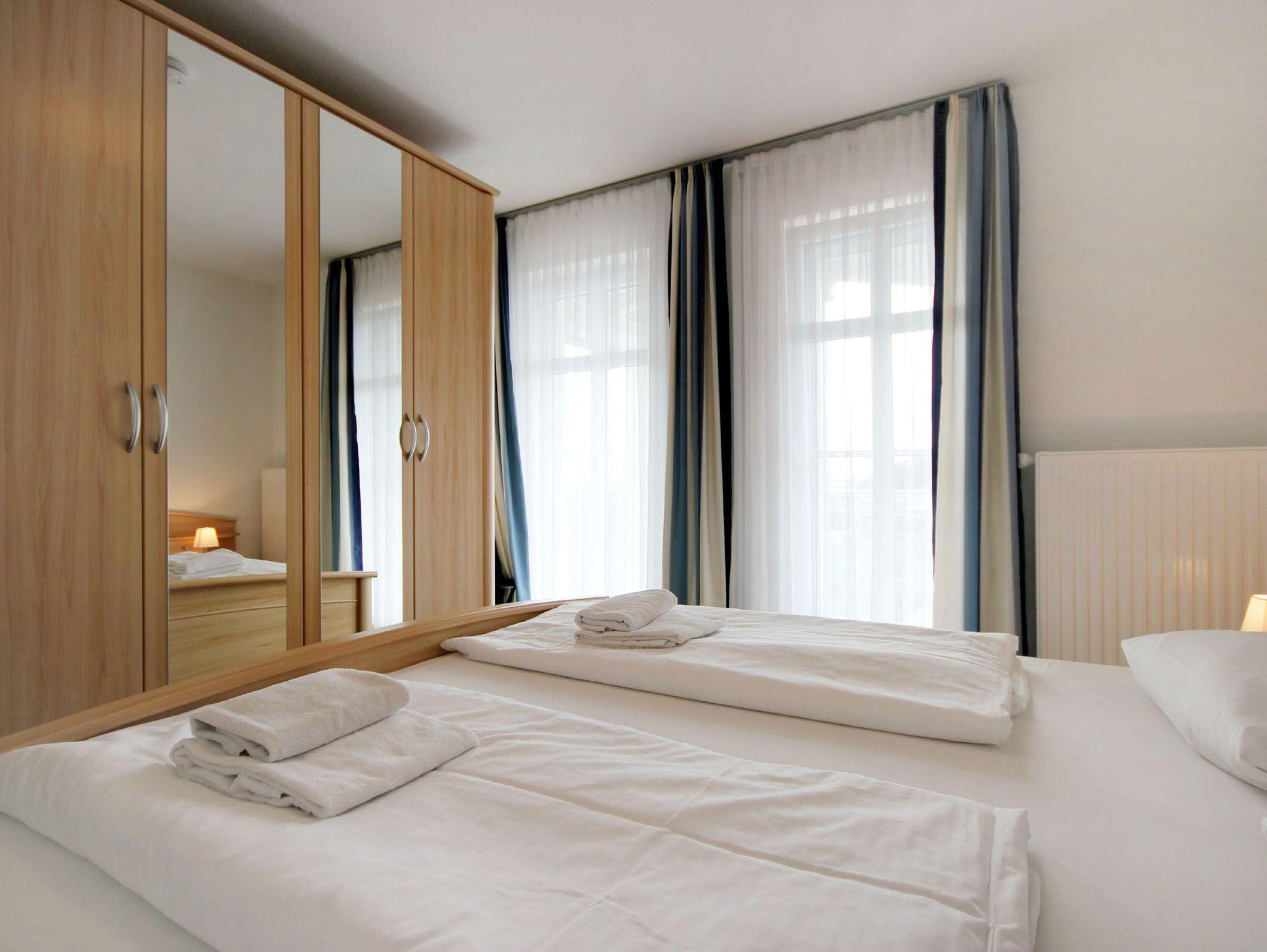 Diese freundliche Wohnung ist aufgeteilt in einen Wohnraum mit Balkon und integrierter Küchenzeile, zwei Schlafzimmer und ein Bad mit Dusche, Waschtisch und WC. Das Wohnzimmer begrüßt Sie mit einem Schlafsofa und Sessel sowie Flachbild-TV. Das Hauptschlafzimmer verfügt über ein Doppelbett (1,80m x 2m) sowie einen Kleiderschrank. Der zweite Schlafraum ebenso mit Balkon begrüßt Sie mit einem Etagenbett, Kleiderschrank und TV. Die Küchenzeile ist mit Backofen, Geschirrspüler, Cerankochfeld, Kühlschrank mit kleinem Gefrierfach, Cerankochfeld, Mikrowelle, Kaffeemaschine, Wasserkocher und Toaster ausgestattet. Highlights: Kostenfreies WLAN sowie ein frei wählbarer PKW-Stellplatz direkt am Haus.