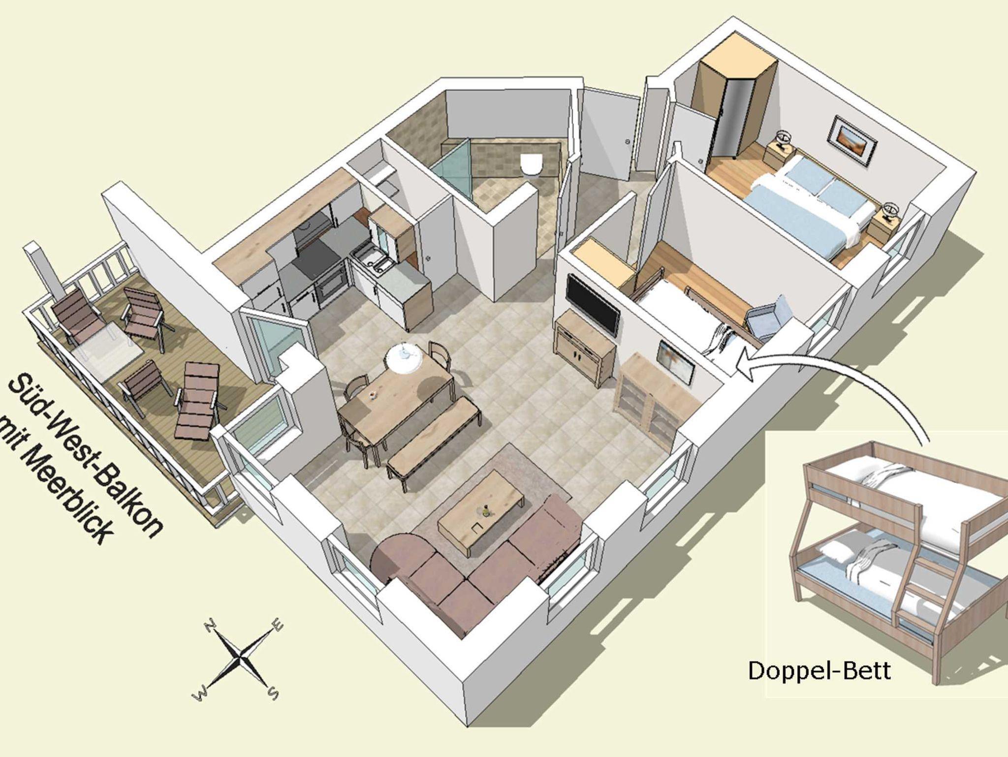 Südwestbalkon mit fantastischem Meerblick, Sitz- und Liegemöglichkeit, Elektrogrill