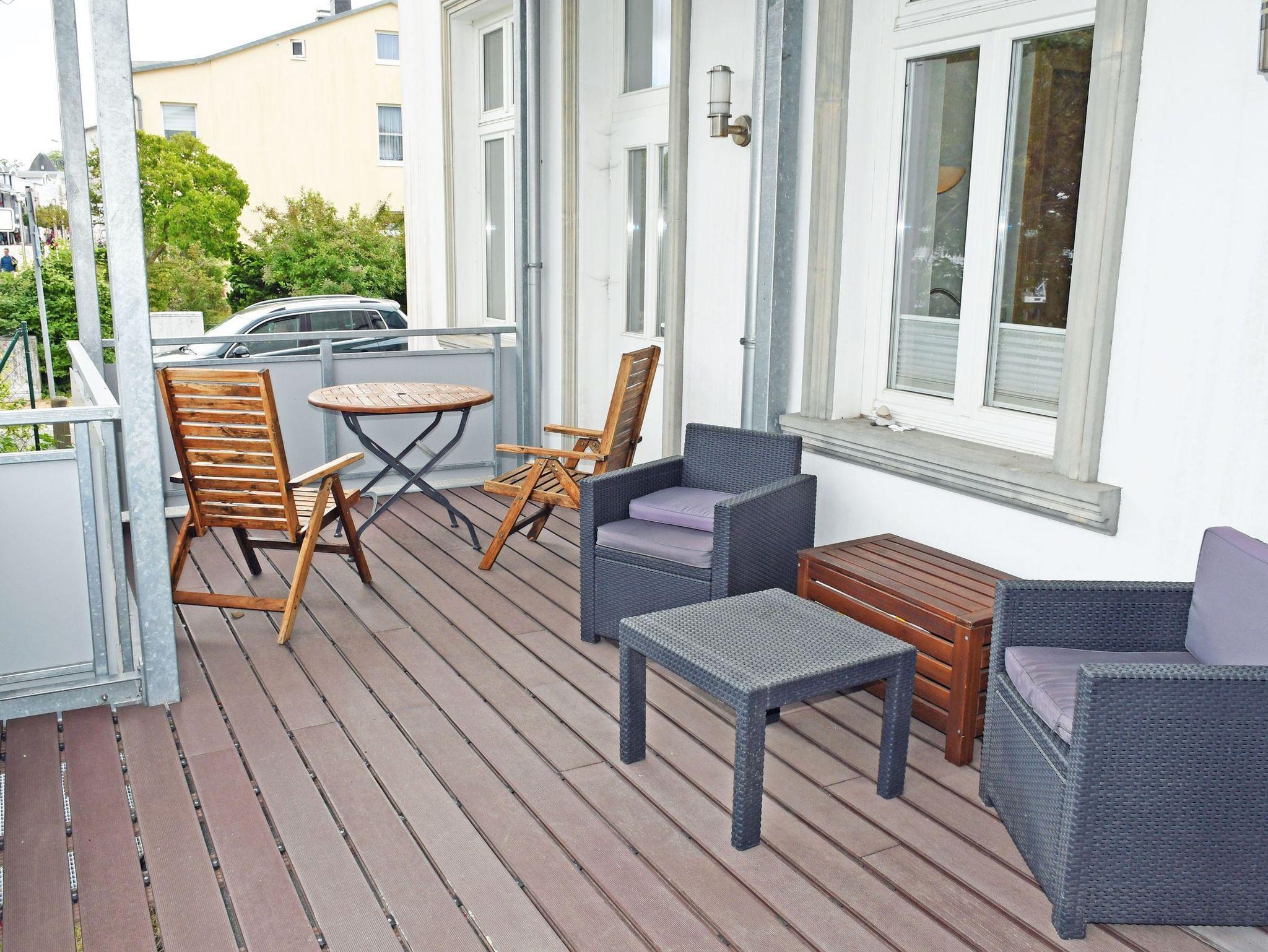 Zur Wohnung gehöhrt ein großer Balkon mit Gartenmöbeln.