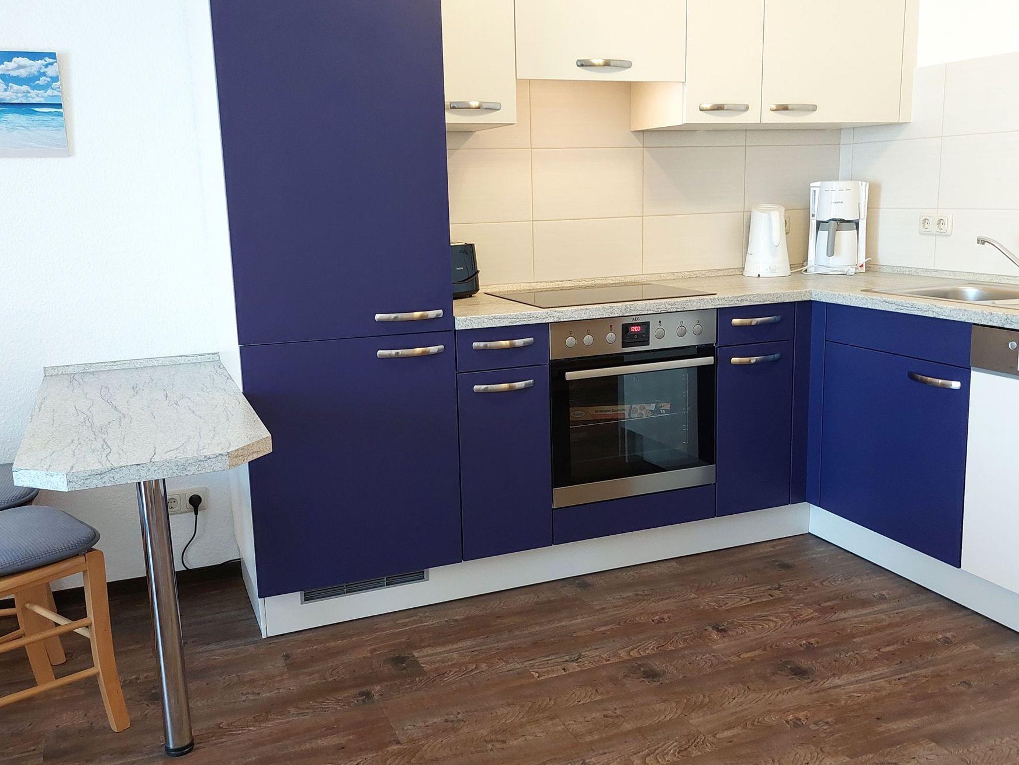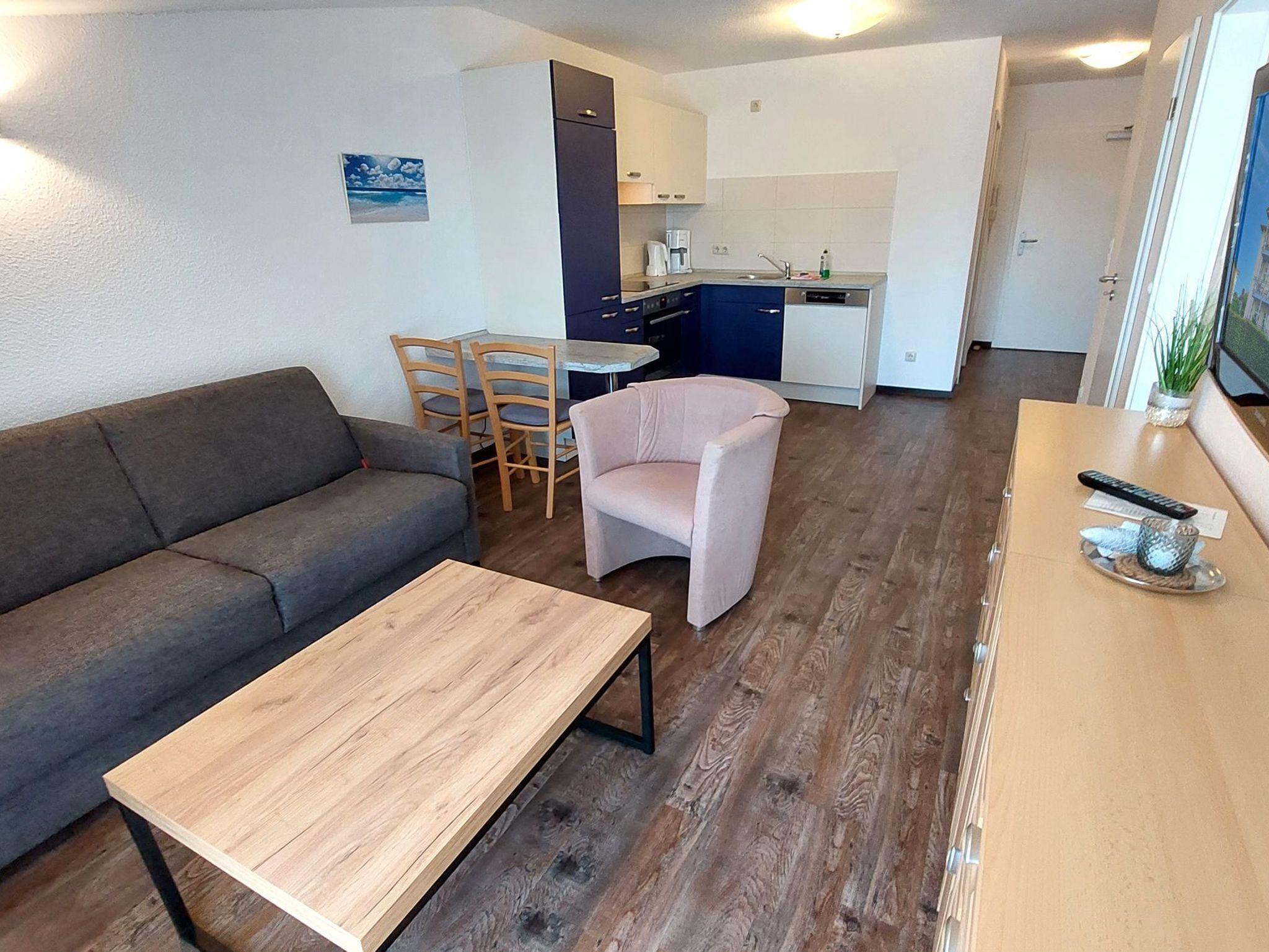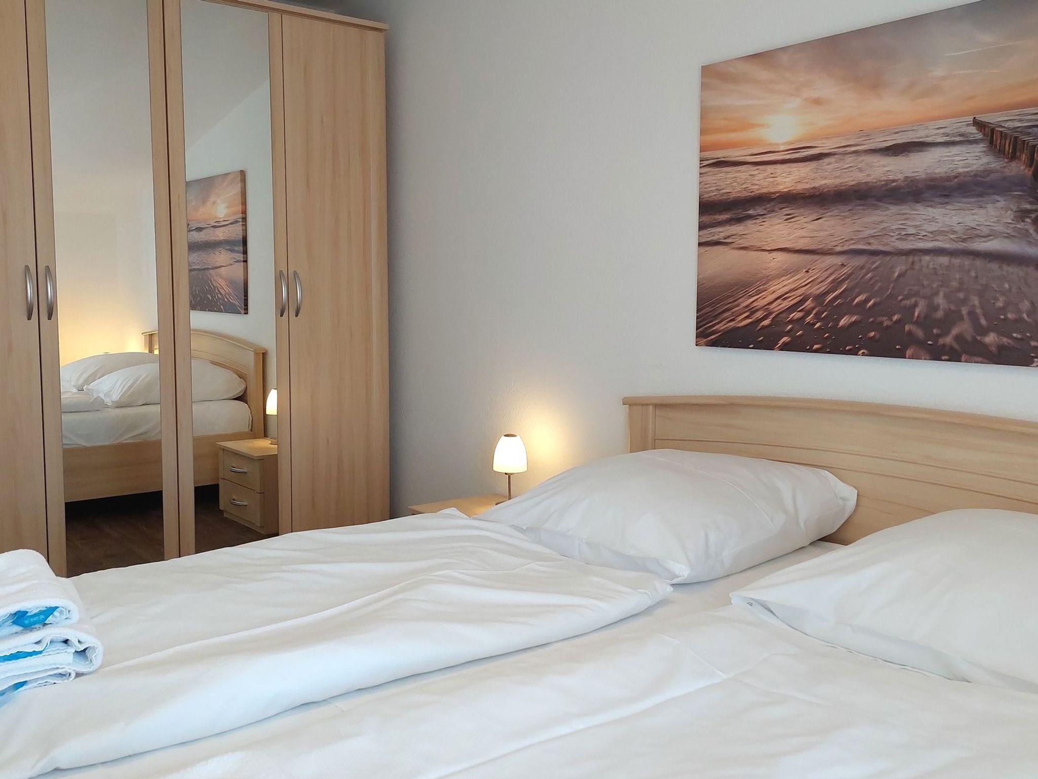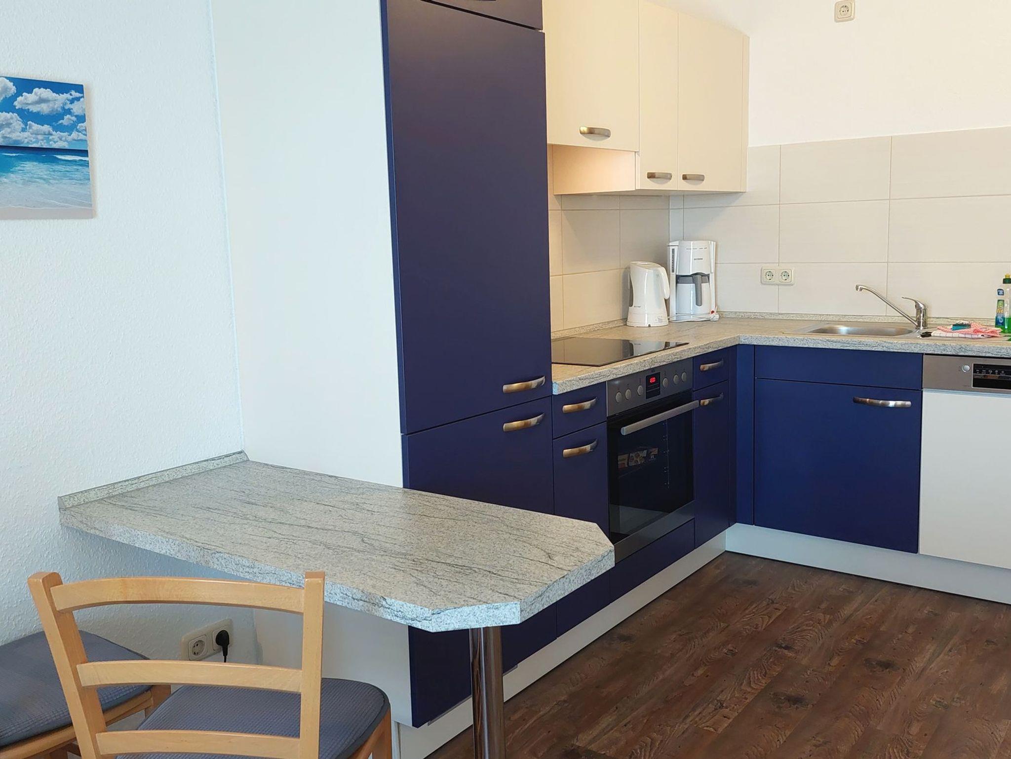 Diese freundliche Wohnung ist aufgeteilt in einen Wohnraum mit Balkon und integrierter Küchenzeile, ein Schlafzimmer ebenso mit Zugang zum Balkon und ein Duschbad mit Waschtisch und WC. Das Wohnzimmer begrüßt Sie mit einem Schlafsofa und Sessel sowie Flachbild-TV. Das Schlafzimmer verfügt über ein Doppelbett (1,80m x 2m) sowie einen Kleiderschrank. Die Küchenzeile ist mit Backofen, Geschirrspüler, Cerankochfeld, Kühlschrank mit kleinem Gefrierfach, Cerankochfeld, Mikrowelle, Kaffeemaschine, Wasserkocher und Toaster ausgestattet. Highlights: Kostenfreies WLAN sowie ein frei wählbarer PKW-Stellplatz direkt am Haus.