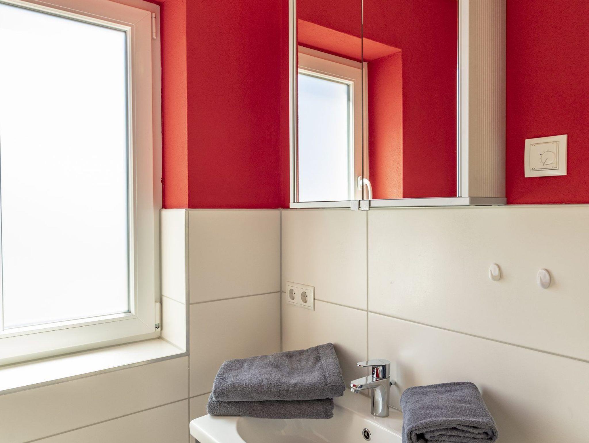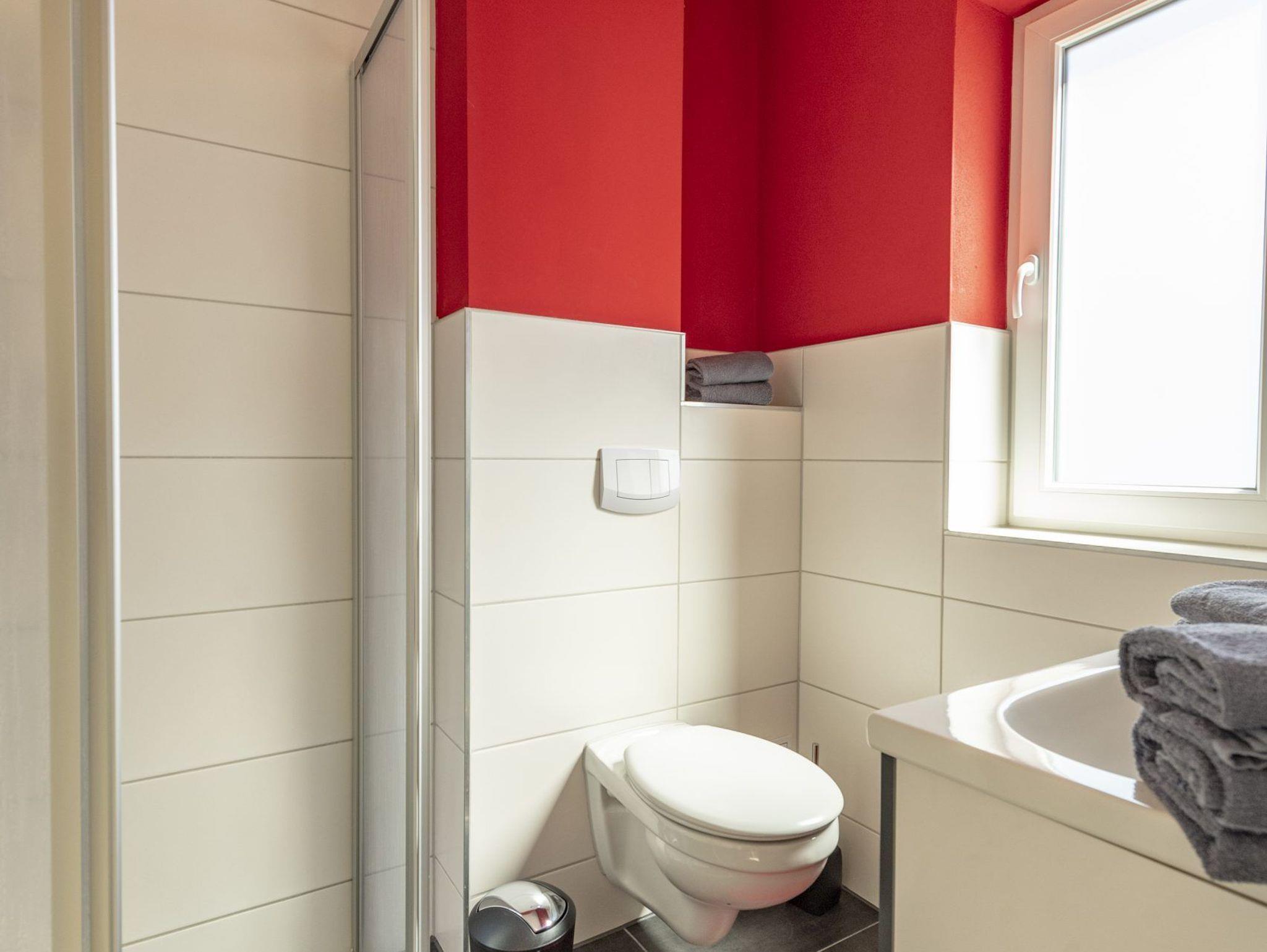 * Bad mit Dusche, WC, 1 Waschtisch mit Spiegel (mit Fenster)