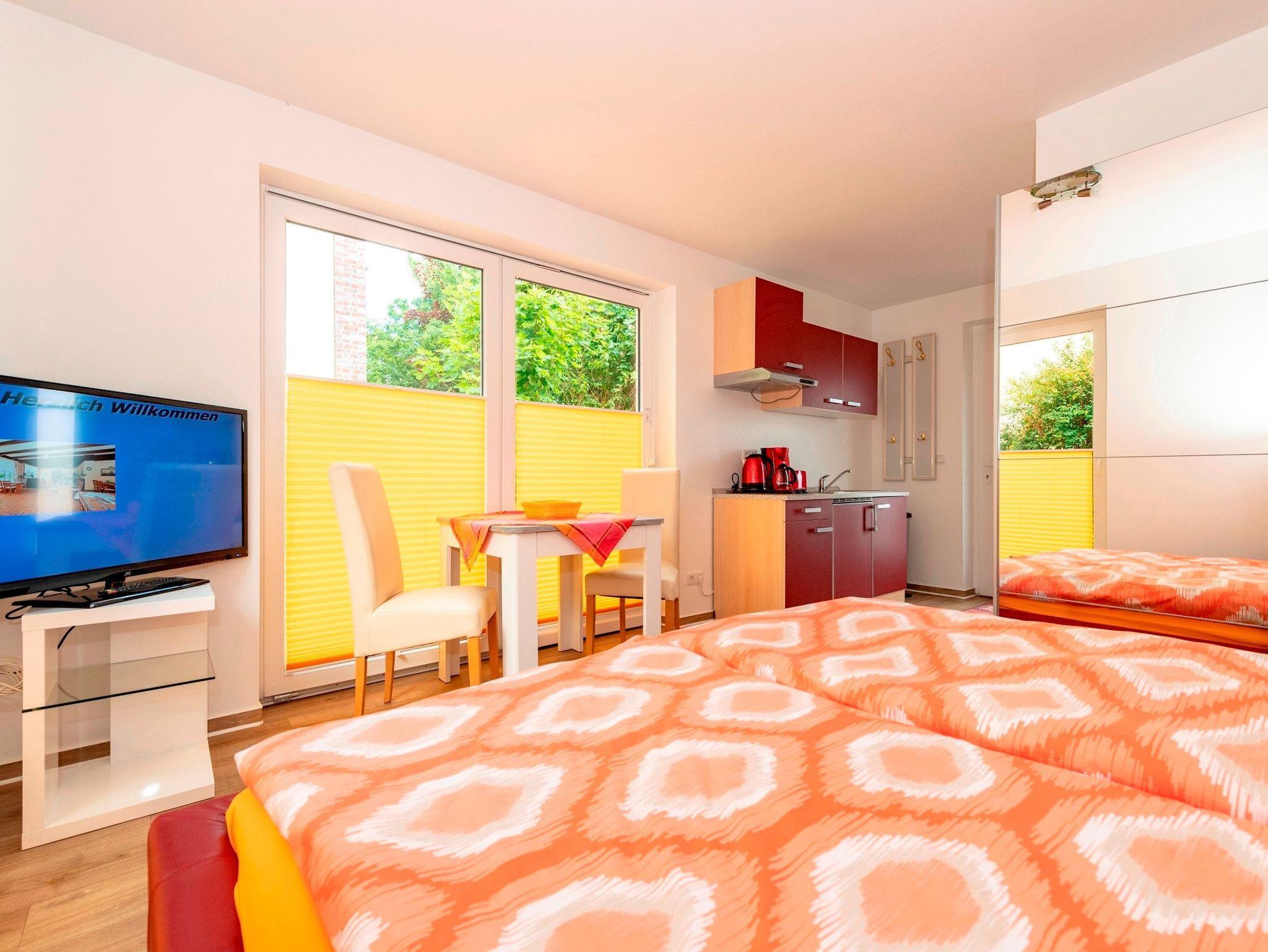 Unsere ruhig gelegenen, hellen und lichtdurchfluteten 1-Raum-Ferienwohnungen mit Terrasse sind wie folgt ausgestattet: