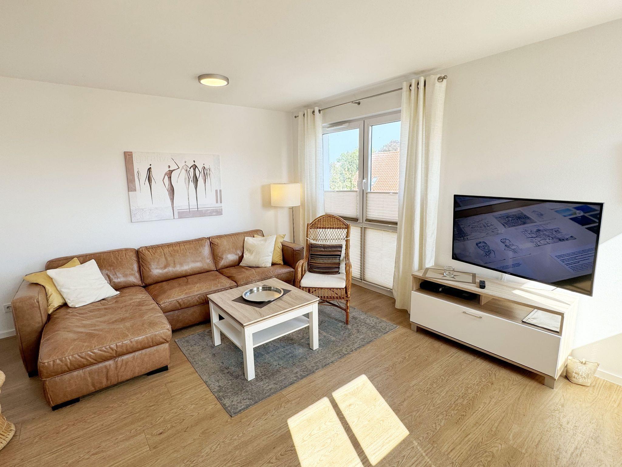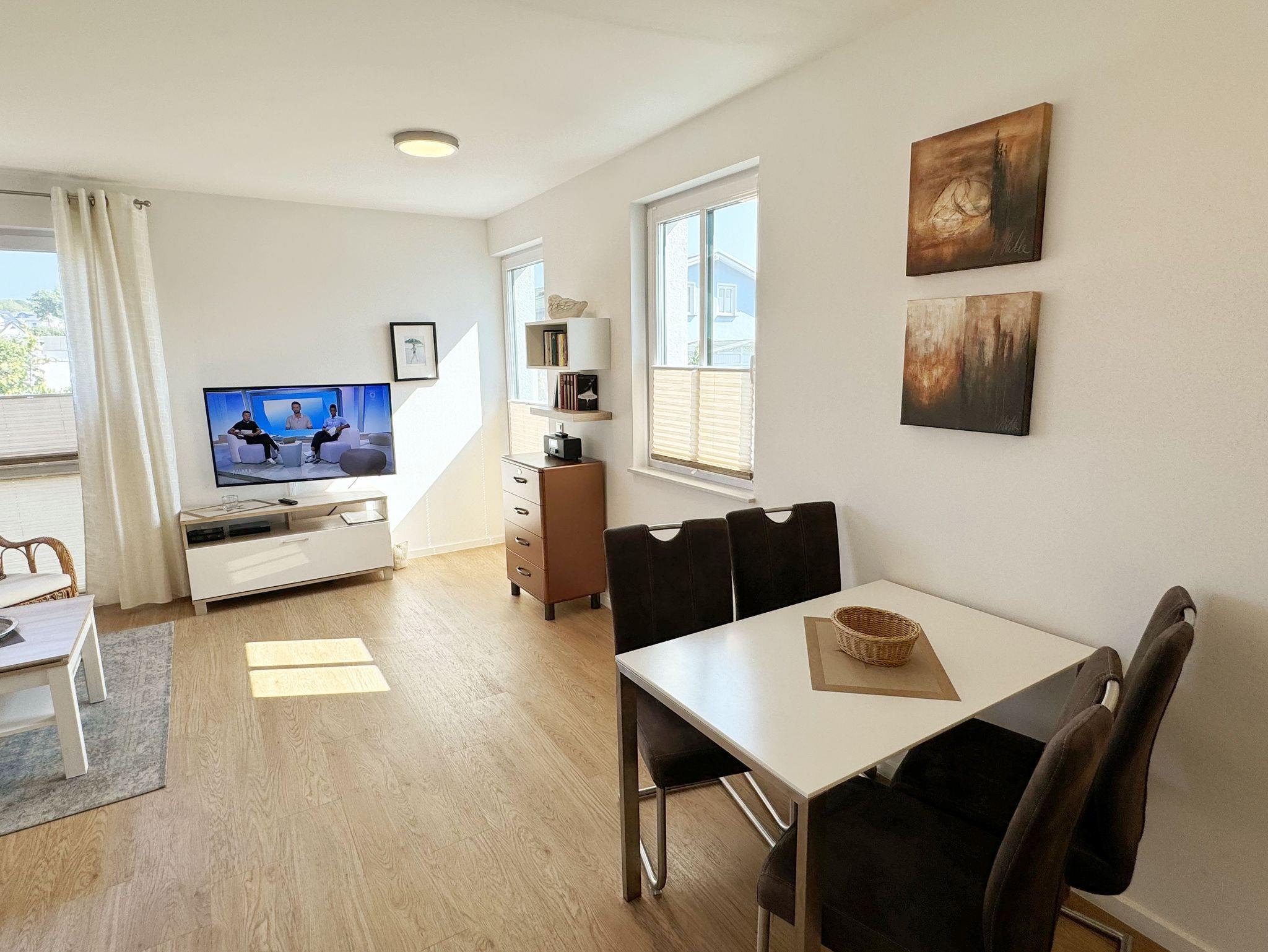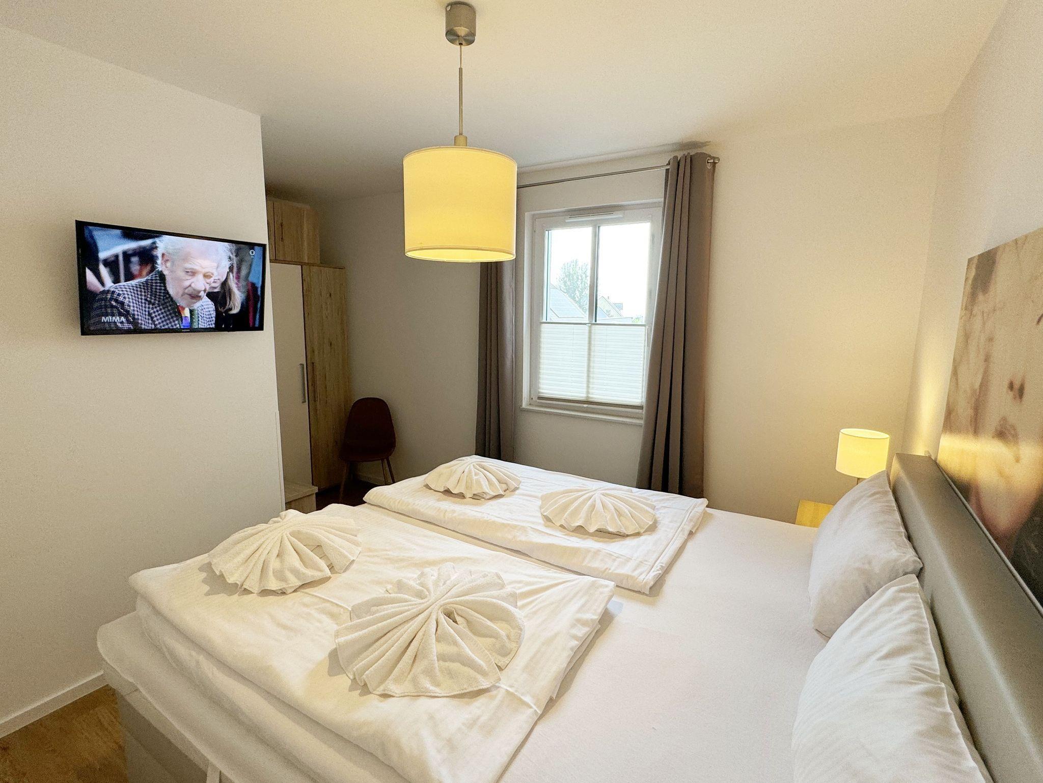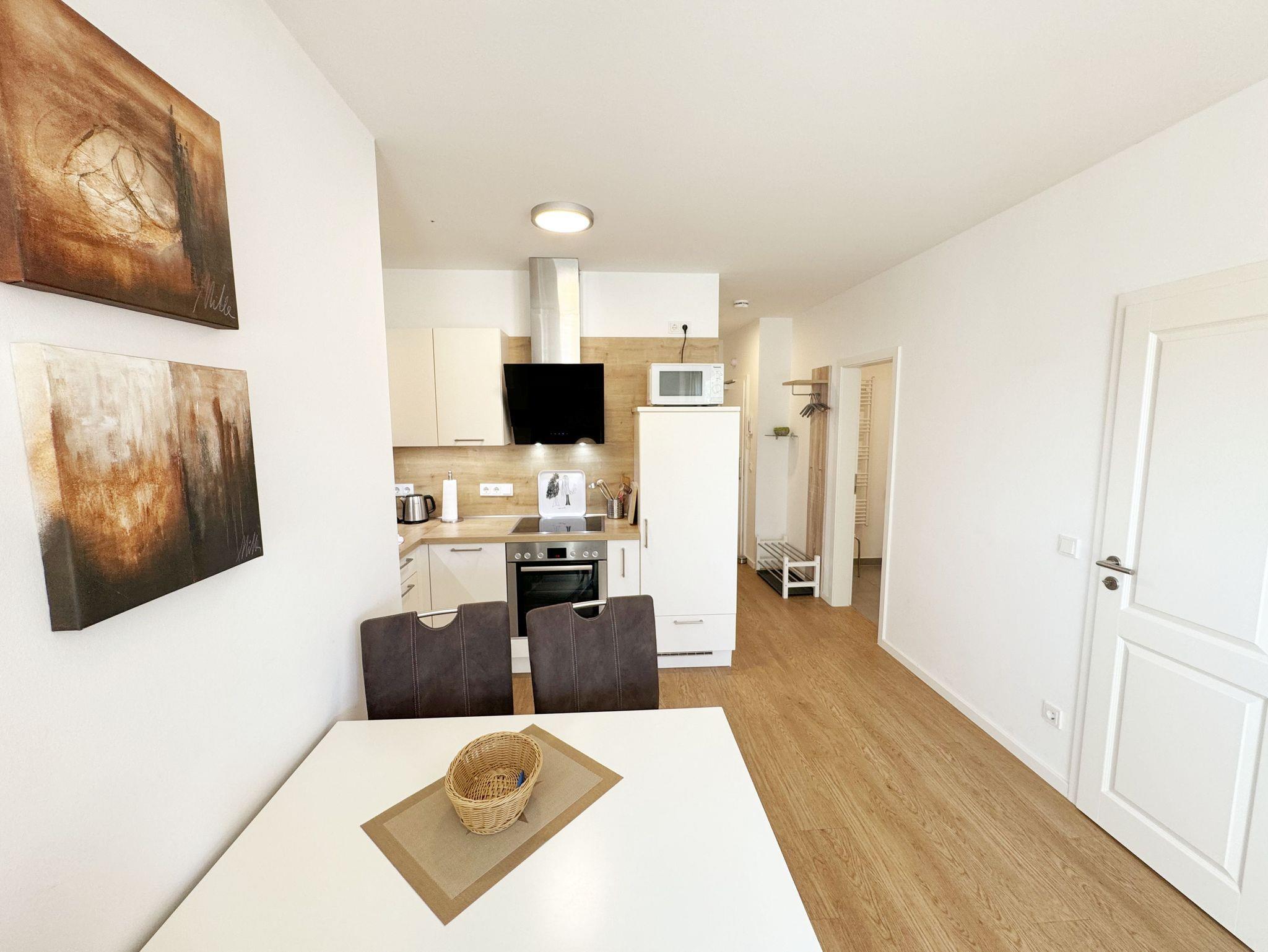 Die Wohnung Nr. 4 der Villa Anni ist eine komfortable, ca. 57 m² große und stilvoll eingerichtete Nichtraucherferienwohnung im ersten Obergeschoss. Sie bietet Ihnen ausreichend Platz für 2 bis 3 Personen. Der kombinierte Wohn-/Koch- und Essbereich mit der modernen und integrierten Küchenzeile lässt mit Ceranfeld, Backofen, Geschirrspüler, Mikrowelle, Kühlschrank mit Gefrierfach, Kaffeemaschine, Wasserkocher, Toaster und diversen Küchenutensilien keine Wünsche offen. Der Essbereich fügt sich der Küchenzeile an. Der offene Wohnbereich verfügt über eine gemütliche Sitzecke (Liegefläche 1,50m x 2,00m) mit Couchtisch, eine Leselampe, ein TV mit CD-Player, DAB-Radio und einen Blu-Ray Player. Auch auf einen Internetanschluss (WLAN) müssen Sie in Ihrem Urlaub nicht verzichten. Dieser ist für Sie inklusive! Eine Auswahl an Gesellschaftsspielen und Urlaubslektüre sorgt für eine gelungene Abwechslung. Der nach Nord/Osten mit Blick Richtung Meer ausgerichtete, und bestuhlte Balkon mit Sonnenschirm ist direkt vom Wohnbereich aus zu erreichen. Das Schlafzimmer verfügt über ein Boxspringbett mit Tonnentaschenfederkernmatratzen (1,80m x 2,00m), Nachttischablagen, Flachbild-TV und einen Kleiderschrank. Für einen ruhigen Schlaf sorgt eine Verdunklungsmöglichkeit sowie ein Insektenschutzgitter. Das Bad ist mit einer ebenerdigen Dusche, Waschplatz, Kosmetikspiegel, WC, Handtuchheizkörper und Fön ausgestattet. Im Schlafzimmer ist ein Insektenschutzgitter vorhanden. Alle Räumlichkeiten sind mit einer Fußbodenheizung versehen und sorgen für eine angenehme Wärme. Ein eigener PKW-Stellplatz (Nr. 4) befindet sich in der Tiefgarage (Einfahrtshöhe: 2,00 m) des Hauses. 1 kleiner Hund ist gegen eine Gebühr in der Wohnung erlaubt! Die Erstausstattung eines Wäschepaketes (komplette Bettwäsche, 1 Duschhandtuch, 2 kleine Handtücher) können Sie bis 14 Tage vor Anreise gegen einen Aufpreis dazu buchen oder durch eigene ergänzen. Ab 2 gebuchten Paketen erhalten Sie einmalig 1 Geschirrhandtuch und 1 Duschvorleger hinzu.