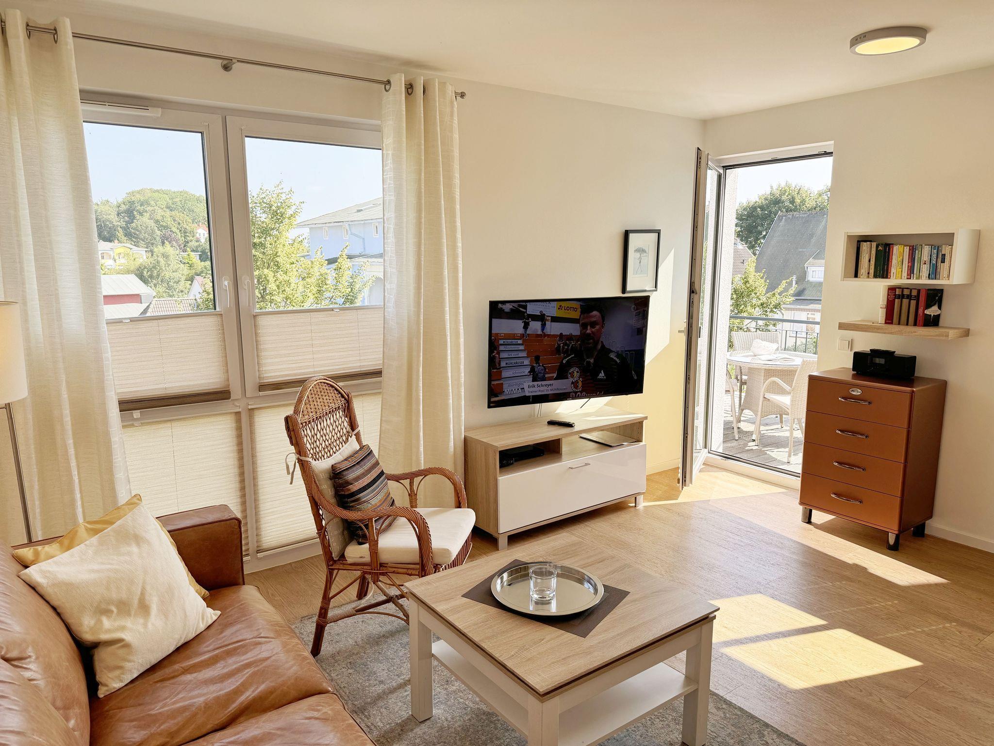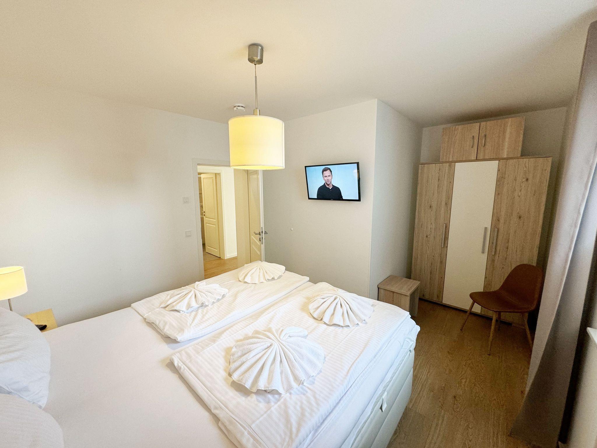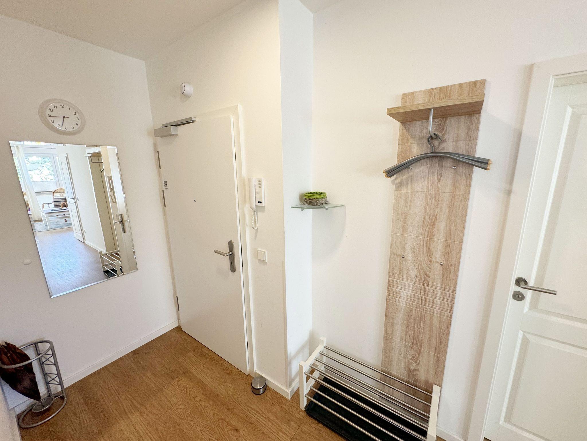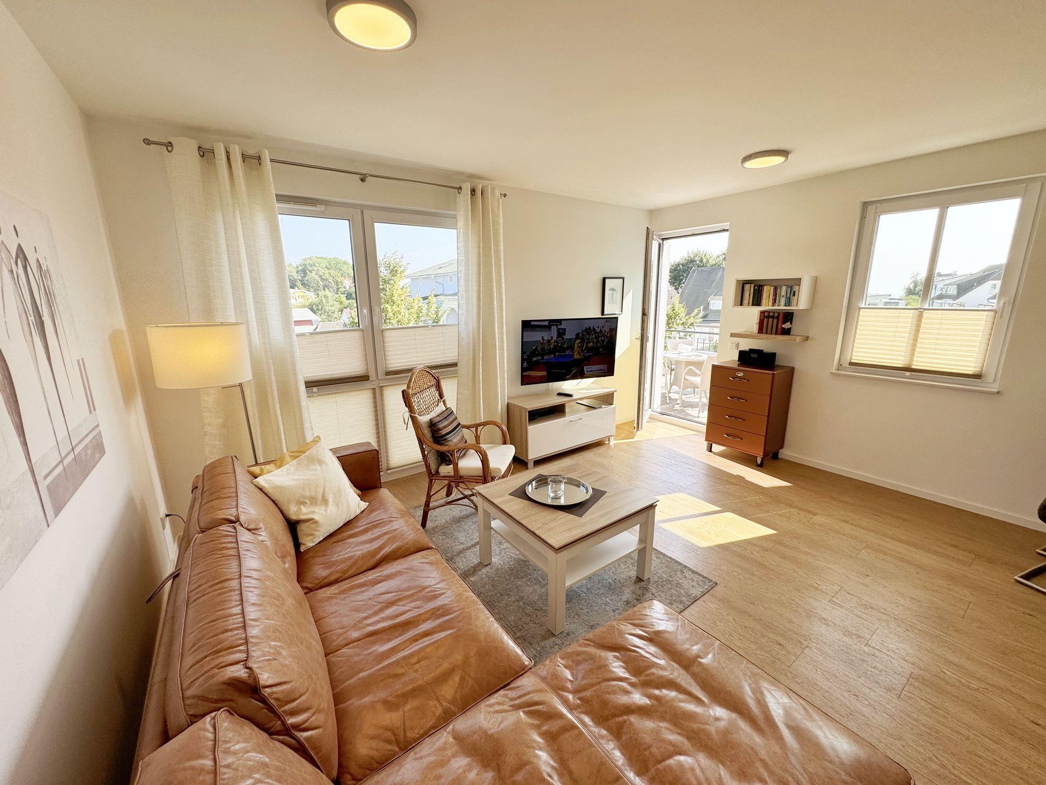 Die Wohnung Nr. 4 der Villa Anni ist eine komfortable, ca. 57 m² große und stilvoll eingerichtete Nichtraucherferienwohnung im ersten Obergeschoss. Sie bietet Ihnen ausreichend Platz für 2 bis 3 Personen. Der kombinierte Wohn-/Koch- und Essbereich mit der modernen und integrierten Küchenzeile lässt mit Ceranfeld, Backofen, Geschirrspüler, Mikrowelle, Kühlschrank mit Gefrierfach, Kaffeemaschine, Wasserkocher, Toaster und diversen Küchenutensilien keine Wünsche offen. Der Essbereich fügt sich der Küchenzeile an. Der offene Wohnbereich verfügt über eine gemütliche Sitzecke (Liegefläche 1,50m x 2,00m) mit Couchtisch, eine Leselampe, ein TV mit CD-Player, DAB-Radio und einen Blu-Ray Player. Auch auf einen Internetanschluss (WLAN) müssen Sie in Ihrem Urlaub nicht verzichten. Dieser ist für Sie inklusive! Eine Auswahl an Gesellschaftsspielen und Urlaubslektüre sorgt für eine gelungene Abwechslung. Der nach Nord/Osten mit Blick Richtung Meer ausgerichtete, und bestuhlte Balkon mit Sonnenschirm ist direkt vom Wohnbereich aus zu erreichen. Das Schlafzimmer verfügt über ein Boxspringbett mit Tonnentaschenfederkernmatratzen (1,80m x 2,00m), Nachttischablagen, Flachbild-TV und einen Kleiderschrank. Für einen ruhigen Schlaf sorgt eine Verdunklungsmöglichkeit sowie ein Insektenschutzgitter. Das Bad ist mit einer ebenerdigen Dusche, Waschplatz, Kosmetikspiegel, WC, Handtuchheizkörper und Fön ausgestattet. Im Schlafzimmer ist ein Insektenschutzgitter vorhanden. Alle Räumlichkeiten sind mit einer Fußbodenheizung versehen und sorgen für eine angenehme Wärme. Ein eigener PKW-Stellplatz (Nr. 4) befindet sich in der Tiefgarage (Einfahrtshöhe: 2,00 m) des Hauses. 1 kleiner Hund ist gegen eine Gebühr in der Wohnung erlaubt! Die Erstausstattung eines Wäschepaketes (komplette Bettwäsche, 1 Duschhandtuch, 2 kleine Handtücher) können Sie bis 14 Tage vor Anreise gegen einen Aufpreis dazu buchen oder durch eigene ergänzen. Ab 2 gebuchten Paketen erhalten Sie einmalig 1 Geschirrhandtuch und 1 Duschvorleger hinzu.