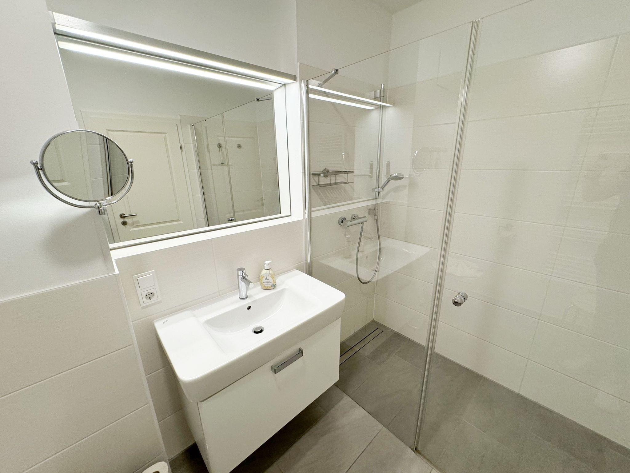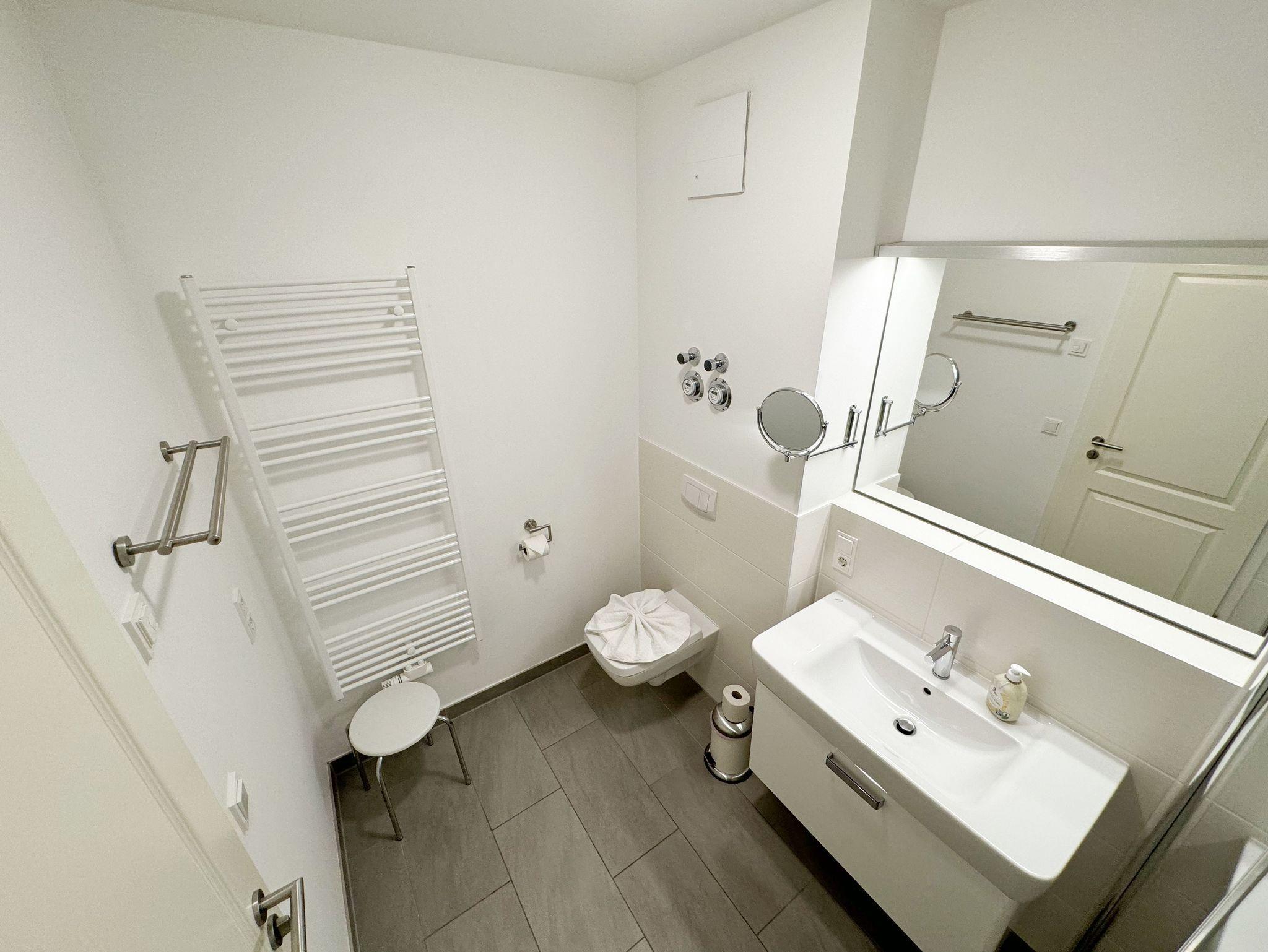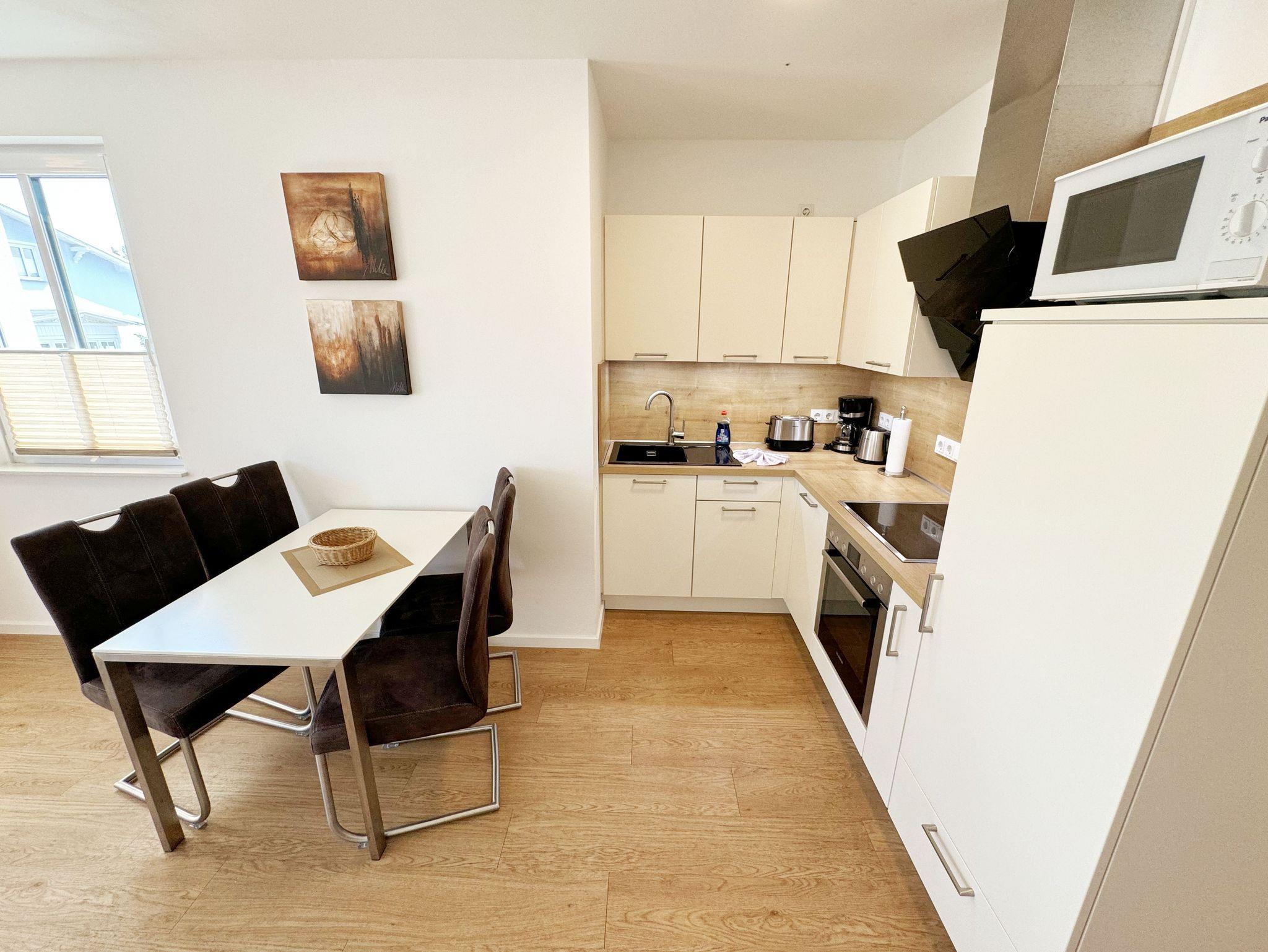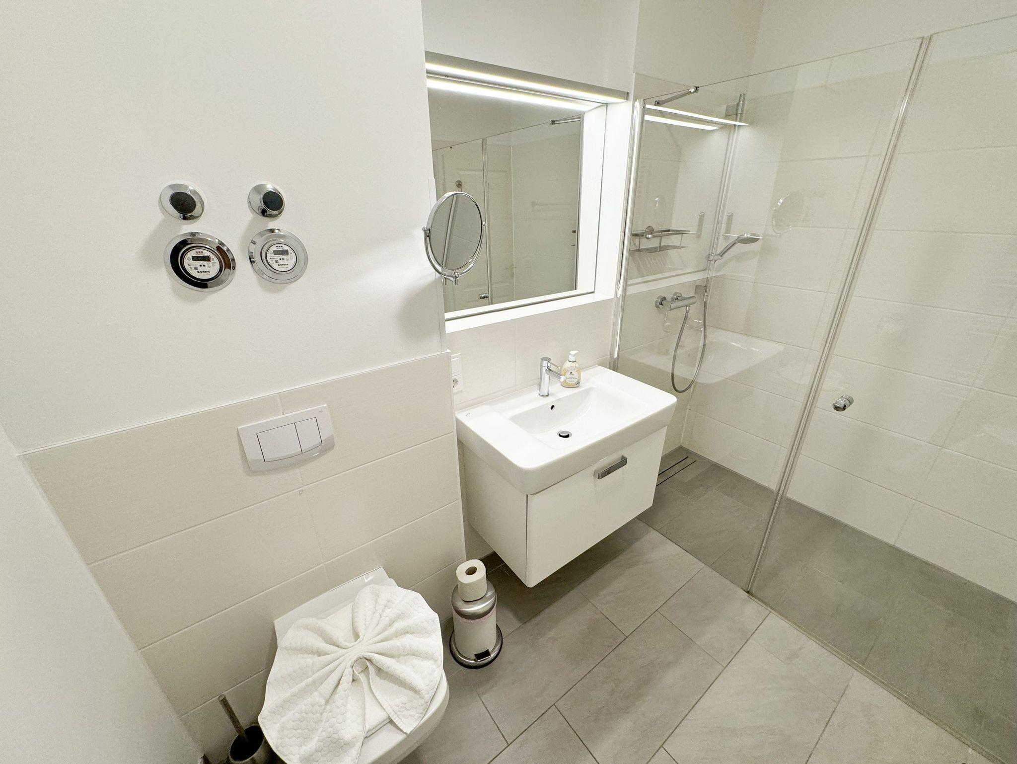 Die Wohnung Nr. 4 der Villa Anni ist eine komfortable, ca. 57 m² große und stilvoll eingerichtete Nichtraucherferienwohnung im ersten Obergeschoss. Sie bietet Ihnen ausreichend Platz für 2 bis 3 Personen. Der kombinierte Wohn-/Koch- und Essbereich mit der modernen und integrierten Küchenzeile lässt mit Ceranfeld, Backofen, Geschirrspüler, Mikrowelle, Kühlschrank mit Gefrierfach, Kaffeemaschine, Wasserkocher, Toaster und diversen Küchenutensilien keine Wünsche offen. Der Essbereich fügt sich der Küchenzeile an. Der offene Wohnbereich verfügt über eine gemütliche Sitzecke (Liegefläche 1,50m x 2,00m) mit Couchtisch, eine Leselampe, ein TV mit CD-Player, DAB-Radio und einen Blu-Ray Player. Auch auf einen Internetanschluss (WLAN) müssen Sie in Ihrem Urlaub nicht verzichten. Dieser ist für Sie inklusive! Eine Auswahl an Gesellschaftsspielen und Urlaubslektüre sorgt für eine gelungene Abwechslung. Der nach Nord/Osten mit Blick Richtung Meer ausgerichtete, und bestuhlte Balkon mit Sonnenschirm ist direkt vom Wohnbereich aus zu erreichen. Das Schlafzimmer verfügt über ein Boxspringbett mit Tonnentaschenfederkernmatratzen (1,80m x 2,00m), Nachttischablagen, Flachbild-TV und einen Kleiderschrank. Für einen ruhigen Schlaf sorgt eine Verdunklungsmöglichkeit sowie ein Insektenschutzgitter. Das Bad ist mit einer ebenerdigen Dusche, Waschplatz, Kosmetikspiegel, WC, Handtuchheizkörper und Fön ausgestattet. Im Schlafzimmer ist ein Insektenschutzgitter vorhanden. Alle Räumlichkeiten sind mit einer Fußbodenheizung versehen und sorgen für eine angenehme Wärme. Ein eigener PKW-Stellplatz (Nr. 4) befindet sich in der Tiefgarage (Einfahrtshöhe: 2,00 m) des Hauses. 1 kleiner Hund ist gegen eine Gebühr in der Wohnung erlaubt! Die Erstausstattung eines Wäschepaketes (komplette Bettwäsche, 1 Duschhandtuch, 2 kleine Handtücher) können Sie bis 14 Tage vor Anreise gegen einen Aufpreis dazu buchen oder durch eigene ergänzen. Ab 2 gebuchten Paketen erhalten Sie einmalig 1 Geschirrhandtuch und 1 Duschvorleger hinzu.