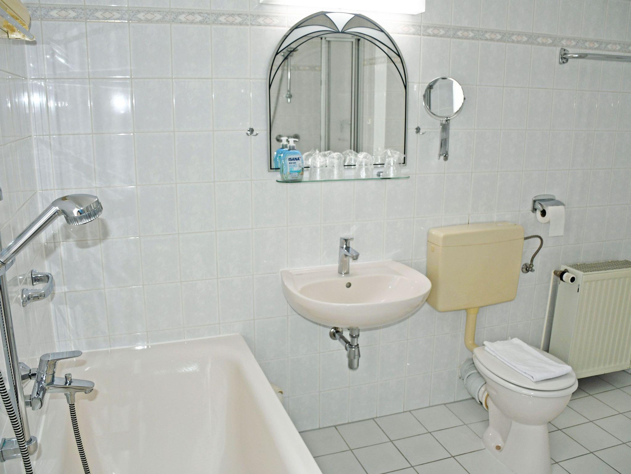 * 1 Bad mit Dusche, Badewanne, WC, 1 Waschbecken, 1 Spiegel (mit Fenster)
