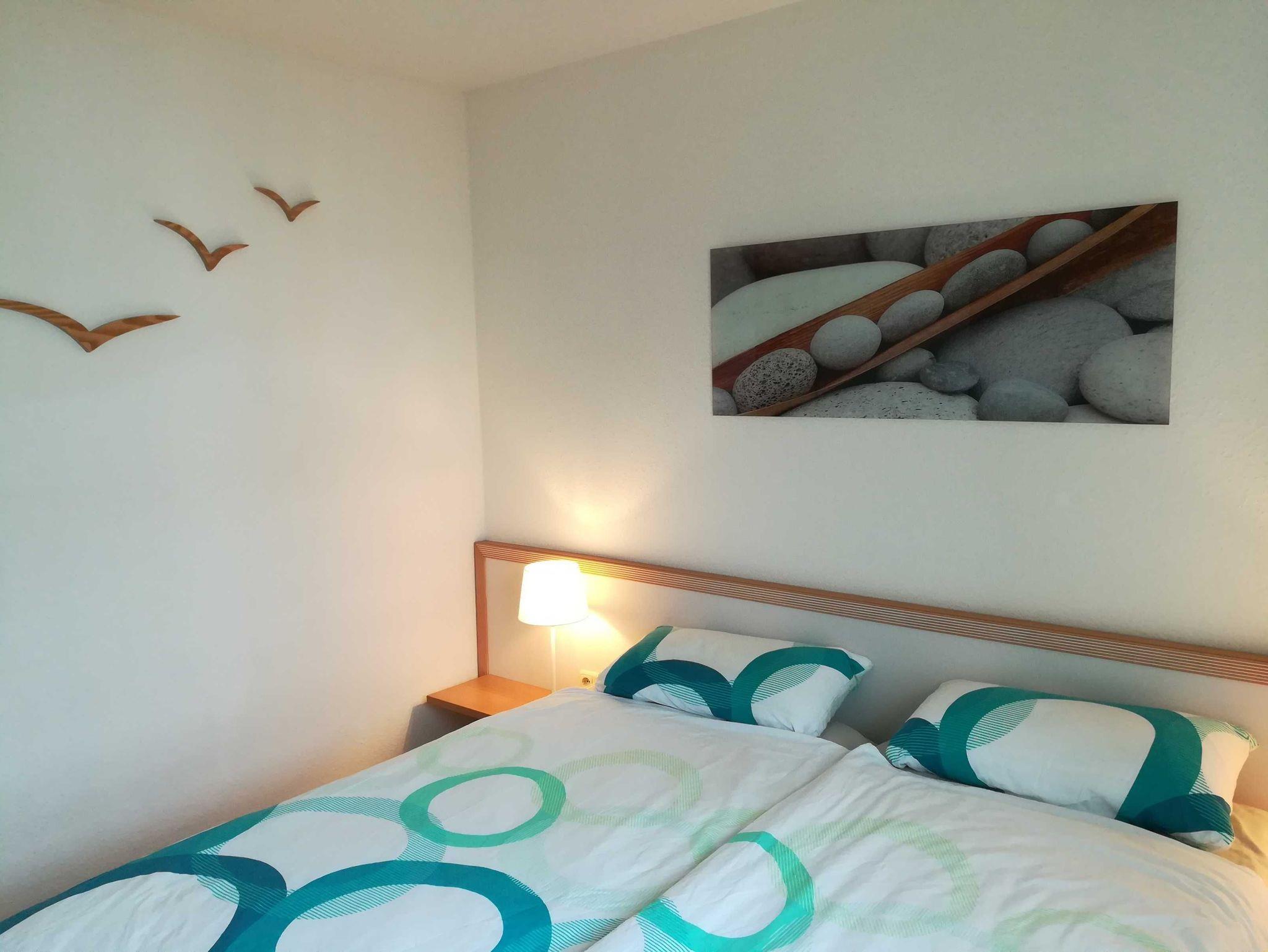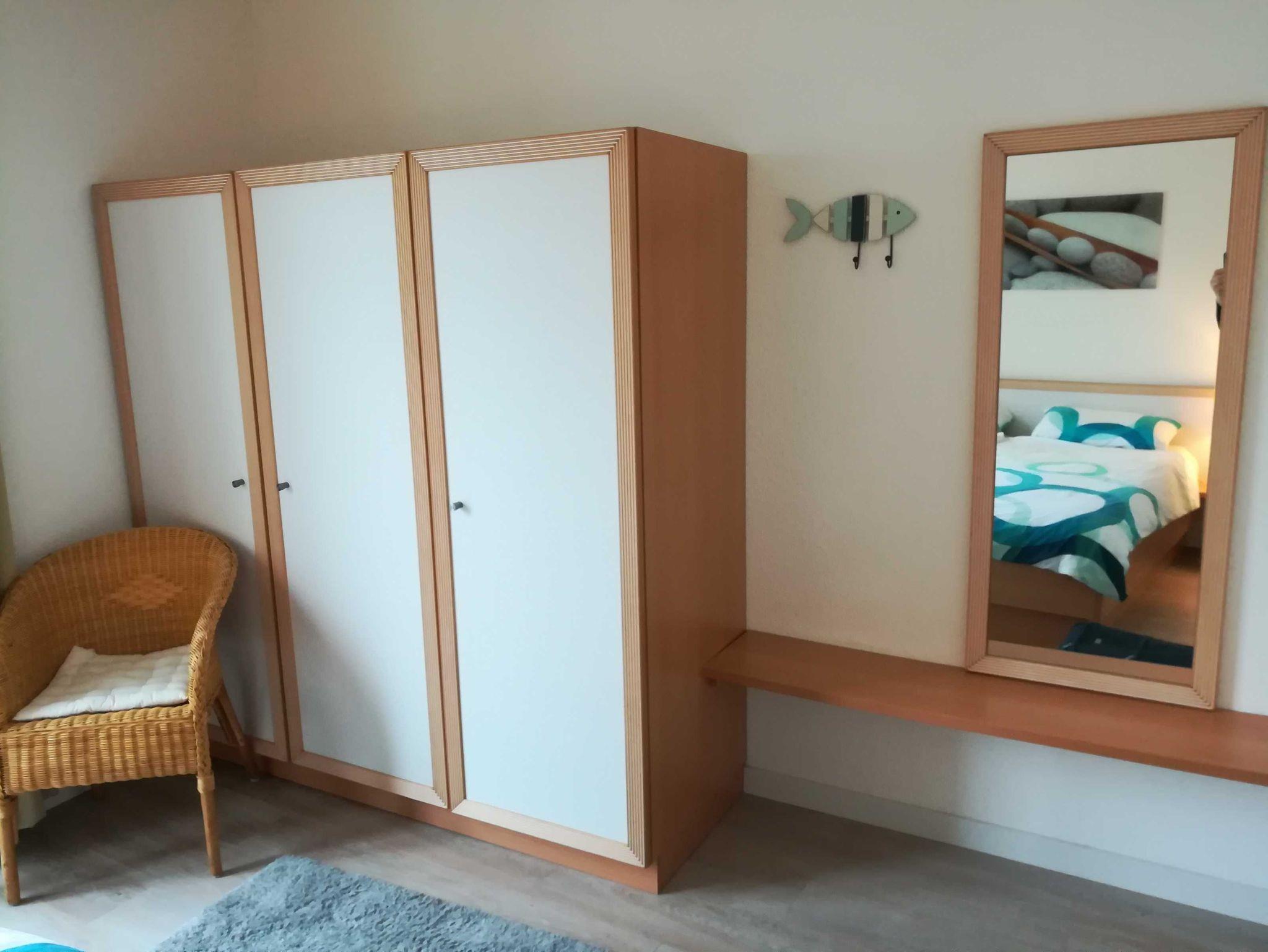 In dem freundlich, geräumigen Schlafzimmer befindet sich ein Doppelbett mit getrennten Matratzen, ein Kleiderschrank sowie ein Ankleidespiegel mit Ablage.