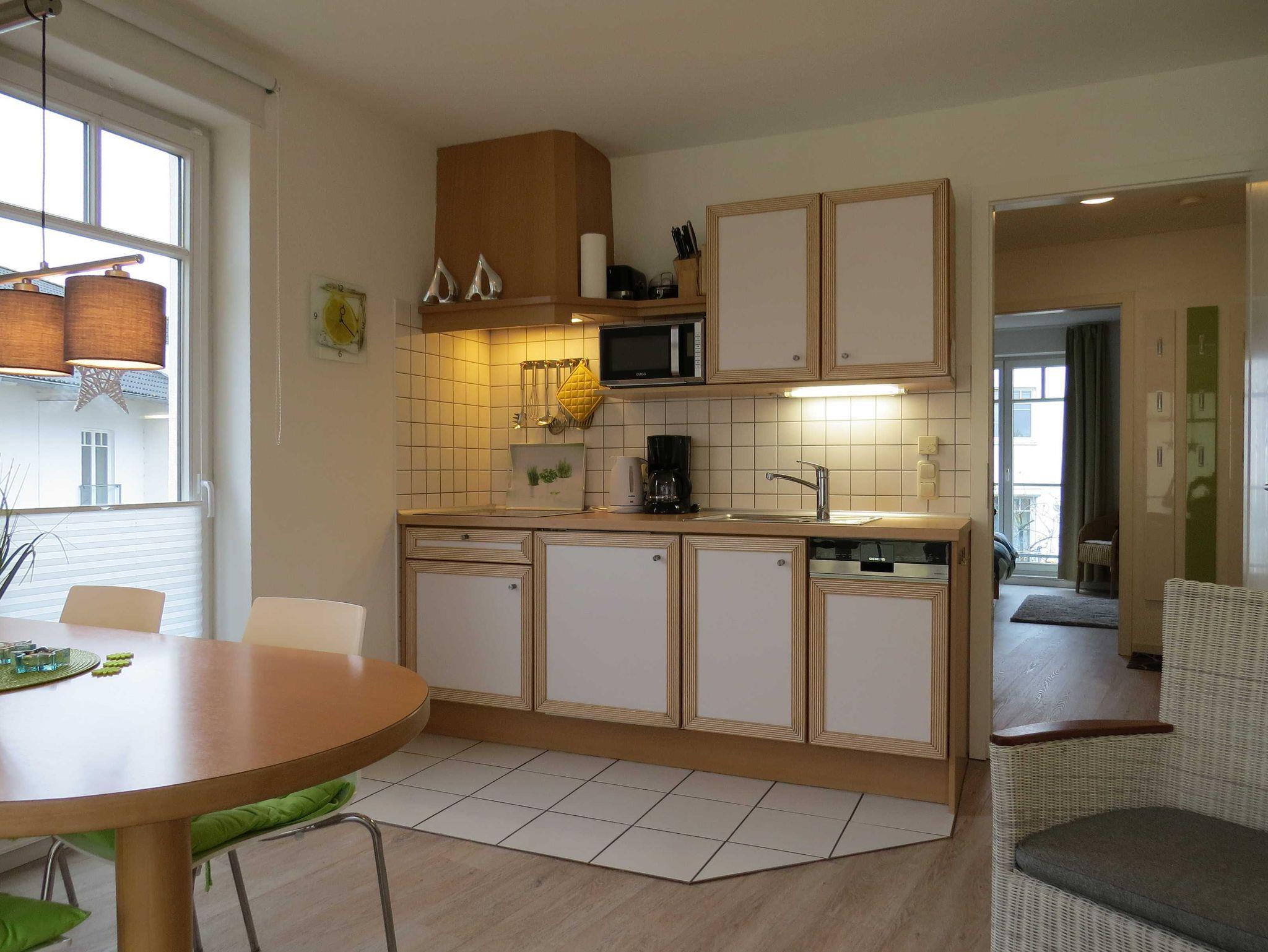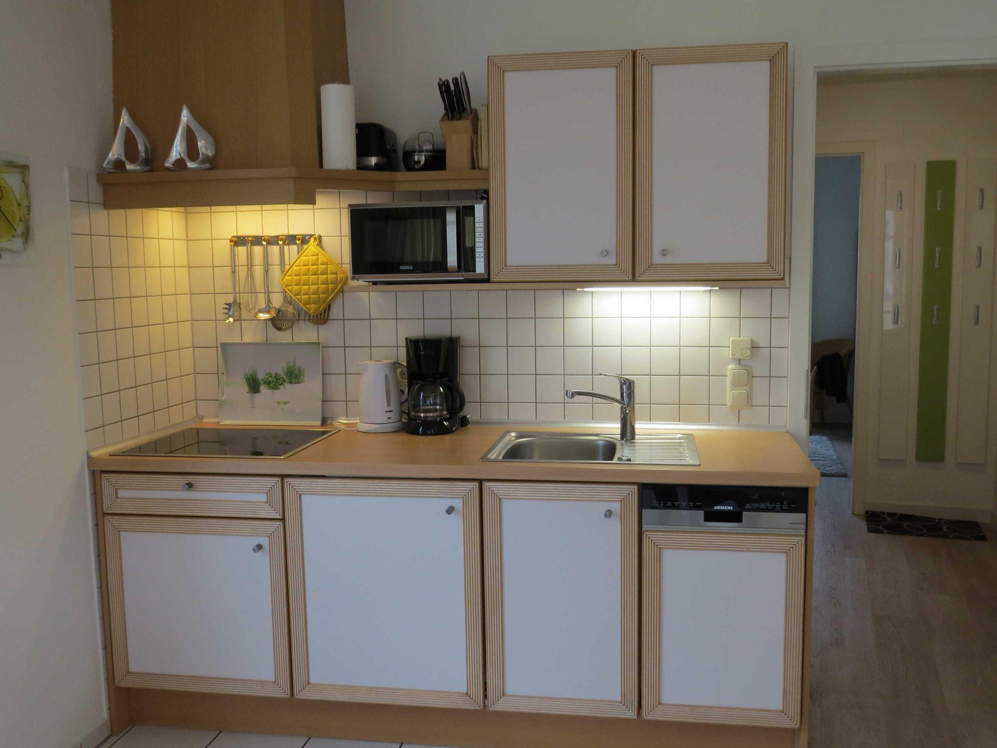 Der offene Wohn-Essbereich mit hochwertig komfortablen Sitz- und ausklappbarem Schlafsofa (1,60m x 2,00 m) plus Kleiderschrank verfügt über eine komplett ausgestattete Küchenzeile (Spülmaschine Ceranfeld, Wasserkocher, Kaffeemaschine, Eierkocher, Toaster, Mikrowelle) mit Tisch und 4 Stühlen. Außerdem ist ein Flachbildschirm, Radio/CD Player und kostenfreies W-LAN vorhanden.