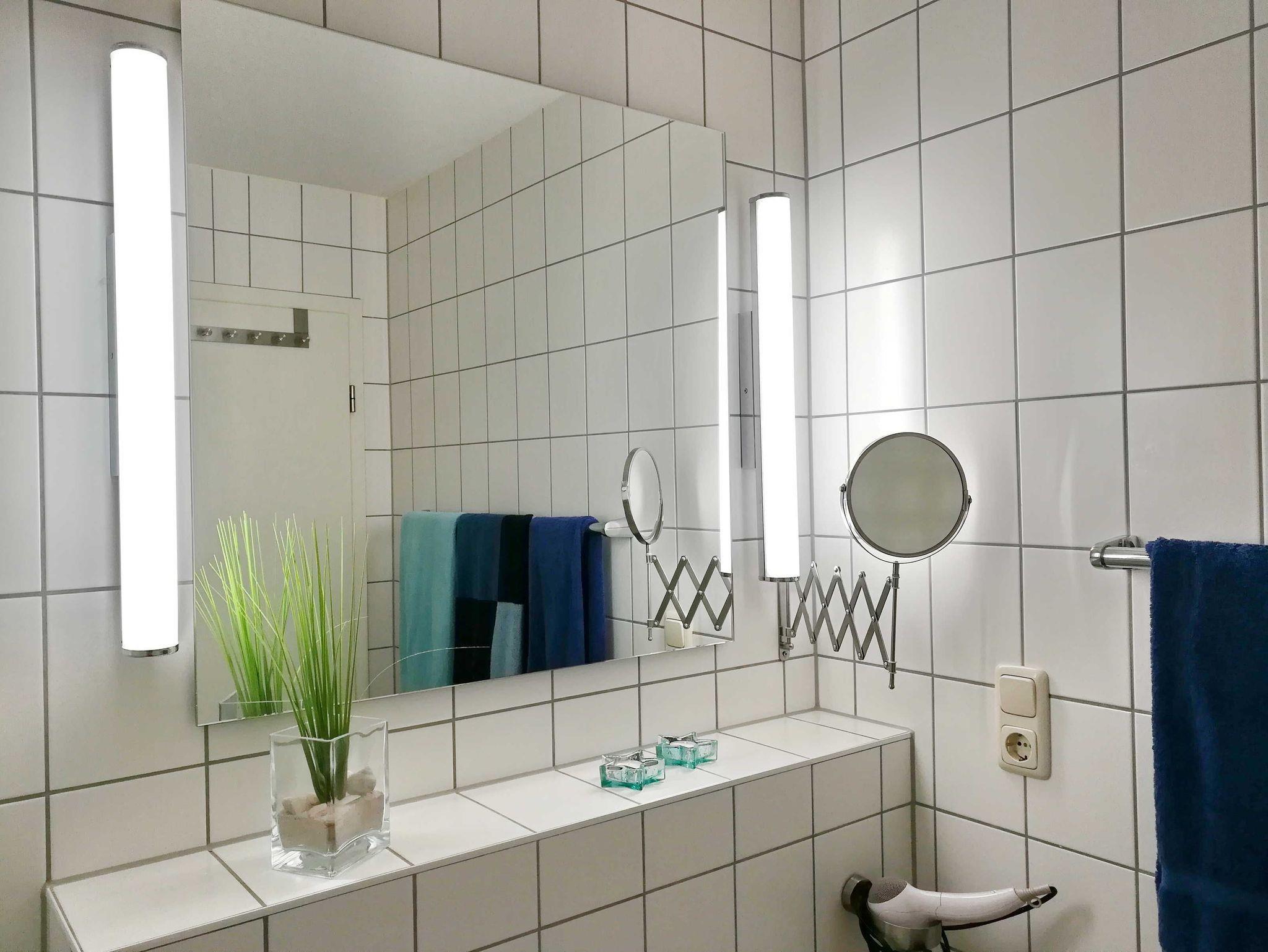 Das hell geflieste Bad ist zweckmäßig mit Dusche und WC, Waschbecken, Kosmetikspiegel, Fön sowie Ablagen ausgestattet.