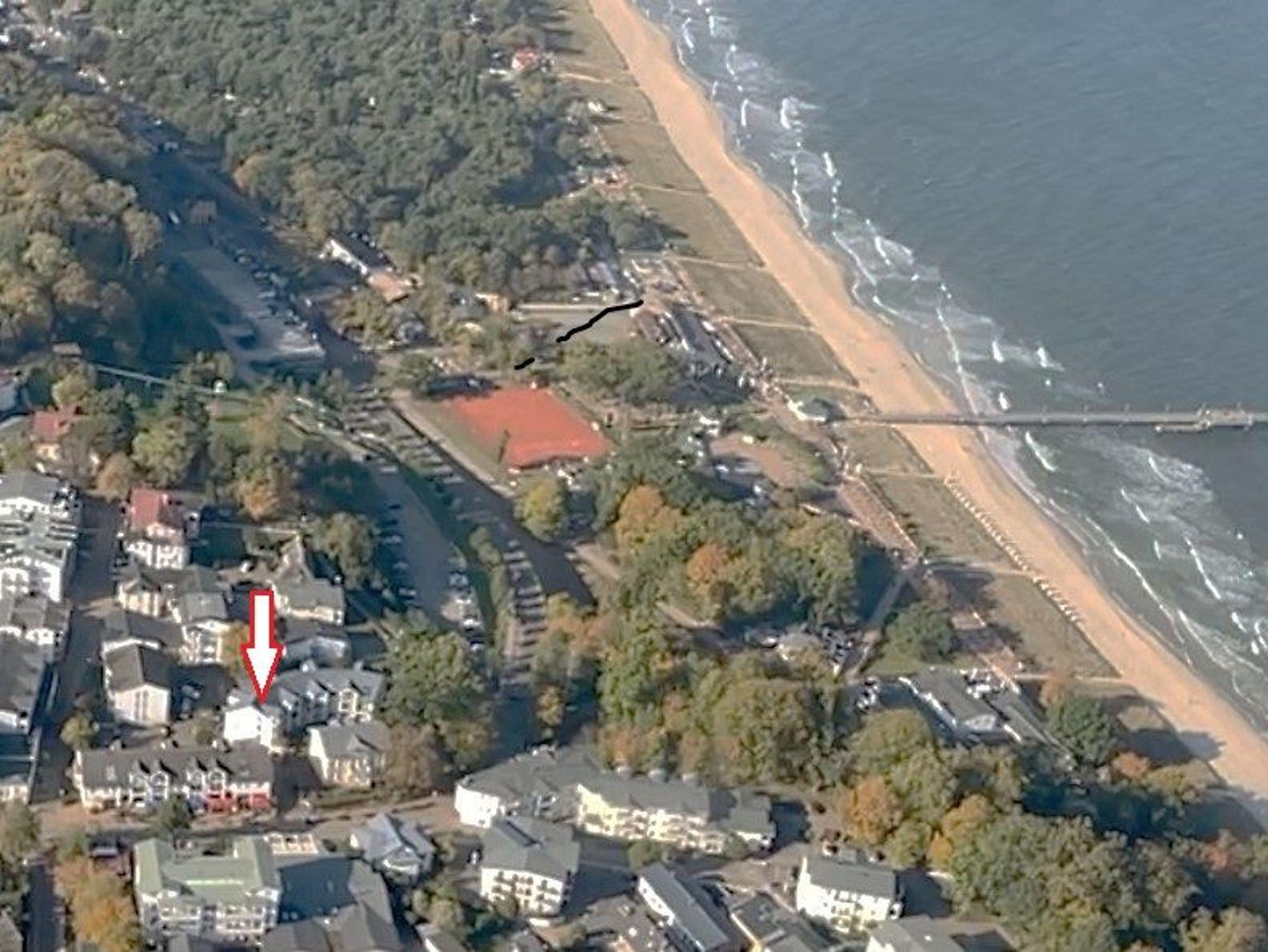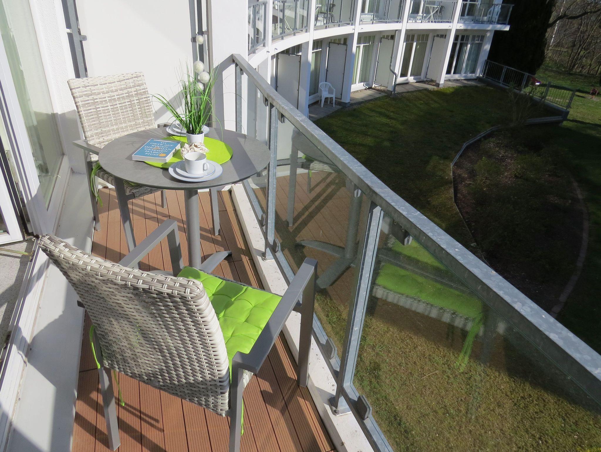 Hier blicken Sie ins Grüne der großzügigen Gartenanlage und auf die Waldpromenade; wenn die Bäume schwach belaubt sind, sogar bis auf die rauschende Ostsee.