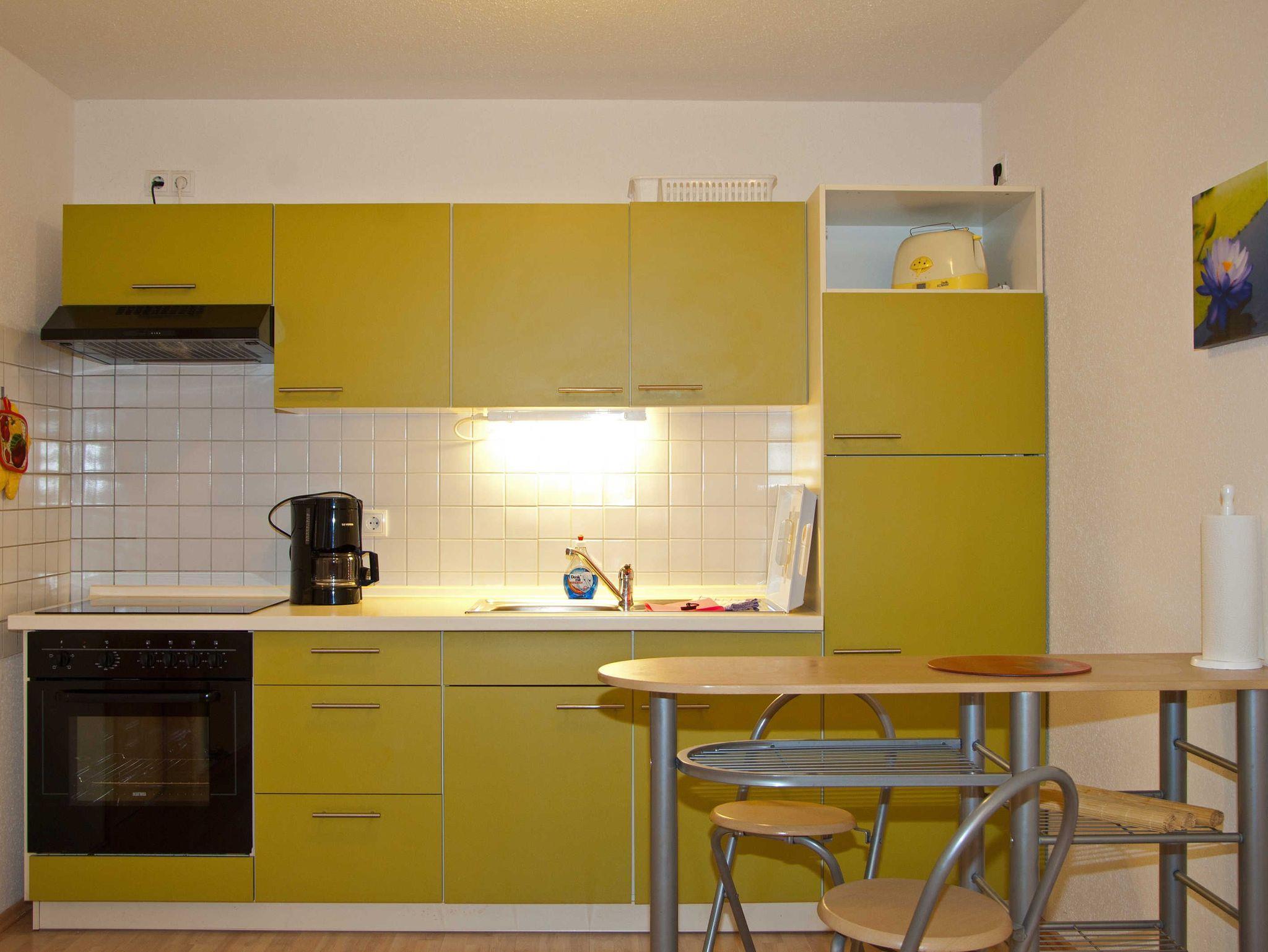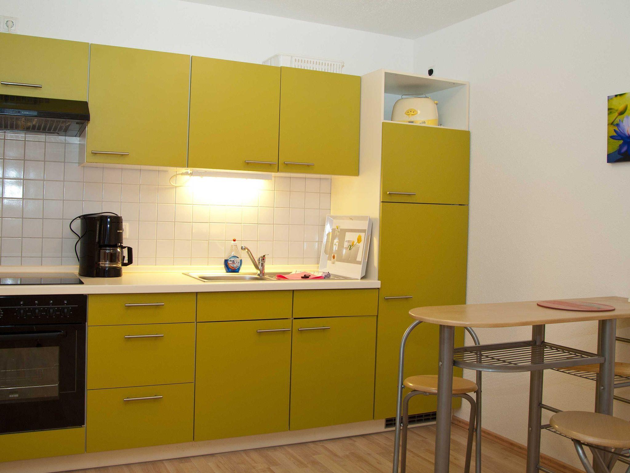 - moderne Küchenzeile, Backofen, Herd mit Abzugshaube, Kühlschrank,