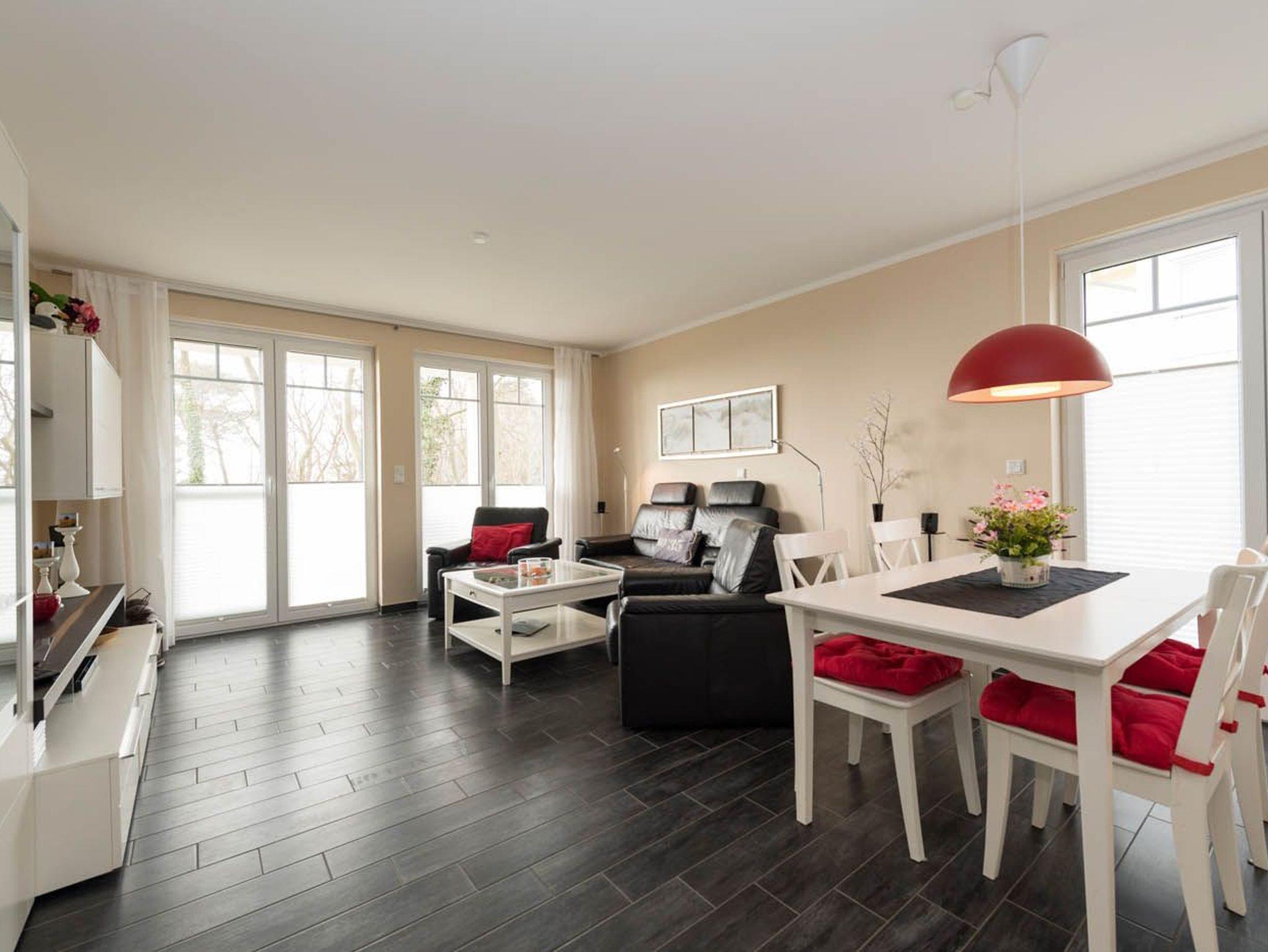 Unsere hellen und modern eingerichteten 3-Raum-Ferienwohnungen liegen im Erdgeschoss und sind wie folgt ausgestattet:
