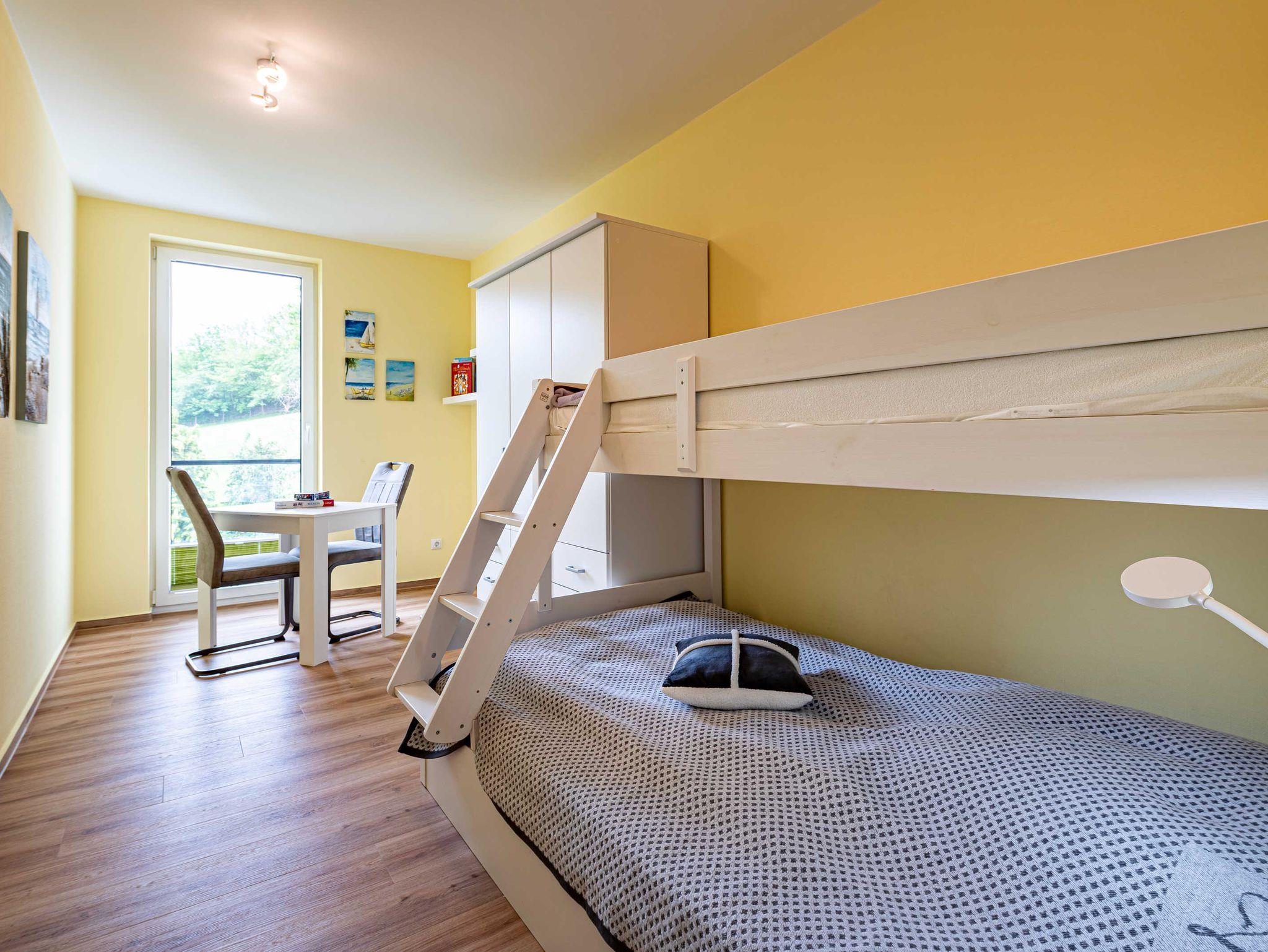 Schlafen 2: Doppelstockbett (unten 1,20 x 2,00 m oben 0,80 x 2,00 m) Verdunklungsmöglichkeit,