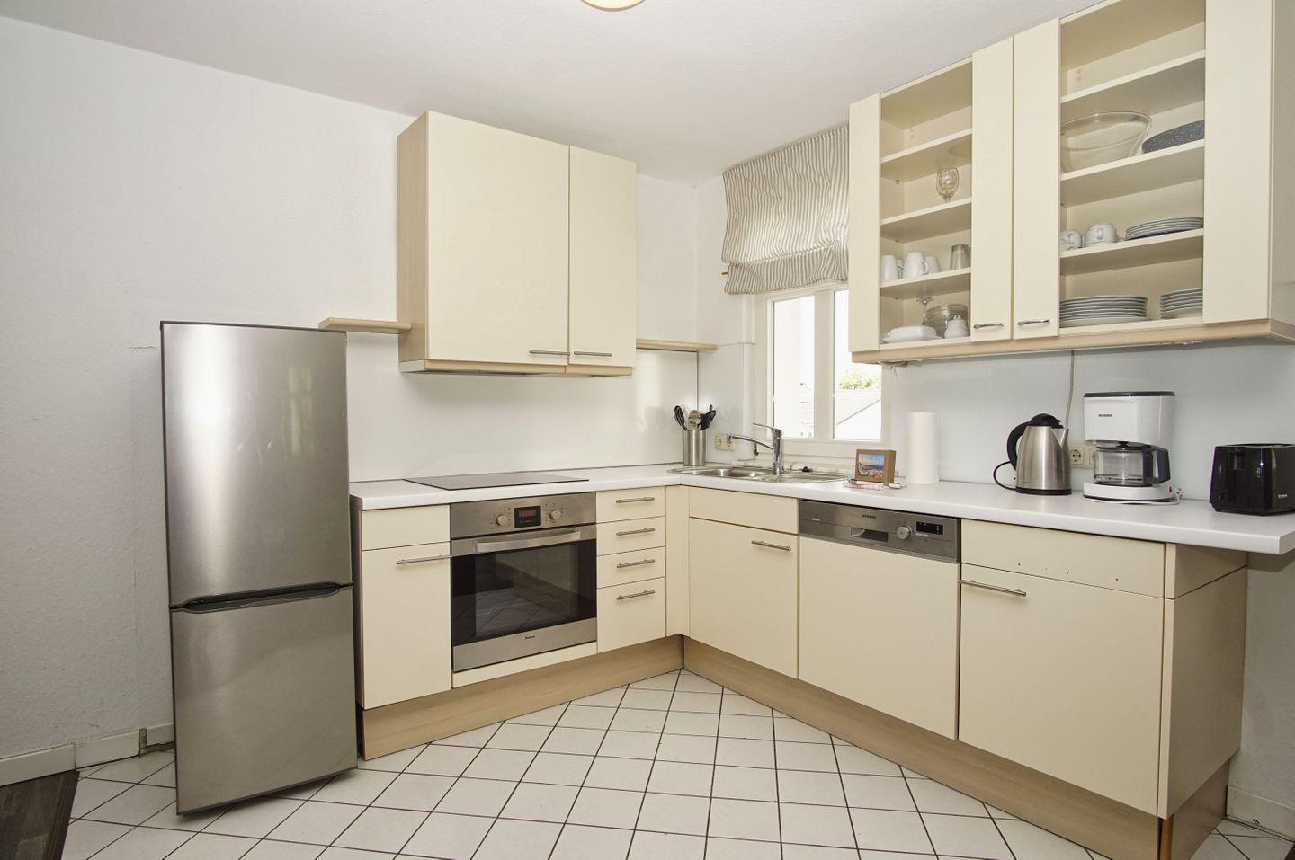 KÜCHE // Küchenzeile, 4-Platten Herd, Spülmaschine, Kühlschrank mit Gefrierfach, Backofen, Toaster, Wasserkocher, Kaffeemaschine, reichlich Besteck, Geschirr und Küchenutensilien ++