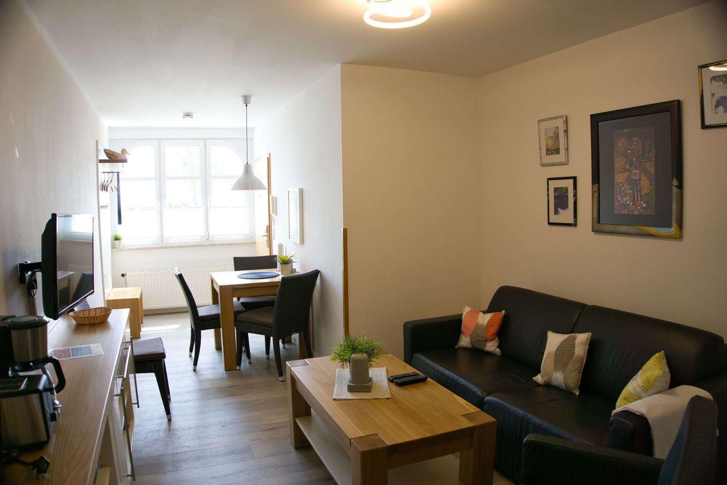 WOHNEN // Wohnraum mit Essbereich, Esstisch mit 4 Stühlen, Sitzgarnitur, Couch mit Schlaffunktion, Kabel-TV, Radio, CD-Player ++