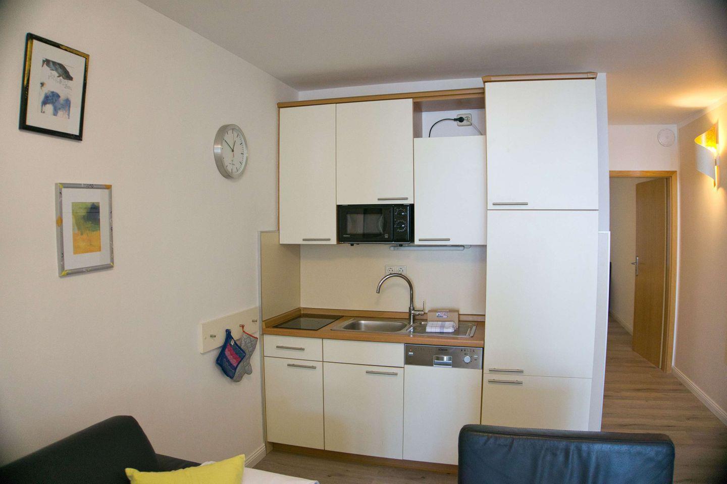 KÜCHE // Küchenzeile, 2-Feld Ceranherd, Kühlschrank mit Gefrierfach, Geschirrspüler, Toaster, Wasserkocher, Kaffeemaschine, reichlich Besteck, Geschirr und Küchenutensilien ++