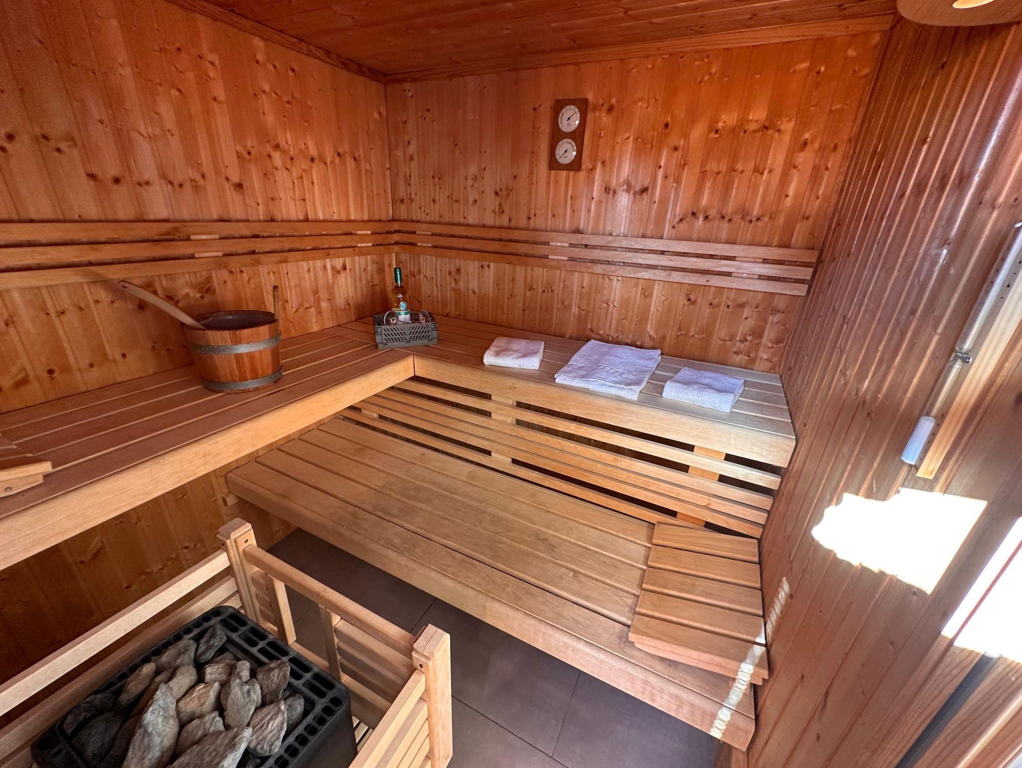 eine Badewanne und über eine Sauna. Alle Räume werden über eine Fußbodenheizung beheizt.