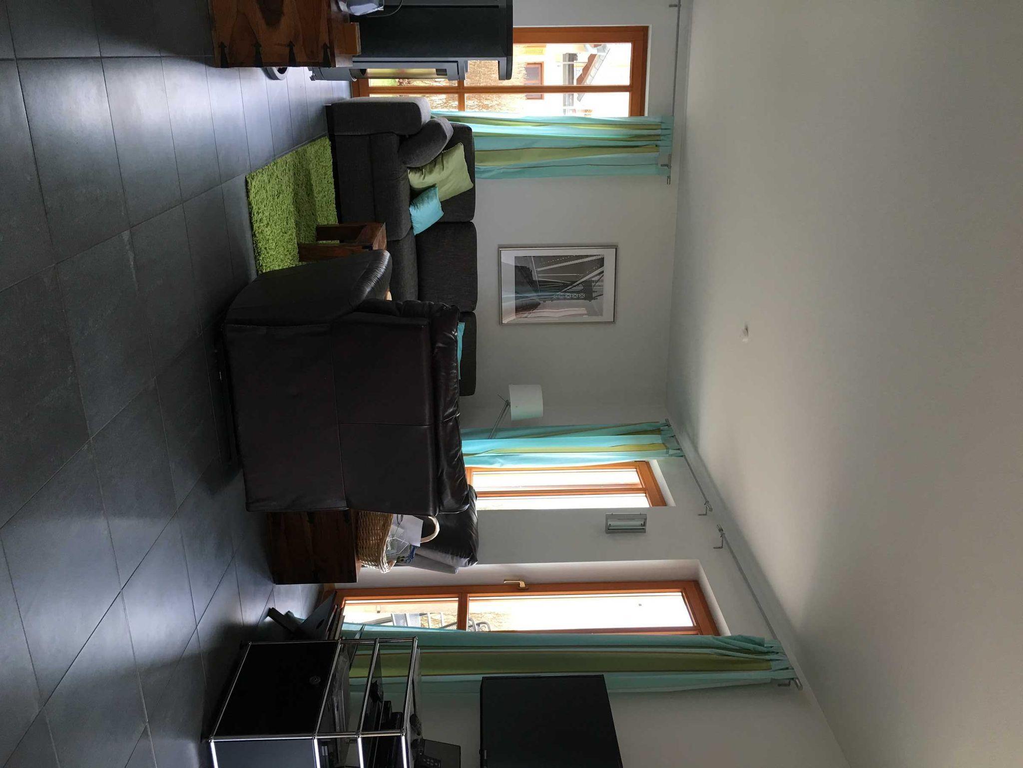 Ein großer, lichtdurchfluteter Wohn-Eßbereich mit Kaminofen und Eßtisch für bis zu 6 Personen lädt zum Verweilen ein. Direkt vom Wohnbereich aus gelangen Sie auf die Terrasse.