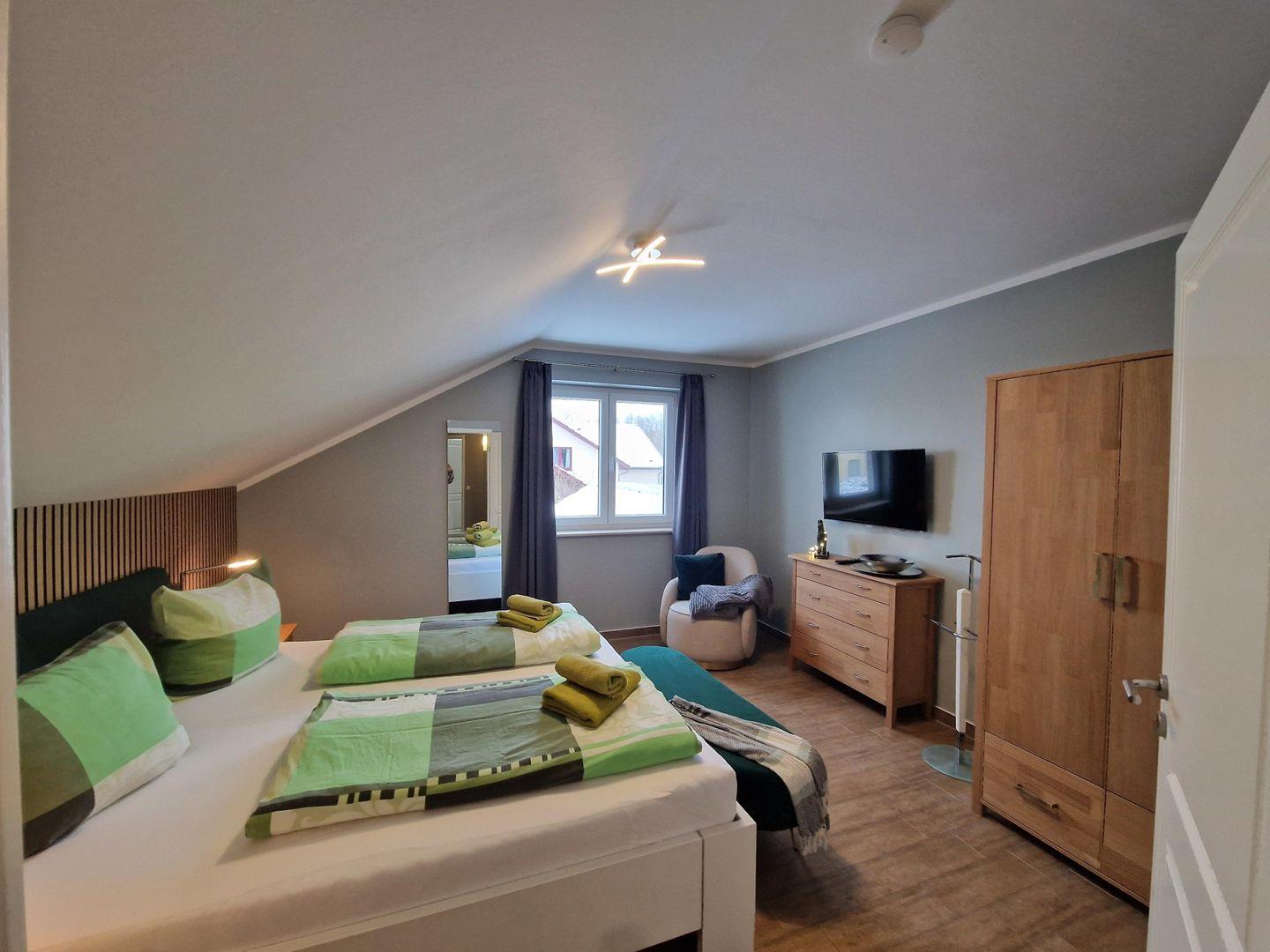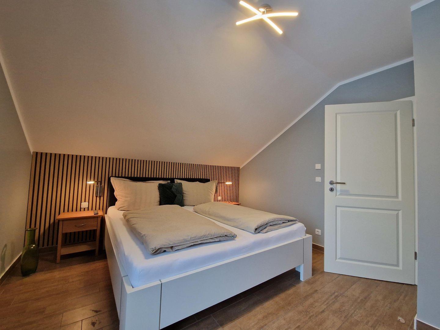 Im Obergeschoss befinden sich 2 weitere Schlafzimmer mit 180x200 King Boxspringbetten sowie ein großer Kleiderschrank und ein TV. Das großzügige Badezimmer mit integrierter Sauna, bietet Ihnen Entspannung auf Knopfdruck.