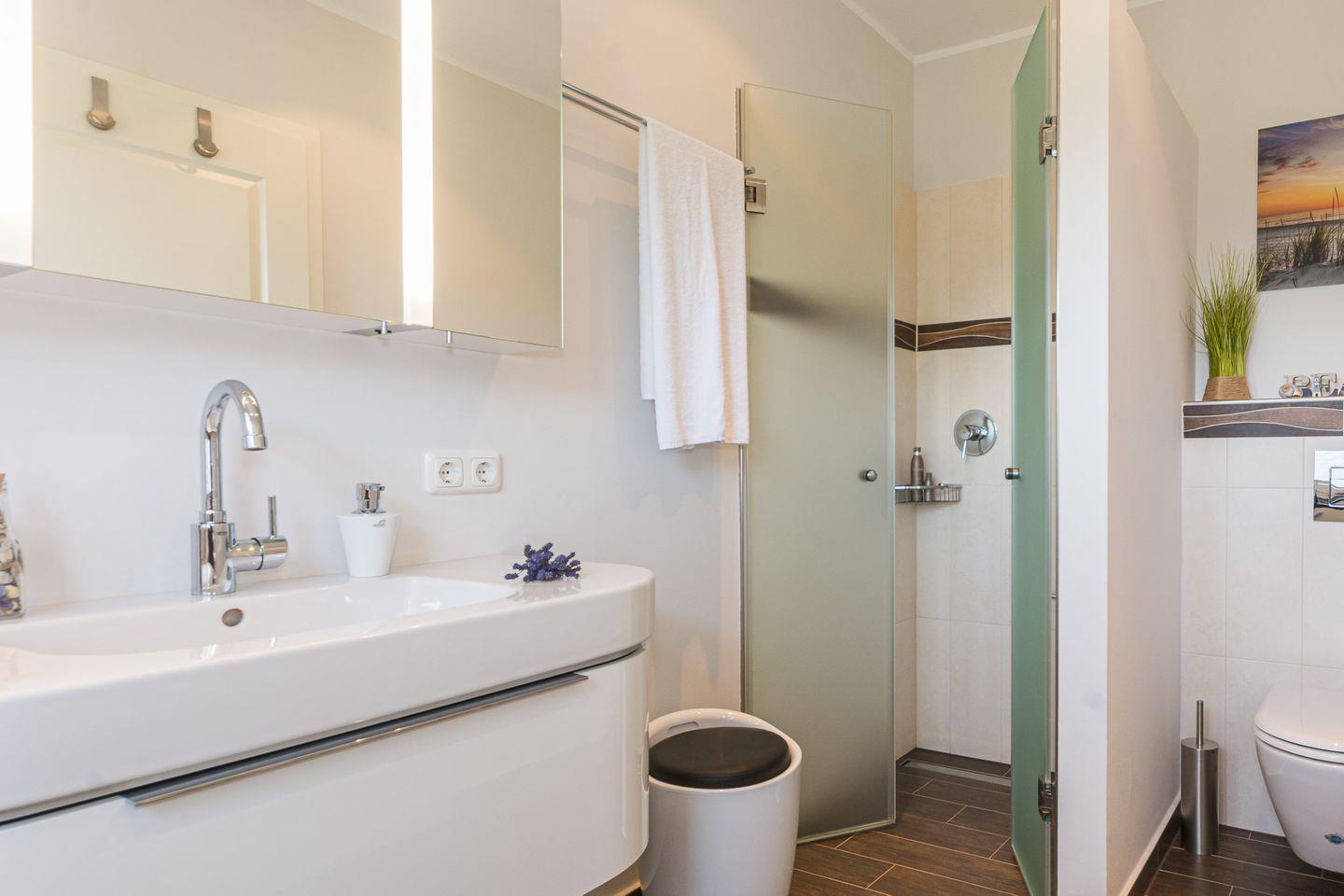 Das moderne Tageslichtbad bietet eine bodengleiche Dusche, einen Handtuchwärmer, ein Waschbecken mit beleuchtetem Spiegelschrank sowie WC. Eine Fußbodenheizung sorgt für zusätzlichen Komfort.