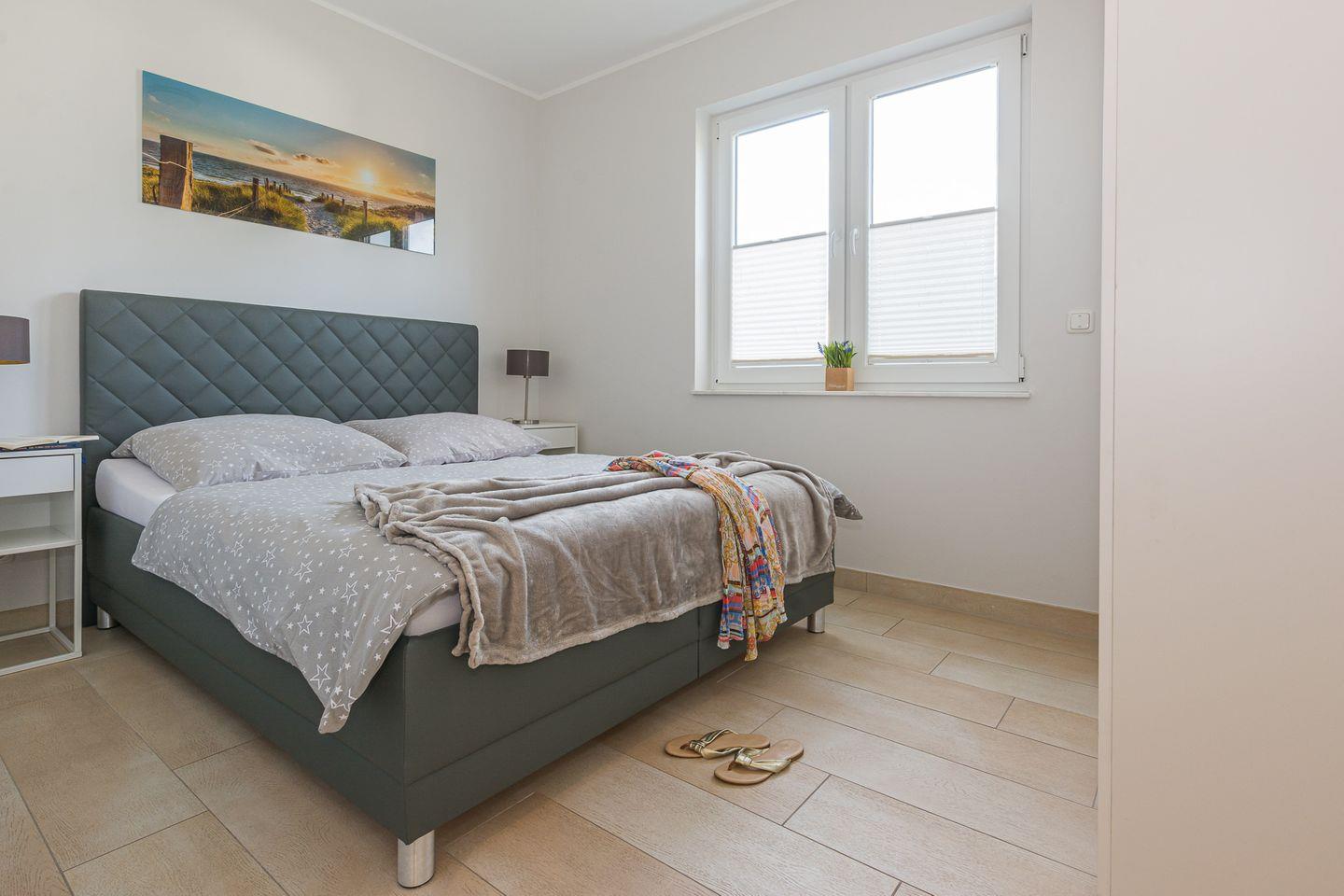 Beide Schlafzimmer sind mit hochwertigen Polster-Doppelbetten (jeweils 160 × 200 cm, durchgängige Matratzen) ausgestattet. Zudem verfügen sie über Rollläden und Insektenschutz an den Fenstern.
