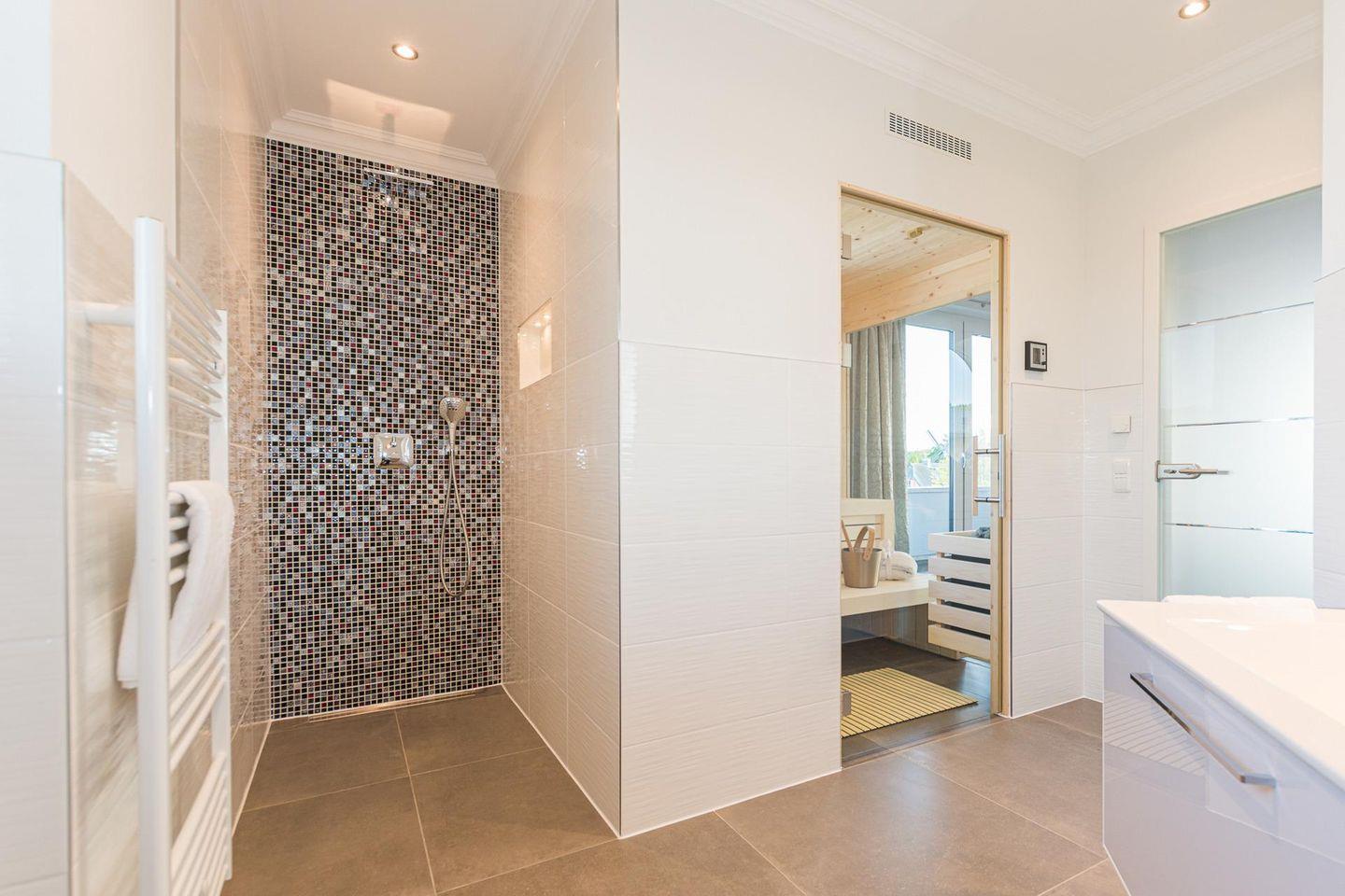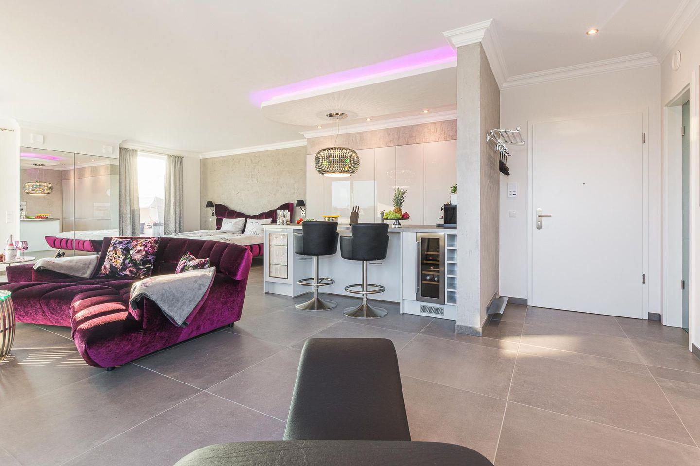 Das Apartment Dolce Vita im Obergeschoss vereint modernes Design mit luxuriösem Komfort und besticht durch Ihre hochwertige Ausstattung. Gönnen Sie sich ganz private Wellnessmomente in der Sauna, die ans Badezimmer anschließt, im Innen-Whirlpool oder vor dem Gaskamin. Der offene Wohn- und Schlafbereich ist mit stilvollen Möbeln, bequemer Couchgarnitur, großen Flachbild-TV und Design-Elementen ausgestattet, die eine perfekte Balance zwischen Eleganz und Gemütlichkeit schaffen. Die voll ausgestattete Küche bietet modernste Geräte wie Induktionsherd, Backofen, Mikrowelle, Spülmaschine und Kühlschrank mit Gefrierfach. Hier wird Kochen zum Vergnügen. Die Fußbodenheizung in der gesamten Wohnung sorgt für wohlige Wärme. Große Panoramafenster schaffen lichtdurchflutete Räume. Genießen Sie die frische Luft und den Ausblick auf der großzügigen Terrasse, die mit Sitzgelegenheiten und einem Grill, ausgestattet ist. WLAN und ein kostenfreier PKW-Stellplatz mit Ladestation für E- Autos steht Ihnen selbstverständlich zur Verfügung.
