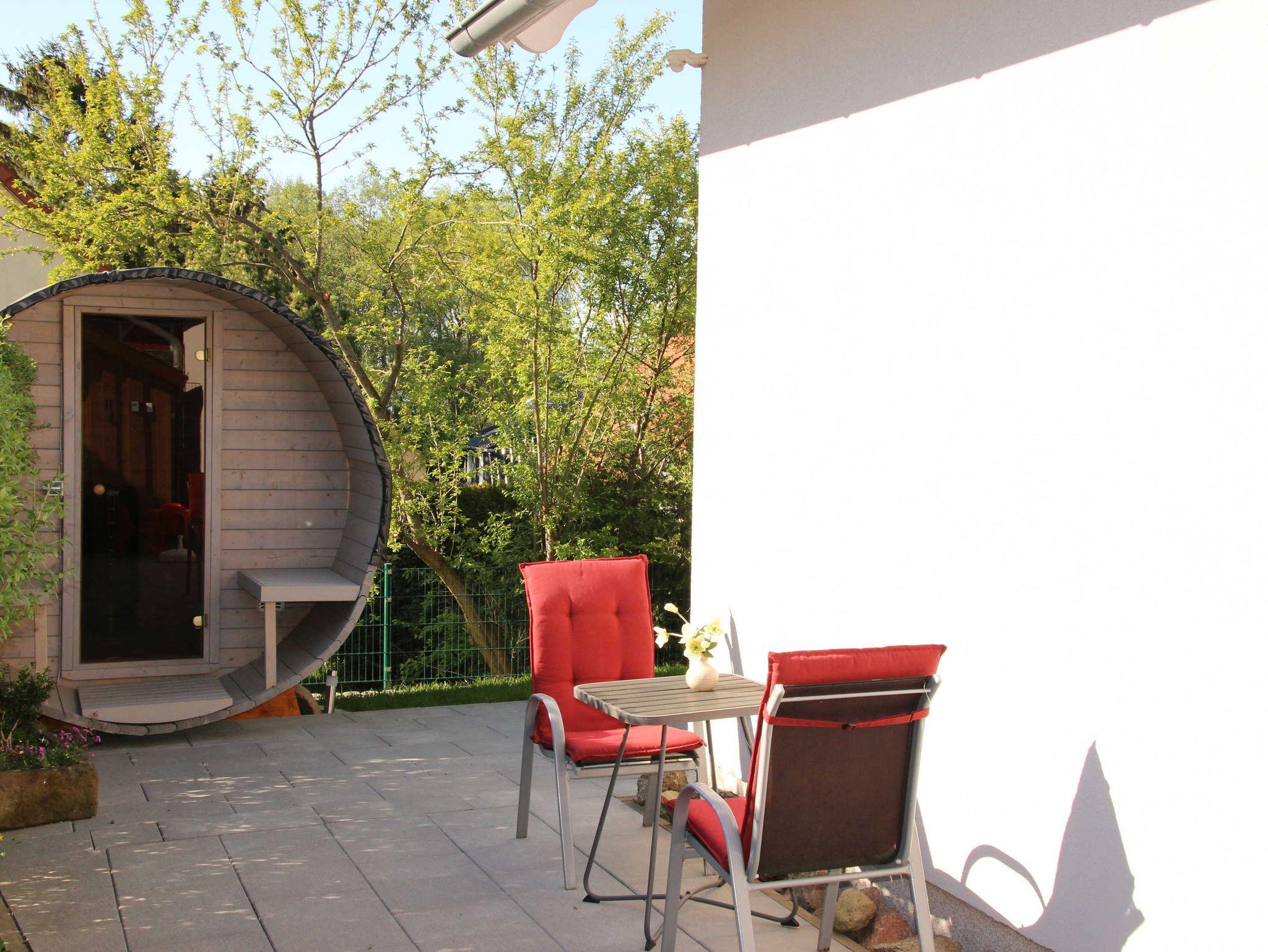 Im Gartenhaus stehen Terrassenmöbel, Grill und zwei Fahrräder. Eine gemütliche Fasssauna steht unseren Gästen im Garten zur Verfügung.