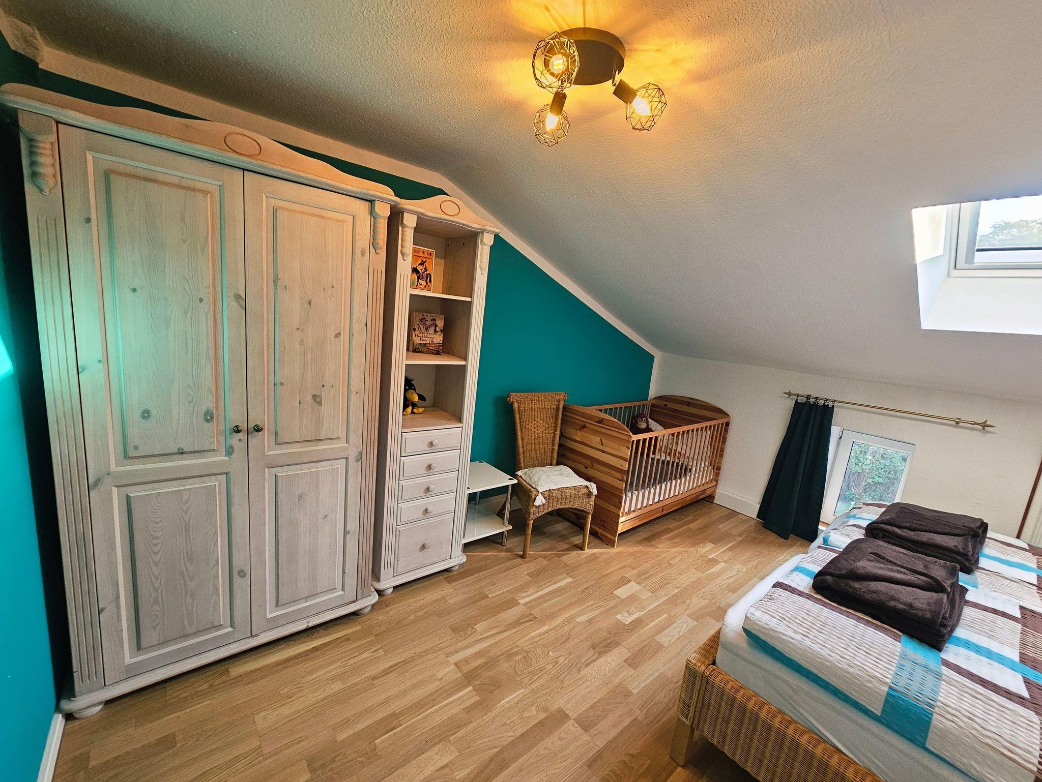 - türkises Zimmer mit 1 Doppelbett (180x200cm) & 1 Babygitterbett (70x140cm, bis 3 Jahre)