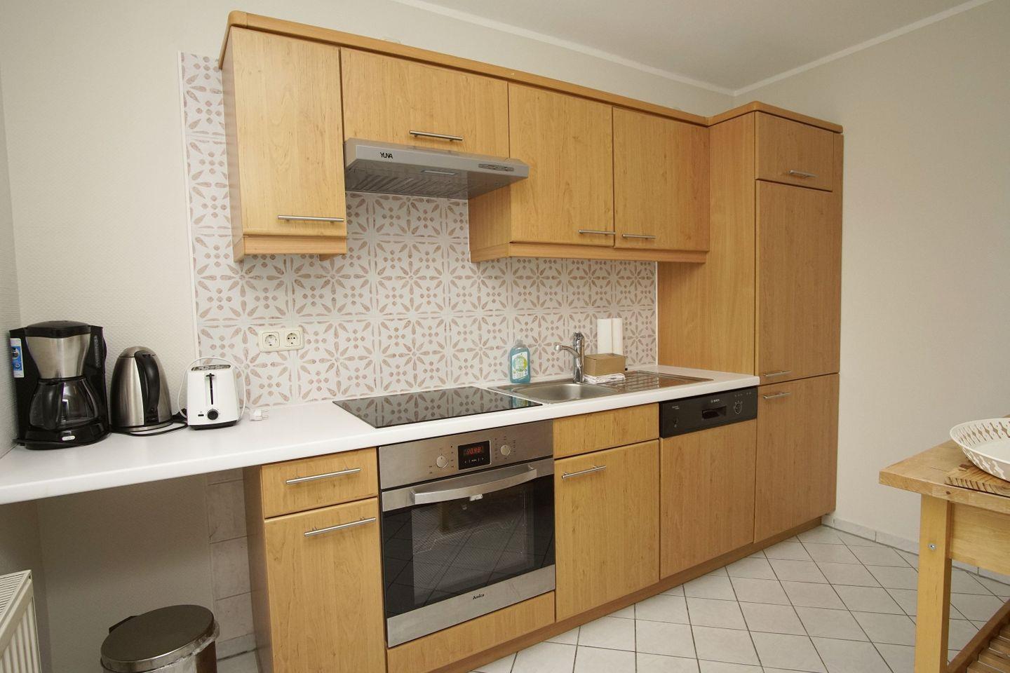 KÜCHE // separate Küche, 4-Platten Herd, Spülmaschine, Kühlschrank mit Gefrierfach, Backofen, Toaster, Wasserkocher, Kaffeemaschine, reichlich Besteck, Geschirr und Küchenutensilien ++