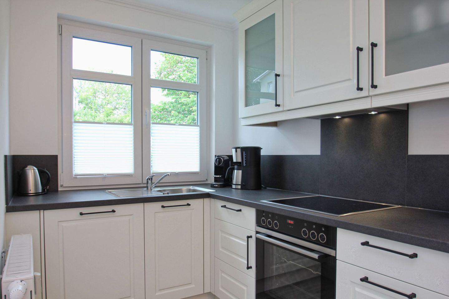 KÜCHE // Küchenzeile, 4-Platten Herd, Spülmaschine, Kühlschrank mit Gefrierfach, Backofen, Toaster, Wasserkocher, Kaffeemaschine, reichlich Besteck, Geschirr und Küchenutensilien ++