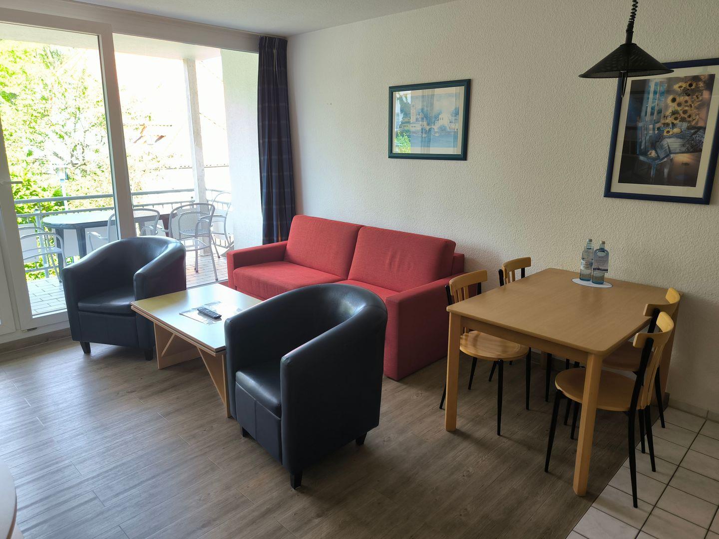 Wohnbereich mit moderner Wohnlandschaft, Couchtisch, TV mit Radio und Esstisch mit 4 Stühlen