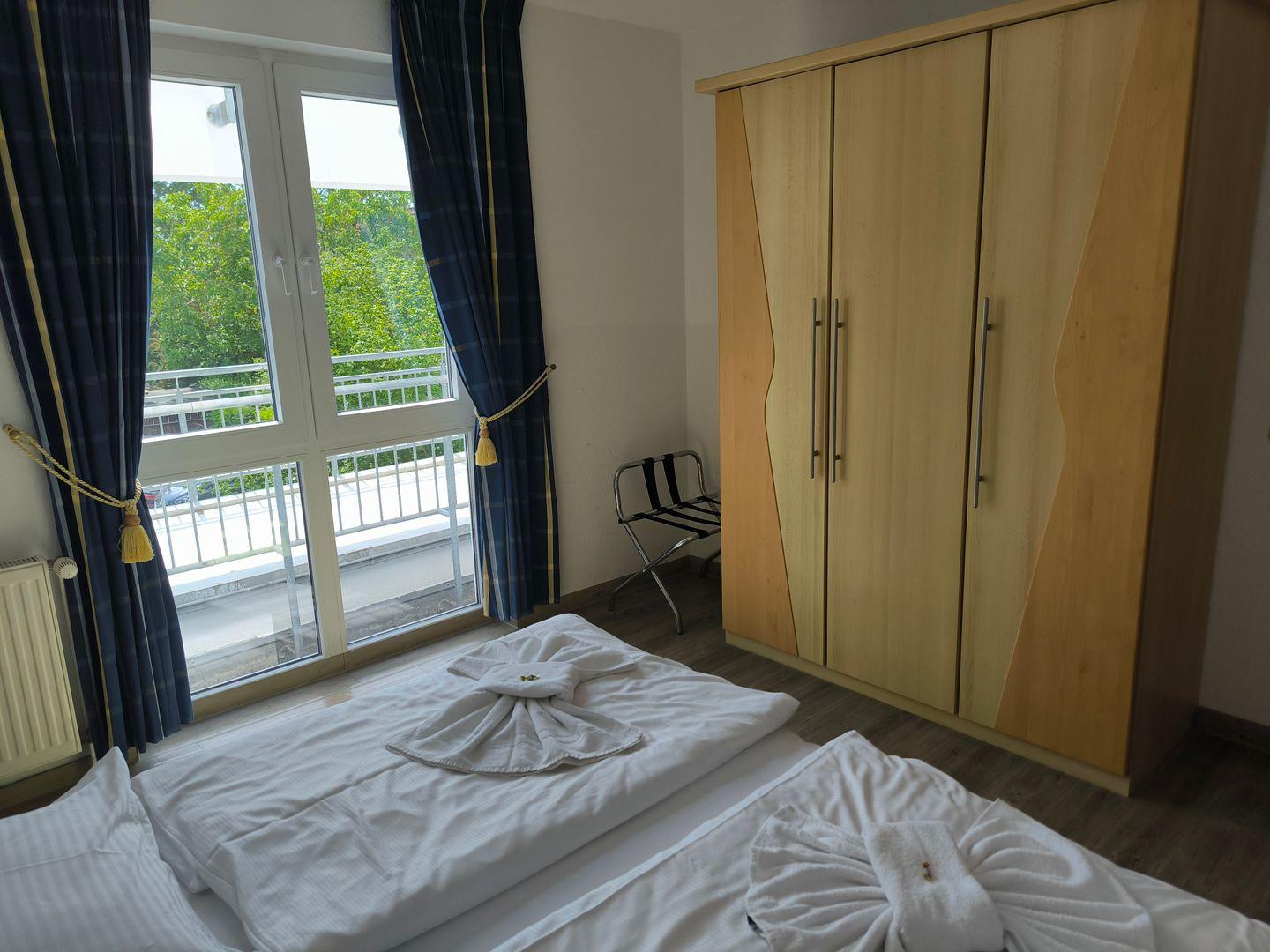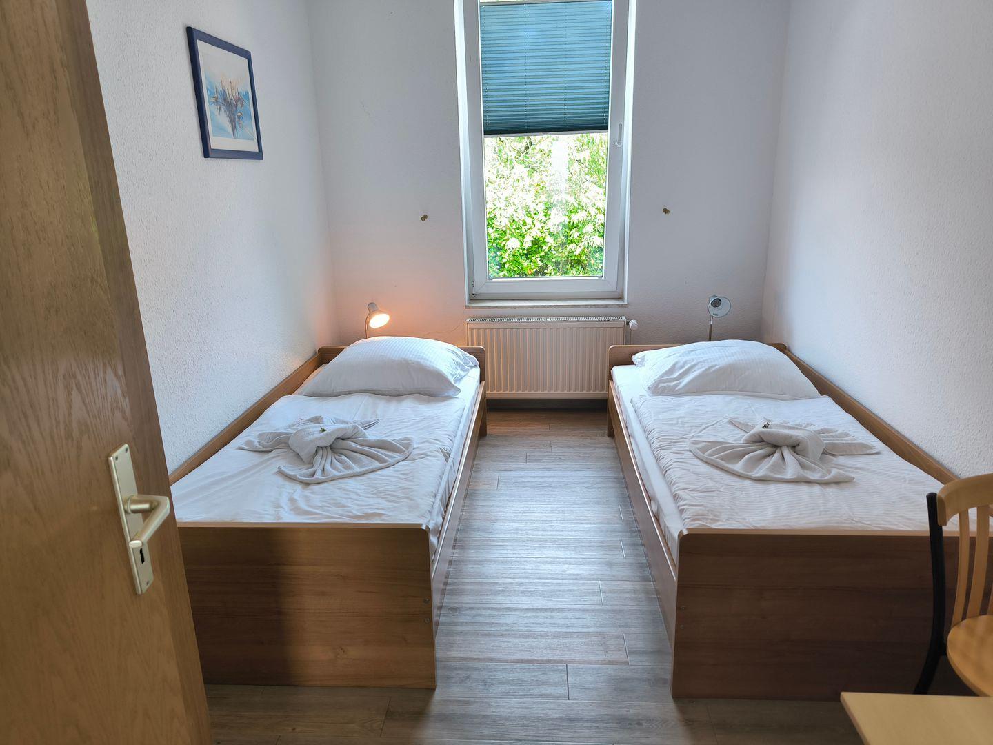 Schlafzimmer mit 2 Einzelbetten (90 x 200 cm ), großem Kleiderschrank, Tisch und Stühlen