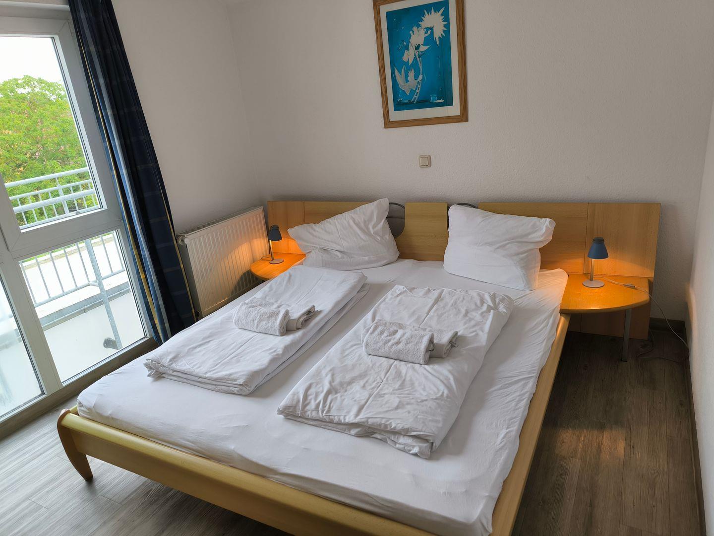 Schlafzimmer mit 2 Einzelbetten (90 x 200 cm ), großem Kleiderschrank, Tisch und Stühlen