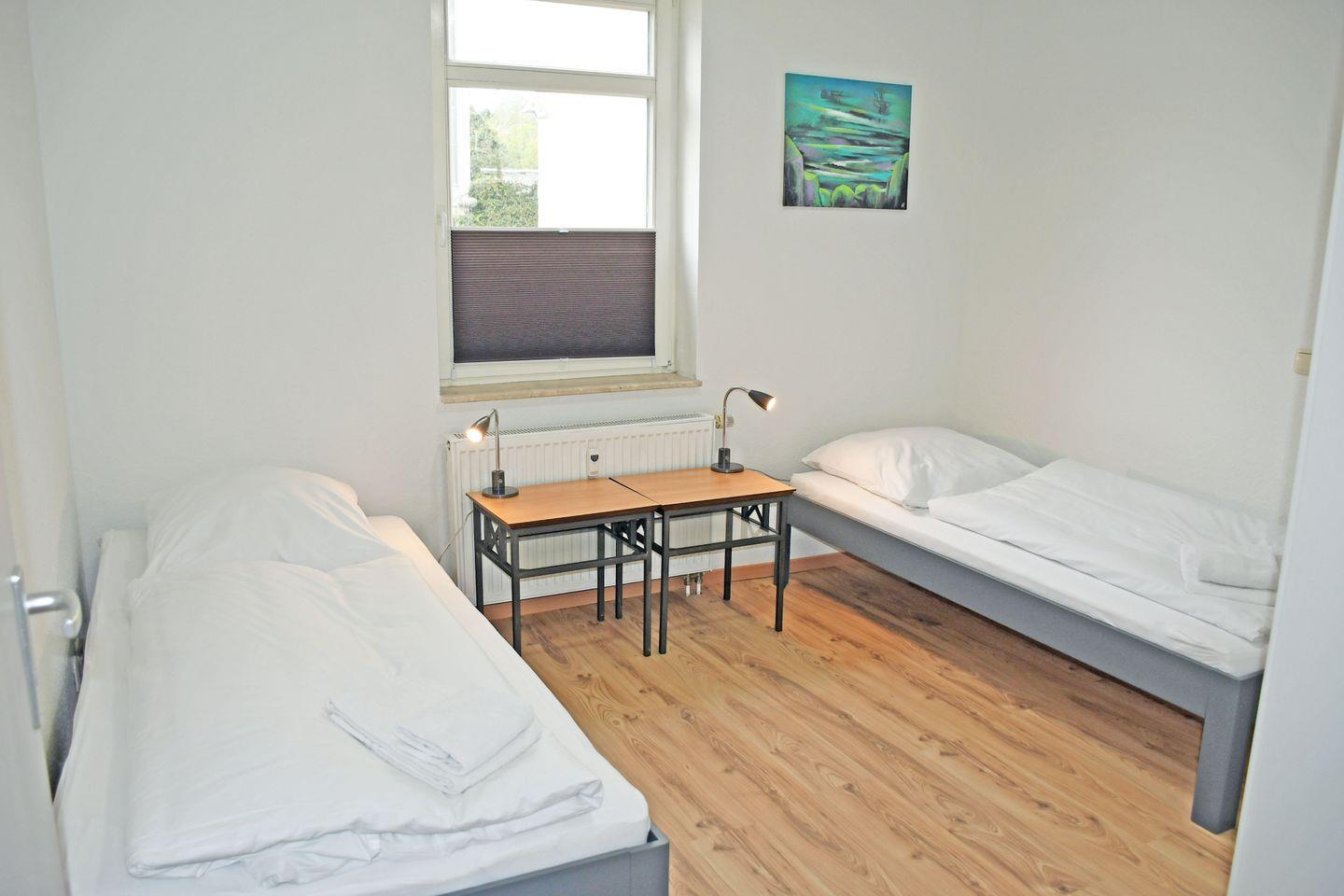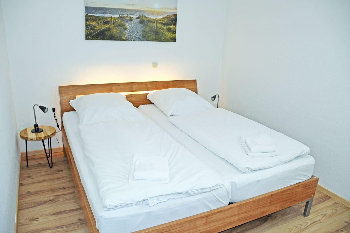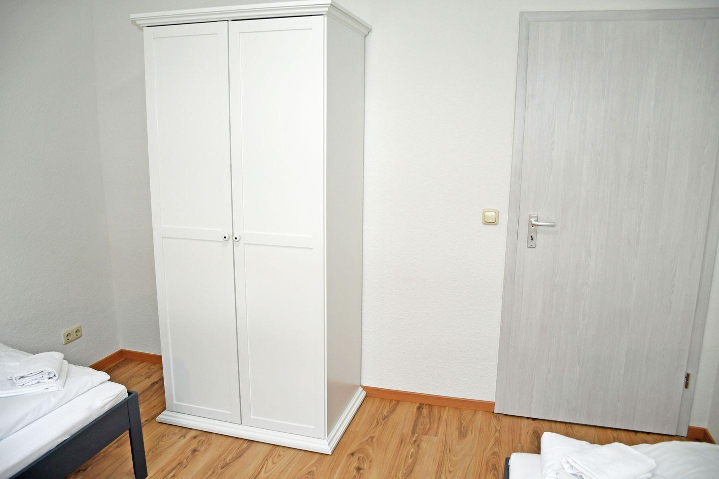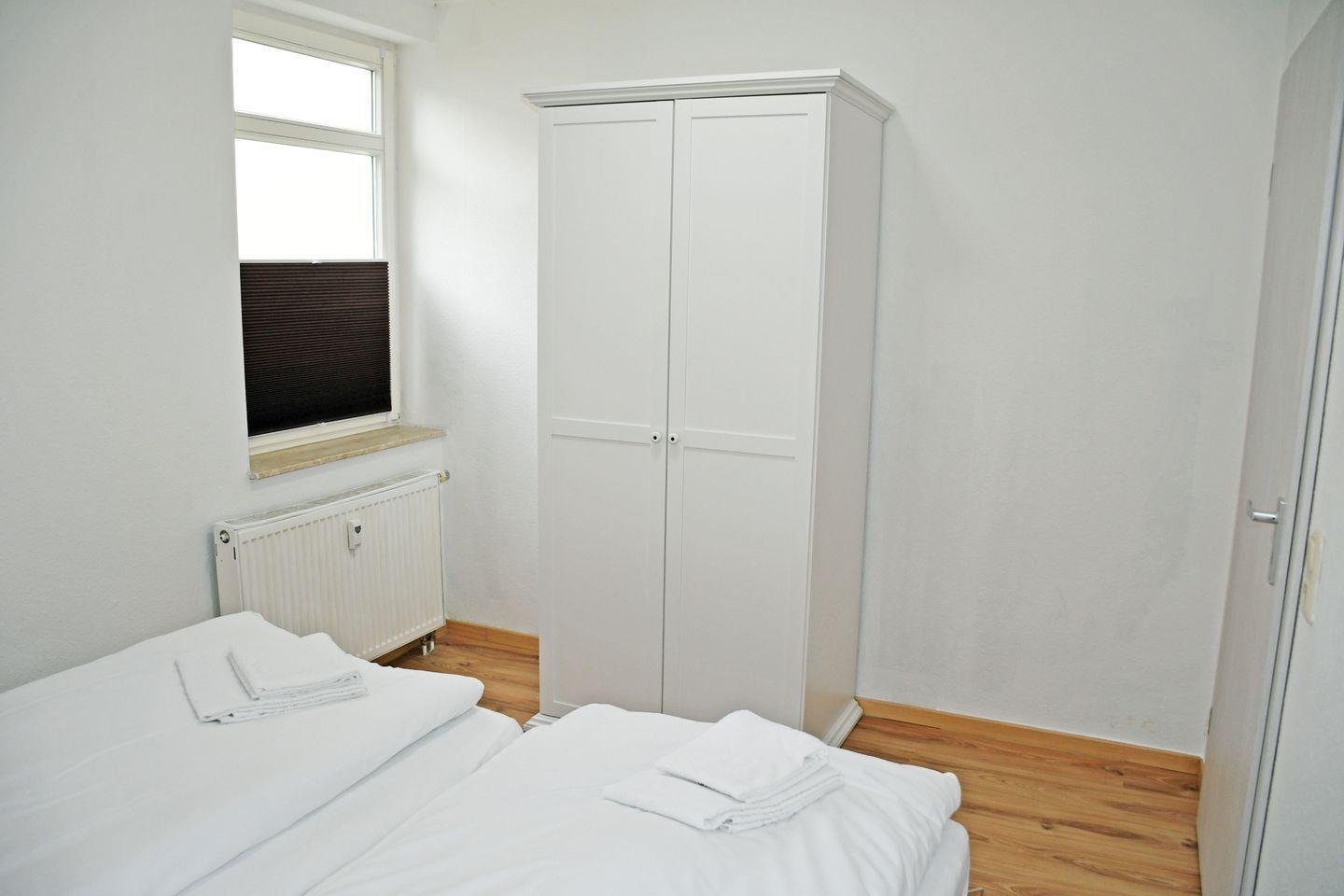 1 Schlafzimmer mit 2 Einzelbetten (90×190 cm) mit Leselampen, 2-türiger Kleiderschrank