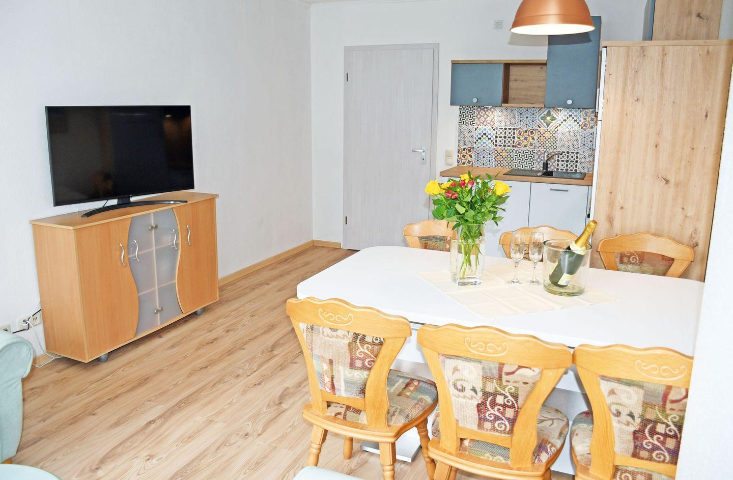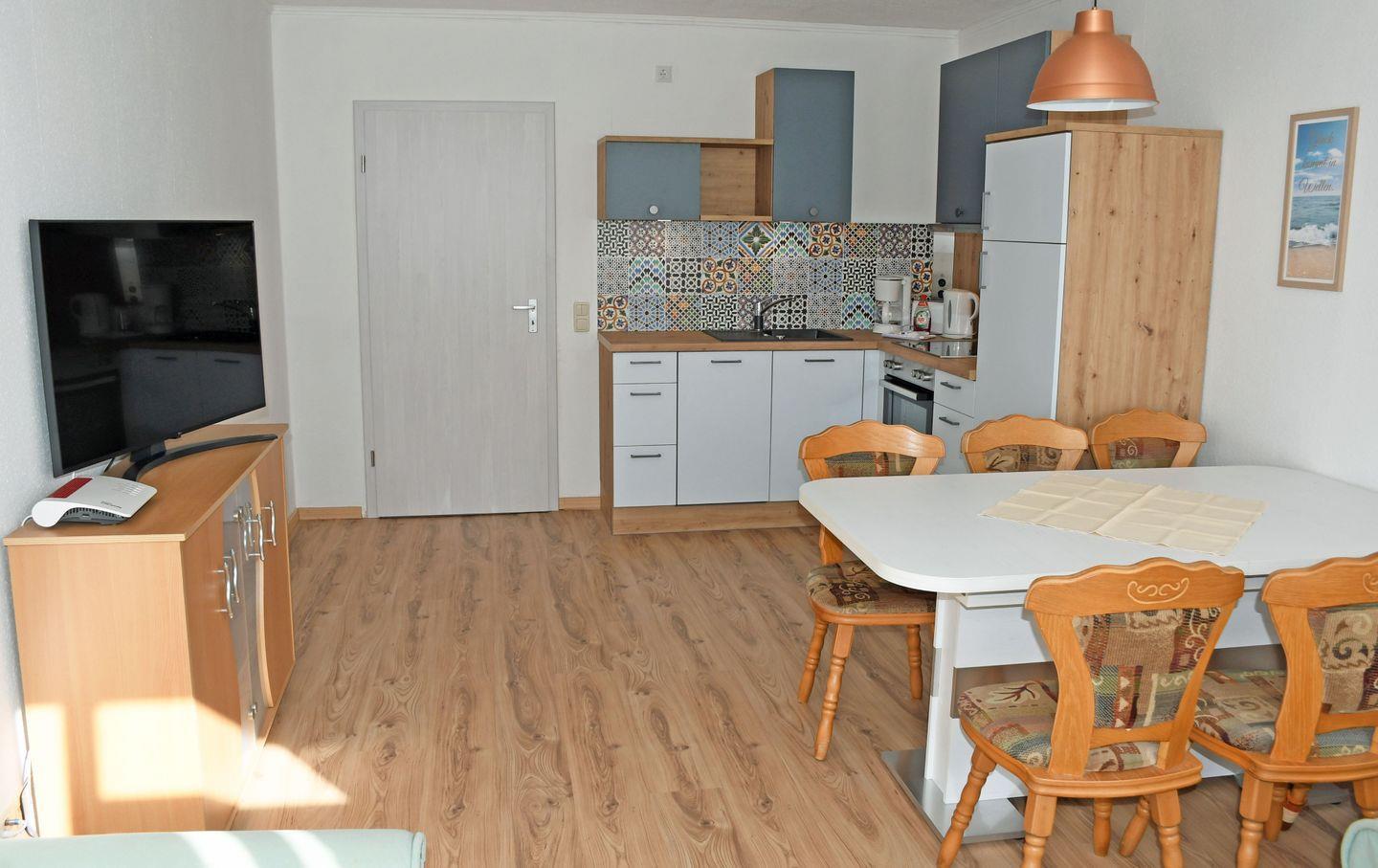 großer Wohnraum mit 2 Couchen, Tisch und TV , Essplatz mit 6 Stühlen