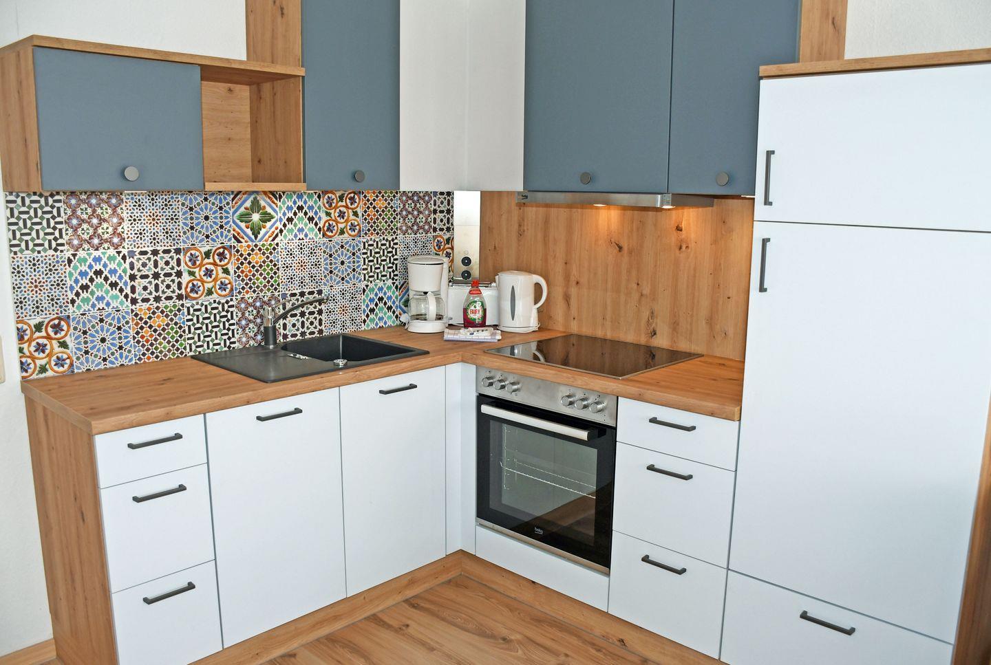 im Wohnraum integrierte Einbauküche mit 4-Platten-Ceran-Kochfeld, Backofen, Dunstabzugshaube, Kühl-Gefrier-Kombination, Spüle, Toaster, Kaffeemaschine, Wasserkocher, Geschirrspüler, diverse Küchenutensilien,