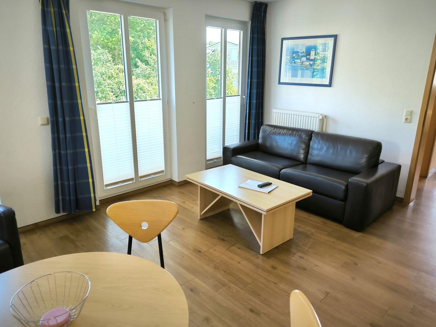 Wohnbereich mit ausziehbarer, moderner Doppelbettschlafcouch, Couchtisch mit Sesseln, Flat-TV mit Radiofunktion ,Esstisch mit 4 Stühlen