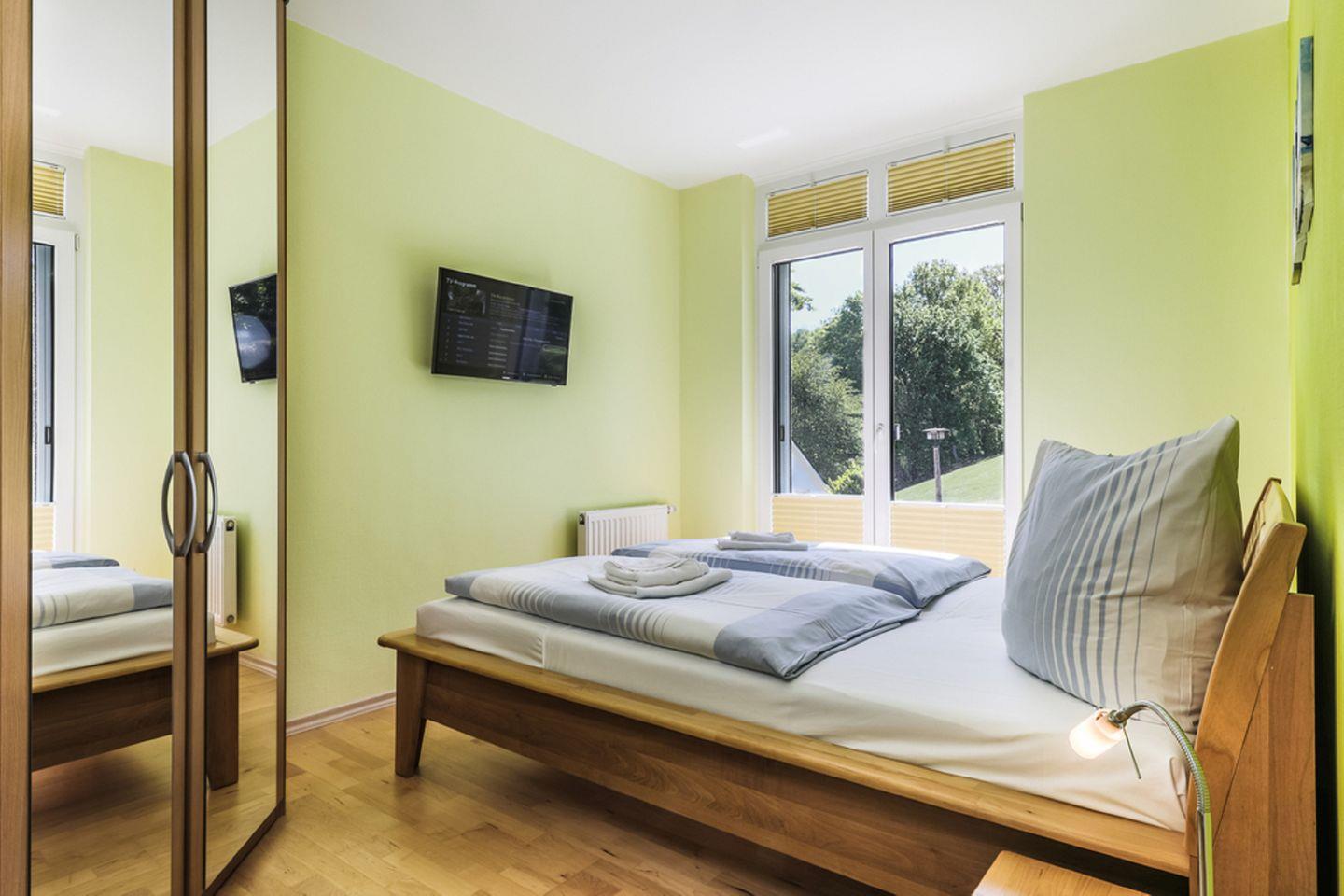 SCHLAFEN // ein Schlafzimmer mit Doppelbett, Kleiderschrank, Flachbild-TV und bodentiefe Fenster ++