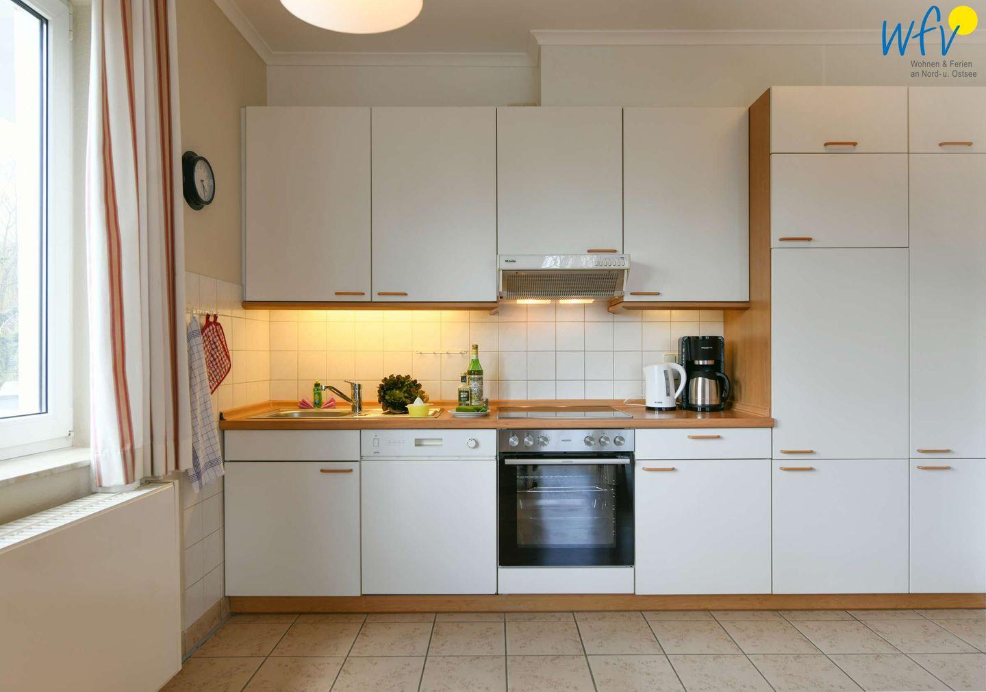 Für eine bequeme Selbstverpflegung verfügt die Küchenzeile der Ferienwohnung u.a. über einen 4-Plattenherd, einen Backofen, eine Mikrowelle und einen Geschirrspüler.