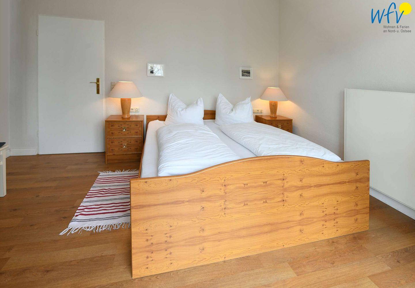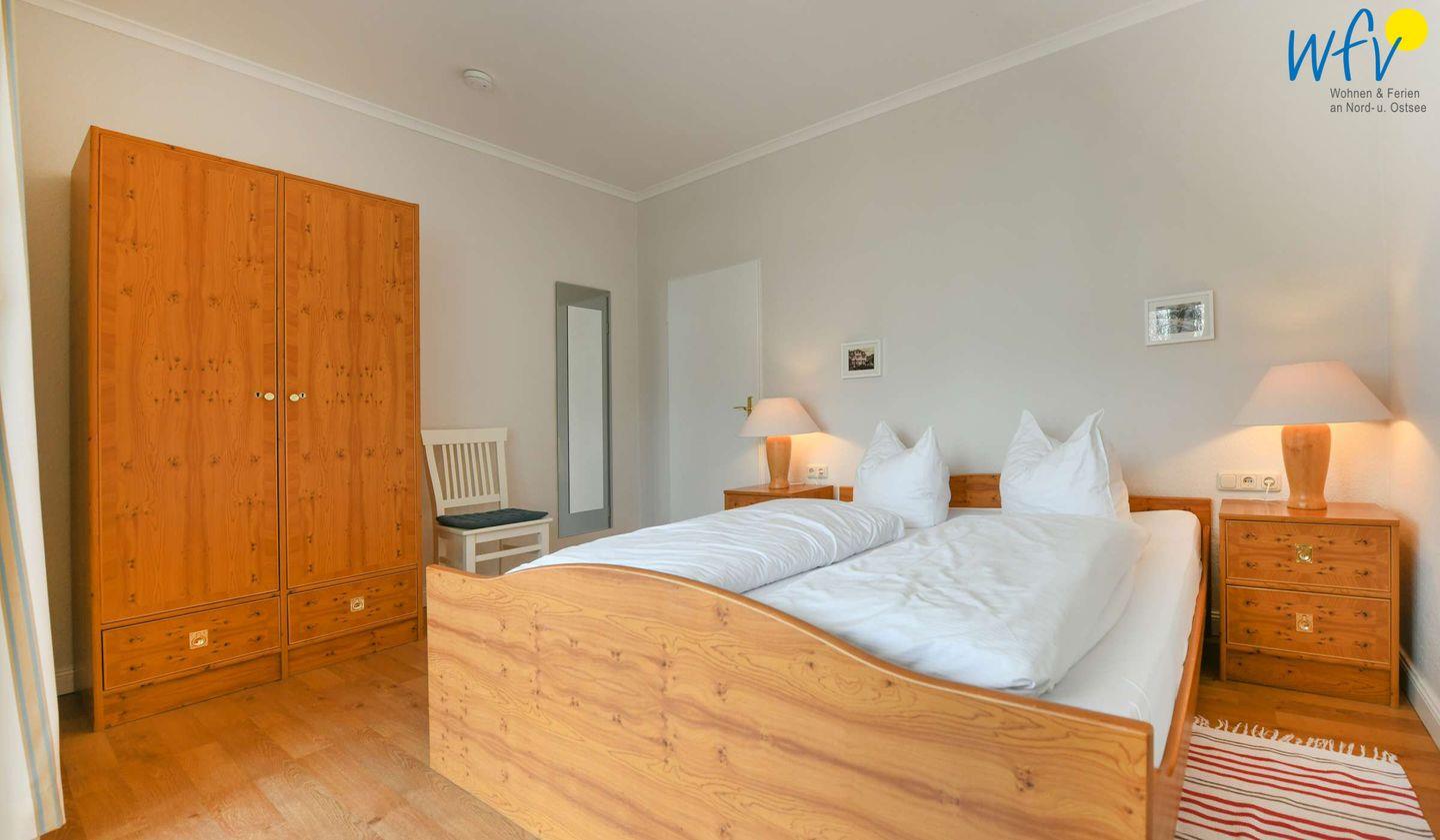 Das separate Schlafzimmer ist mit einem Doppelbett ausgestattet. Ihre Urlaubsgarderobe findet Platz im geräumigen Kleiderschrank. Bei einem Aufenthalt mit vier Personen ist eine Aufbettung möglich.