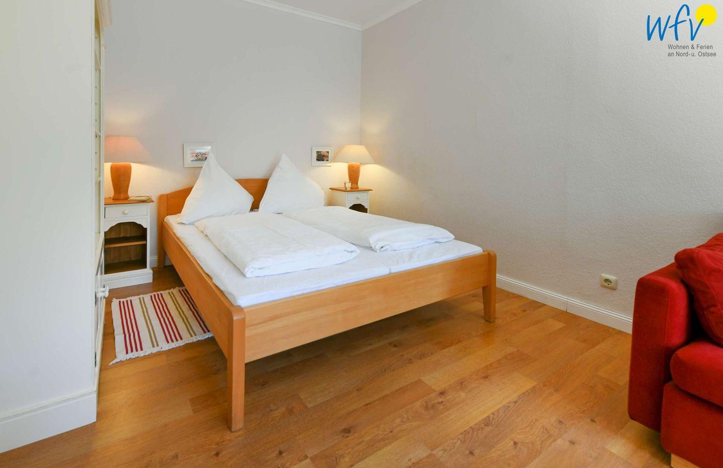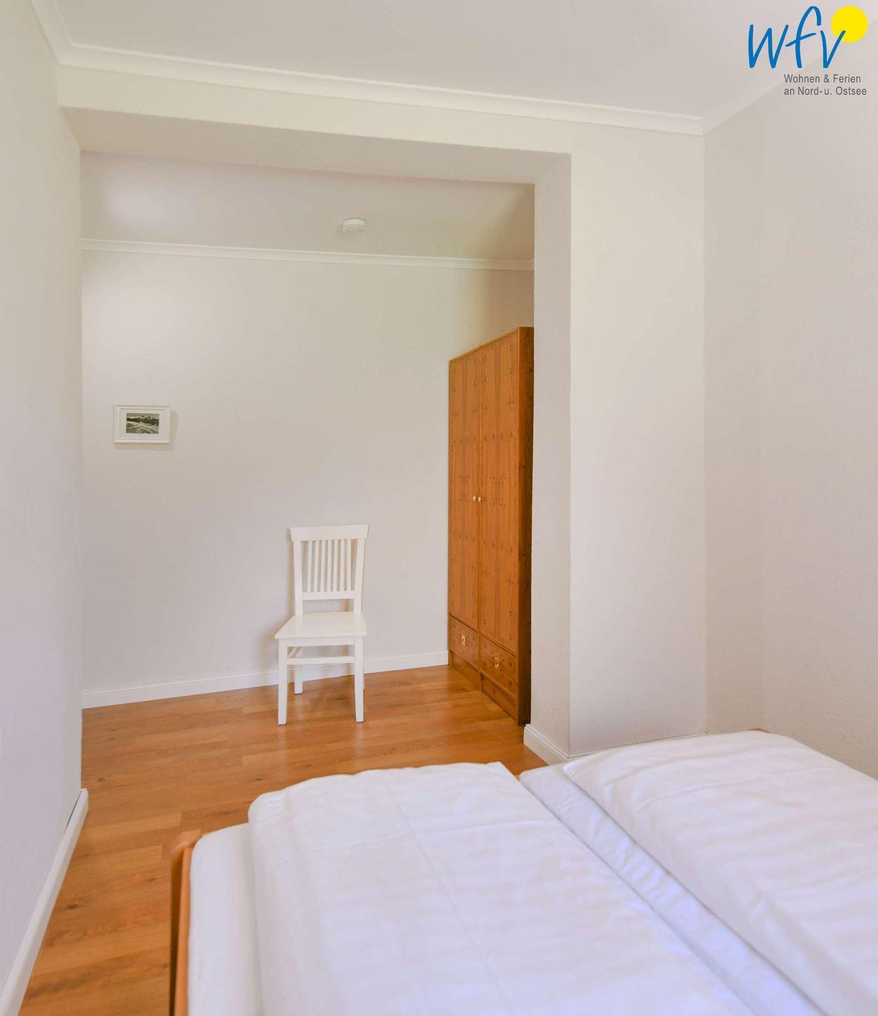 In den zwei separaten Schlafzimmern der Rügener Ferienwohnung befindet sich jeweils ein Doppelbett (1,60 m x 2 m). Eines der beiden Zimmer ist mit einer gemütlichen Leseecke mit Couch und Sessel eingerichtet. Eine Aufbettung ist möglich (auf Anfrage).