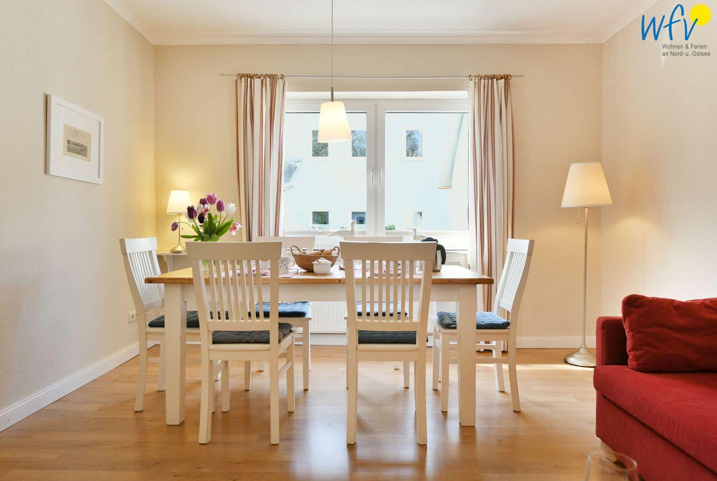 Ein großzügiger Wohnraum mit Couchecke und Essbereich, eine Küchenzeile sowie zwei separate Schlafzimmer bieten Ihnen Platz für die ganze Familie oder den Freundeskreis. Helle Räume, stilvolles Mobiliar und eine hübsche Aussicht auf den Wald verleihen der Rügener Ferienwohnung viel Gemütlichkeit.