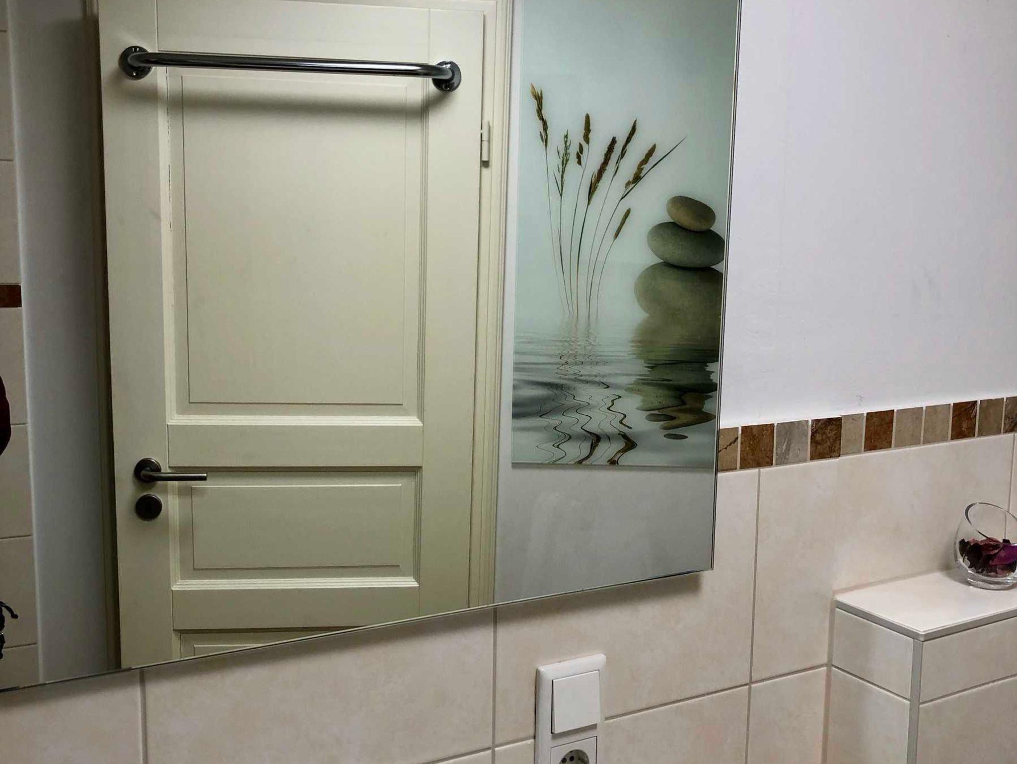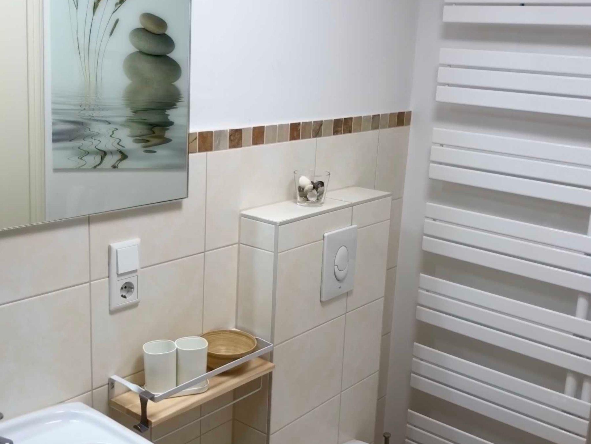 in der FeWo Peterskirche eine Dusche. Beide Wohnungen sind baugleich, in der FeWo Altstadtbrücke ist die historische Holzbalkendecke freigelegt...