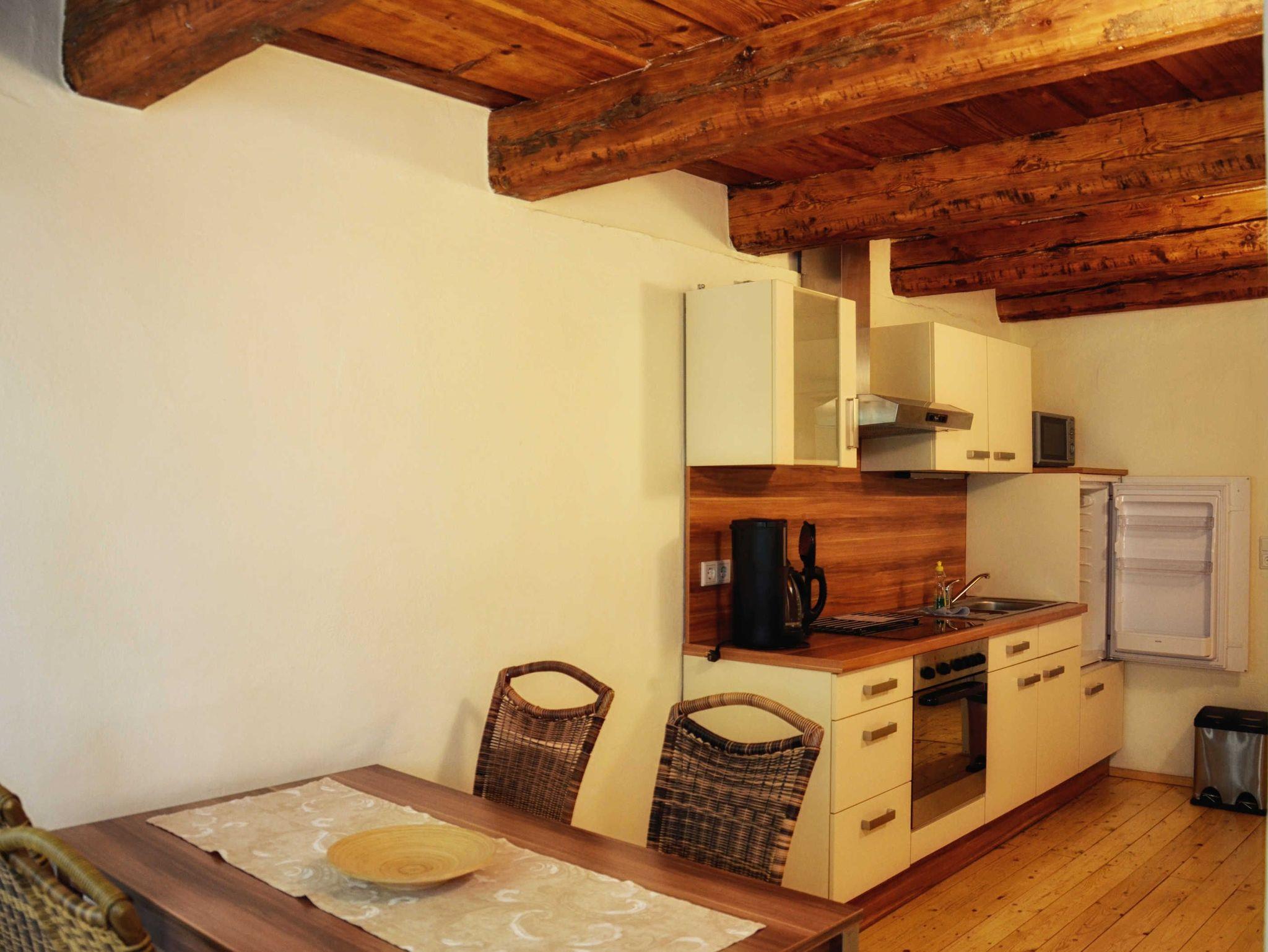 Eine elegante Wohnung unter historischer Holzbalkendecke mit Wohn-/Schlafraum, Bad und Wanne finden Sie im ersten Obergeschoss. Die Ferienwohnung Altstadtbrücke bietet Unterkunft für bis zu vier Personen. Aus der schönen Wohnküche sehen Sie in den gepflegten Garten mit lauschigen Sitzecken und können den Sonnenuntergang hinter der Peterskirche beobachten.