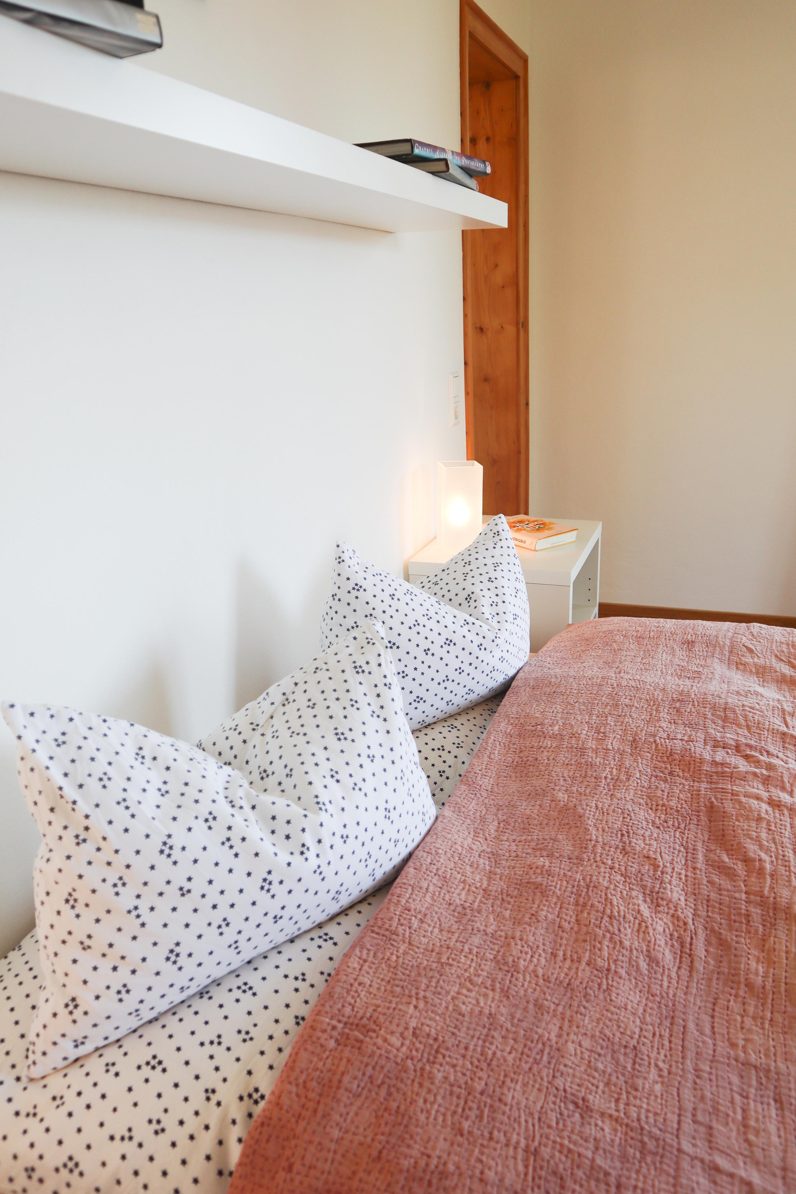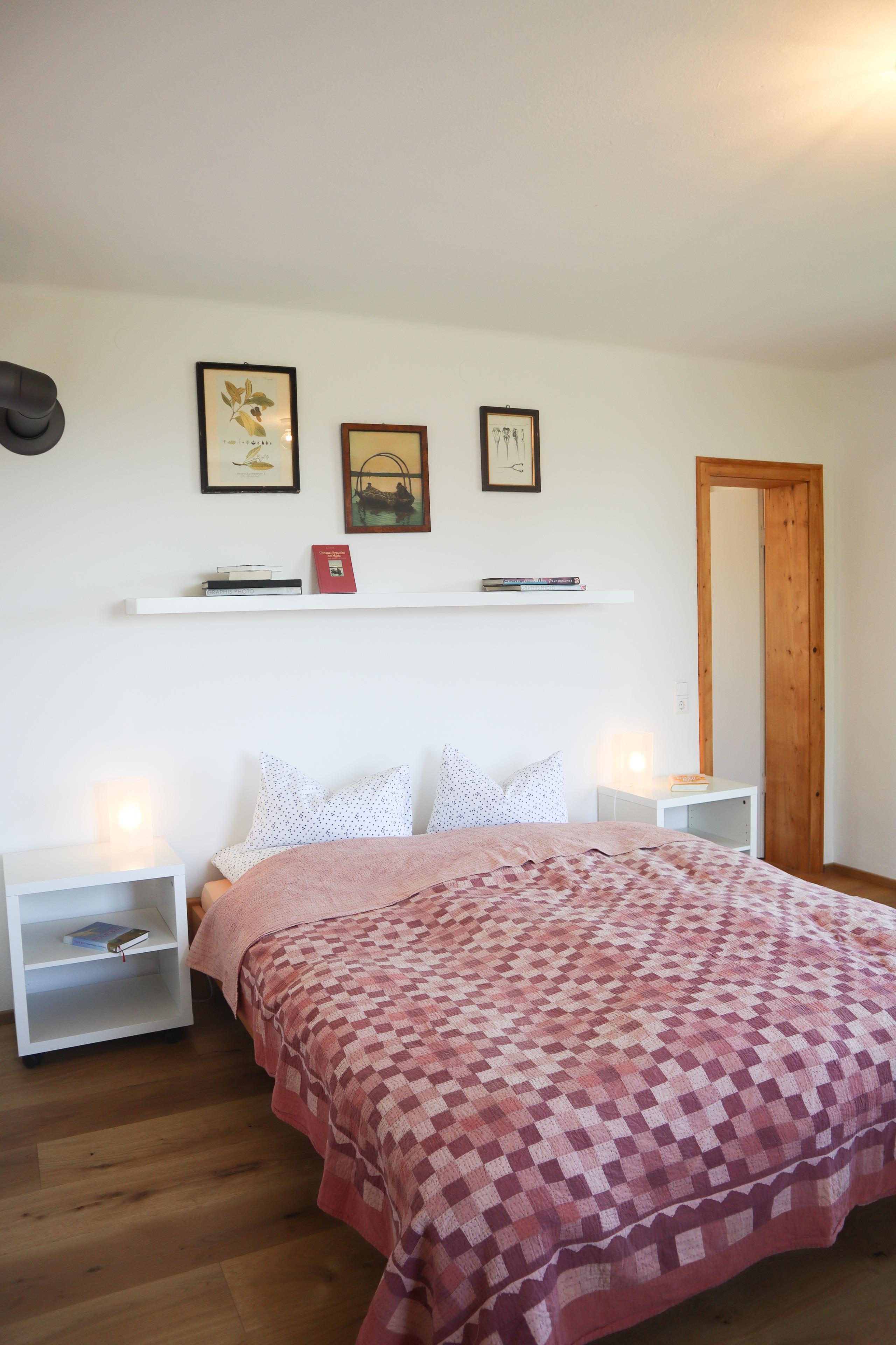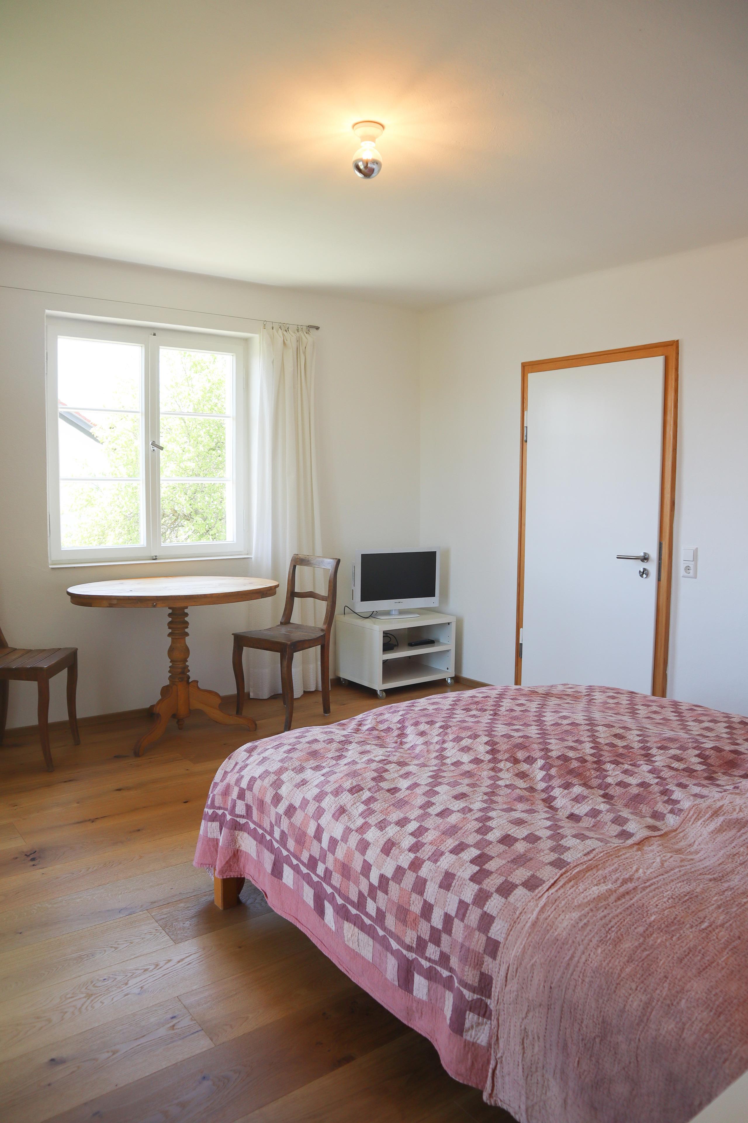 Die 70 m² große Ferienwohnung im 1. Stock ist über eine steile, breite Holztreppe erreichbar, welche mit einem Treppenschutzgitter gesichert werden kann. Die drei Zimmer sind aufgeteilt in zwei Schlafzimmer mit Doppelbetten 1,80 m breit, ein großzügiges Wohnzimmer mit einem großen runden Esstisch und einem modernen Sofa, welches auch als Schlafsofa sehr bequem ist, sowie eine vollausgestattete Küche mit einem kleinen Frühstückstisch.