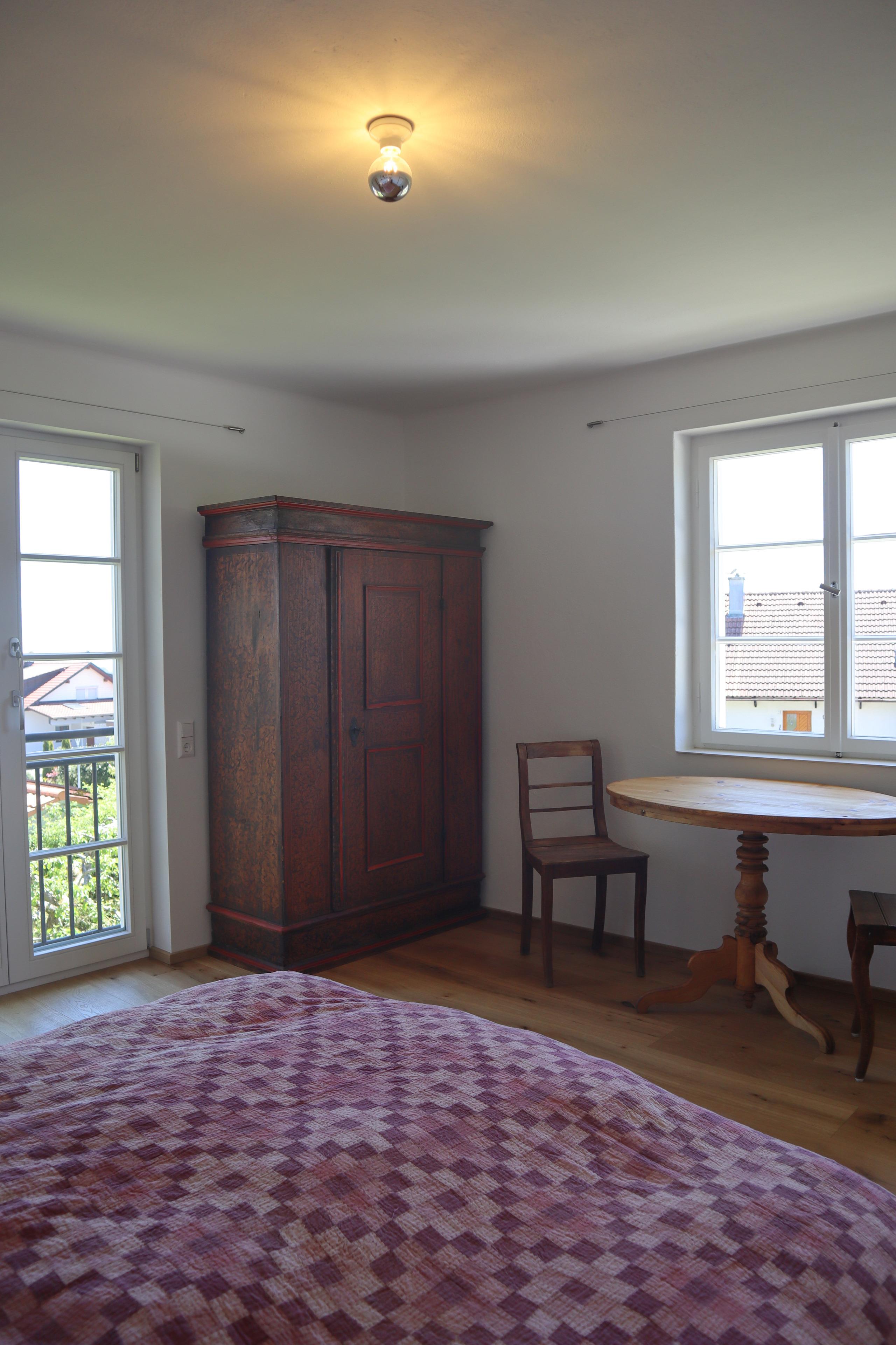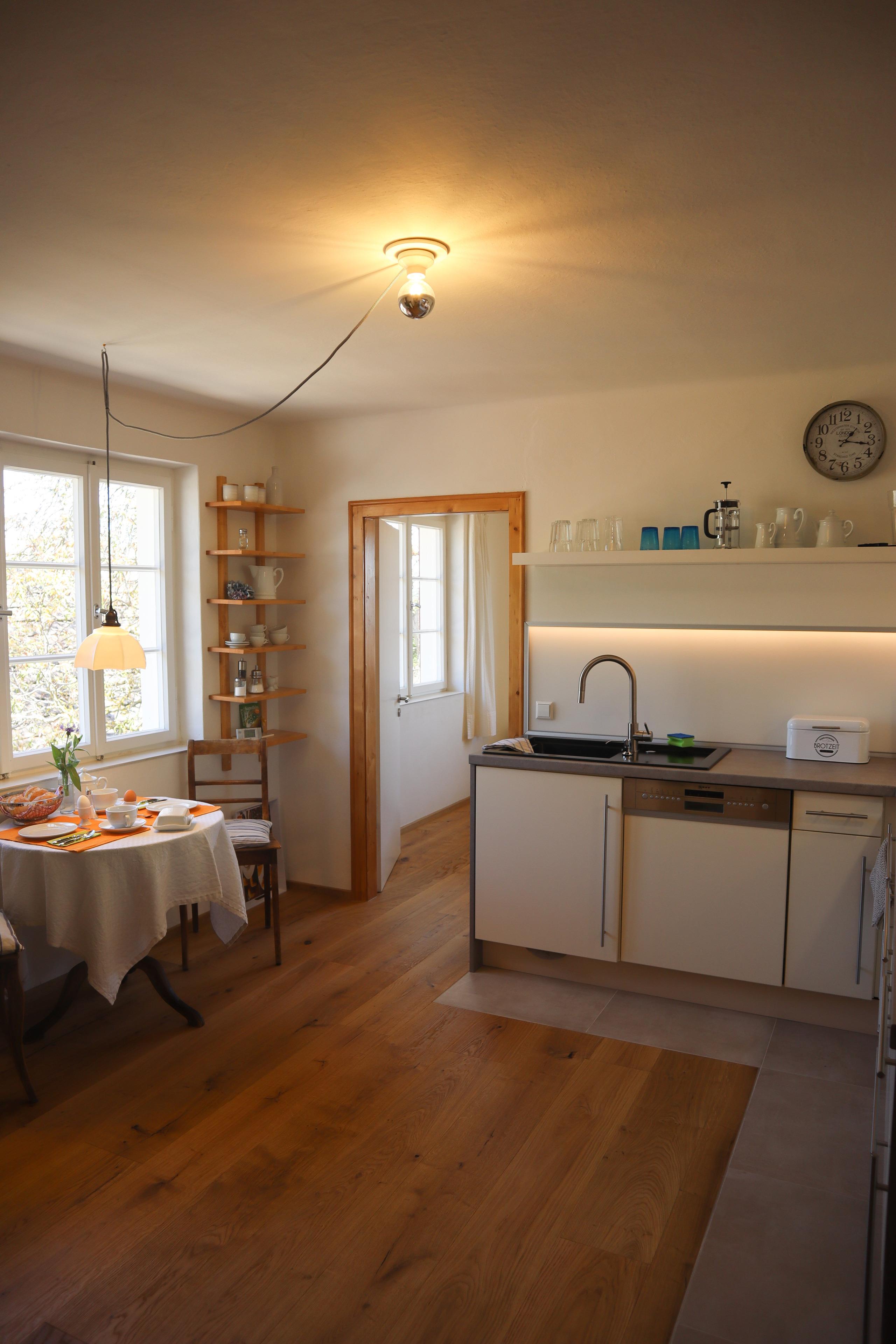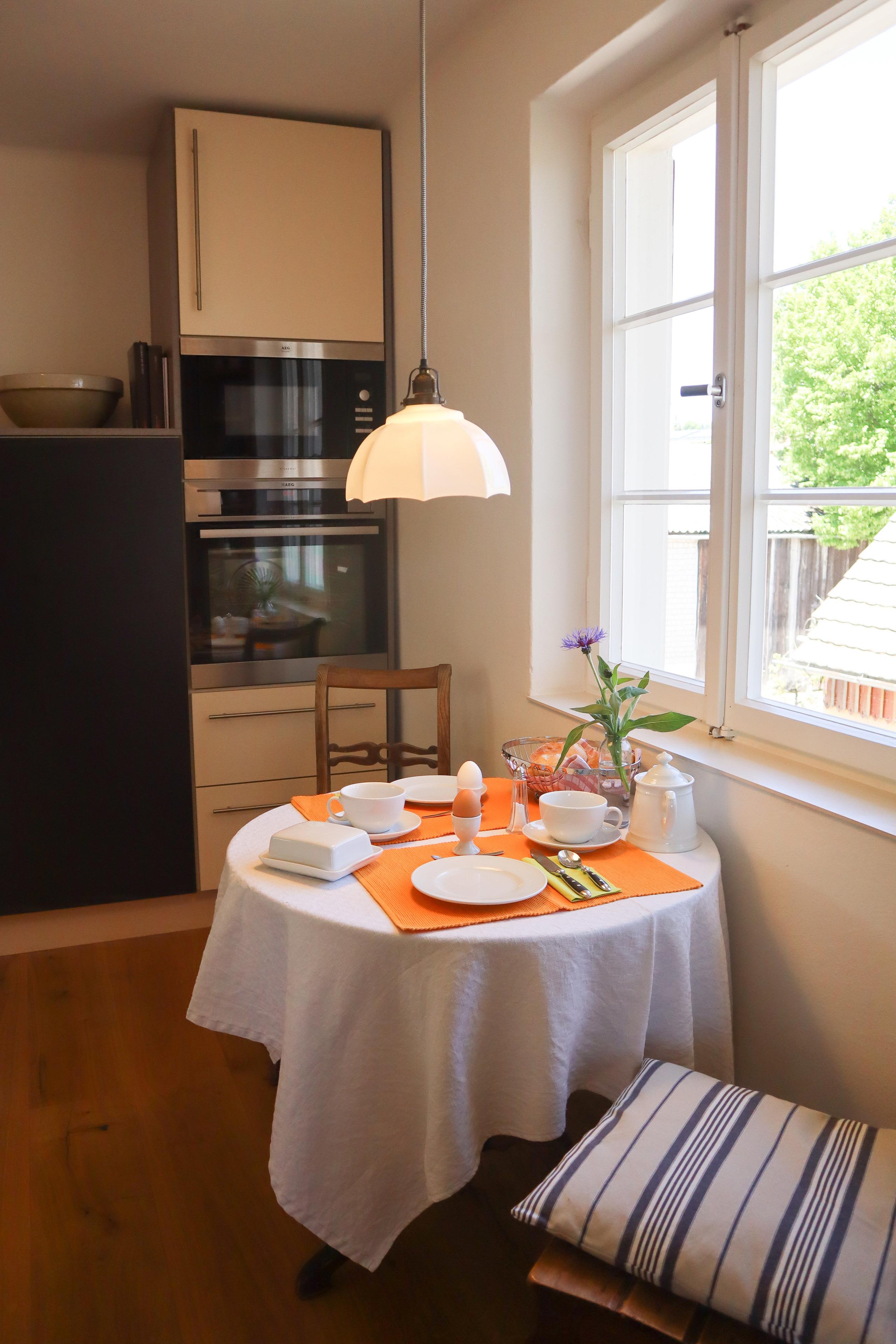Bei uns erwartet Sie eine lichtdurchflutete, liebevoll sanierte und ausgestattete Ferienwohnung mit Fußbodenheizung, Eichenparkett und einem historischen Standkachelofen.