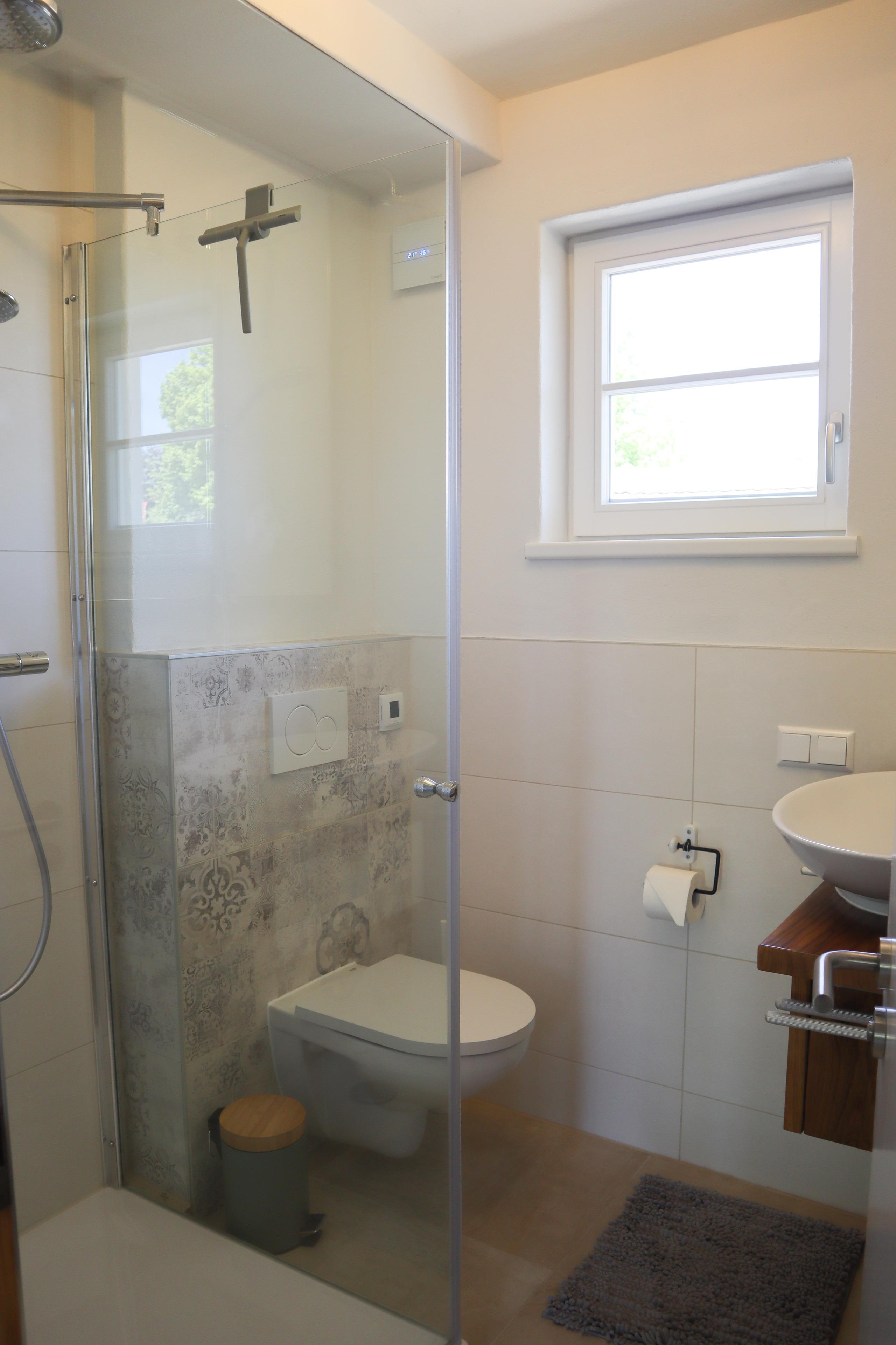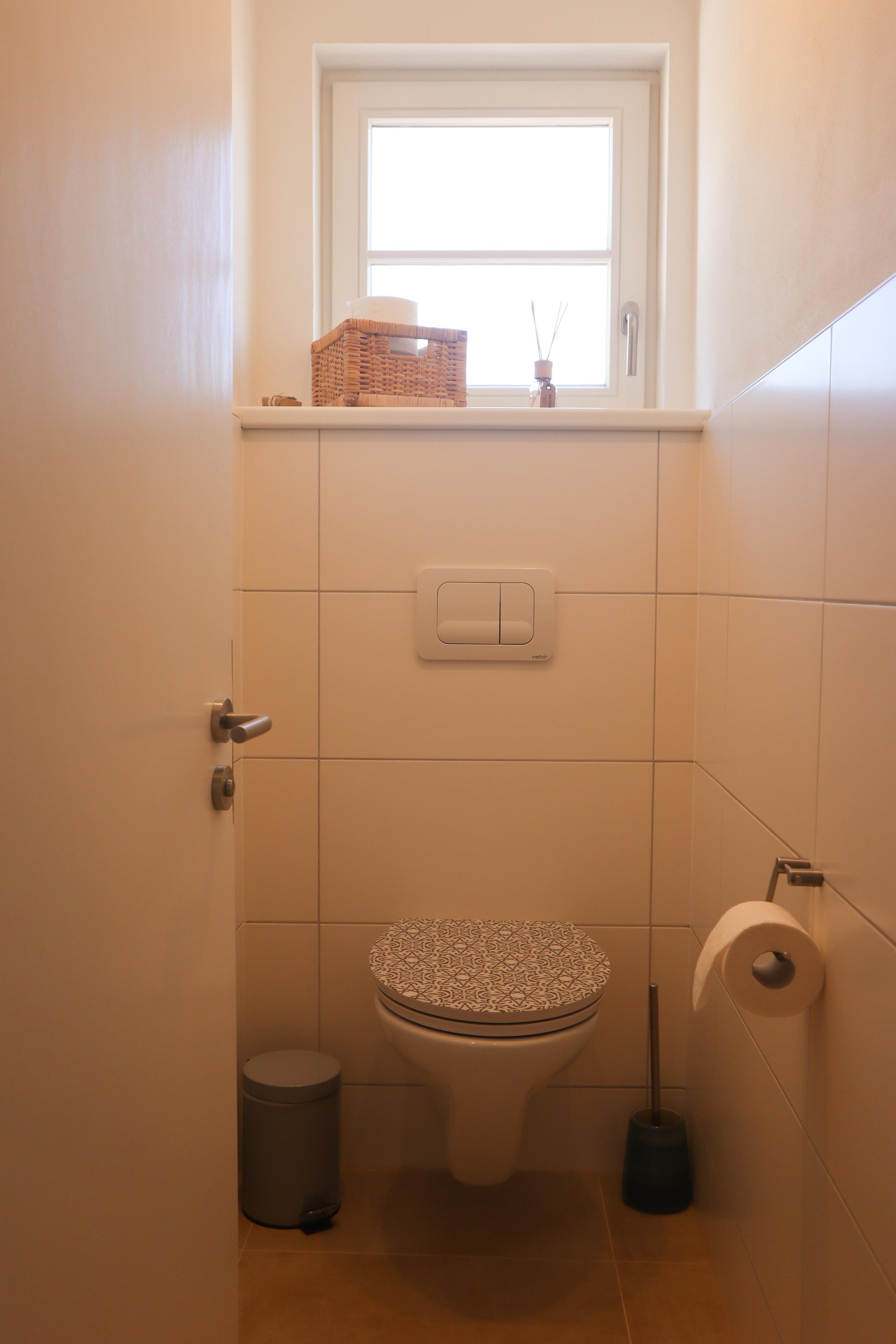 Das Duschbad mit WC ist ziemlich klein aber fein, zusätzlich ist noch ein separates Gäste-WC vorhanden. Eine Waschmaschine ist nicht vorhanden.