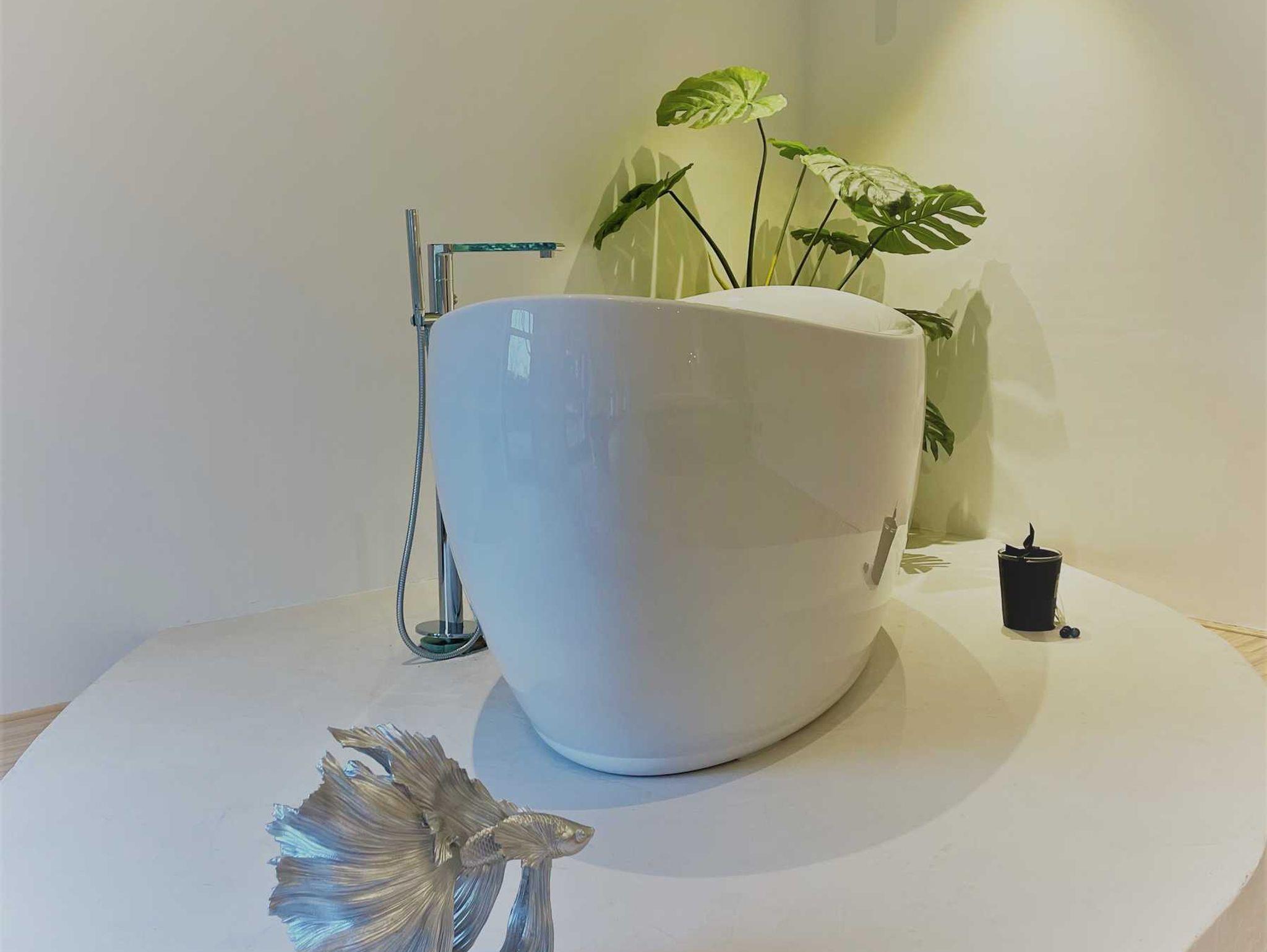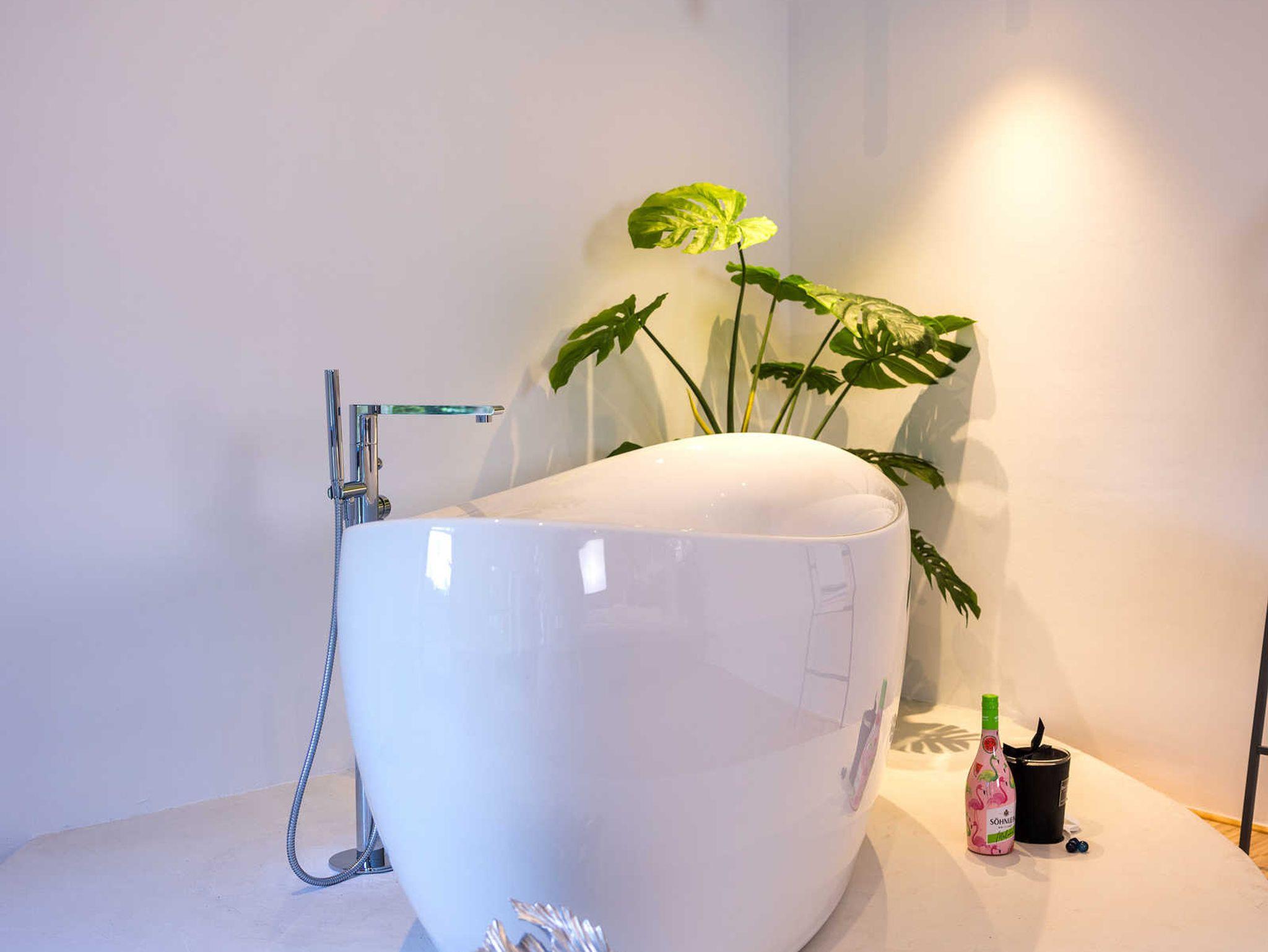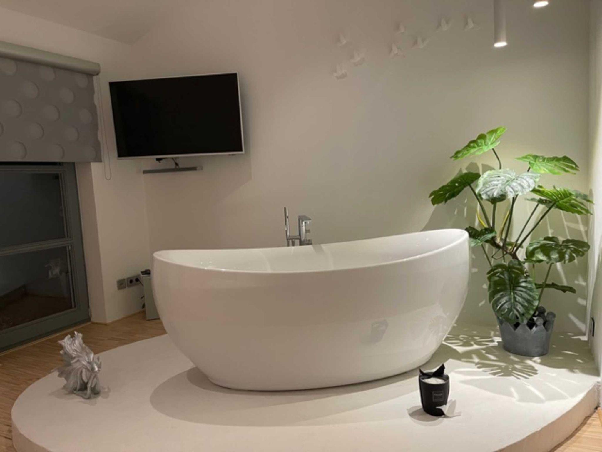 freistehende Badewanne im Schlafraum. Die Wohnung befindet sich in der