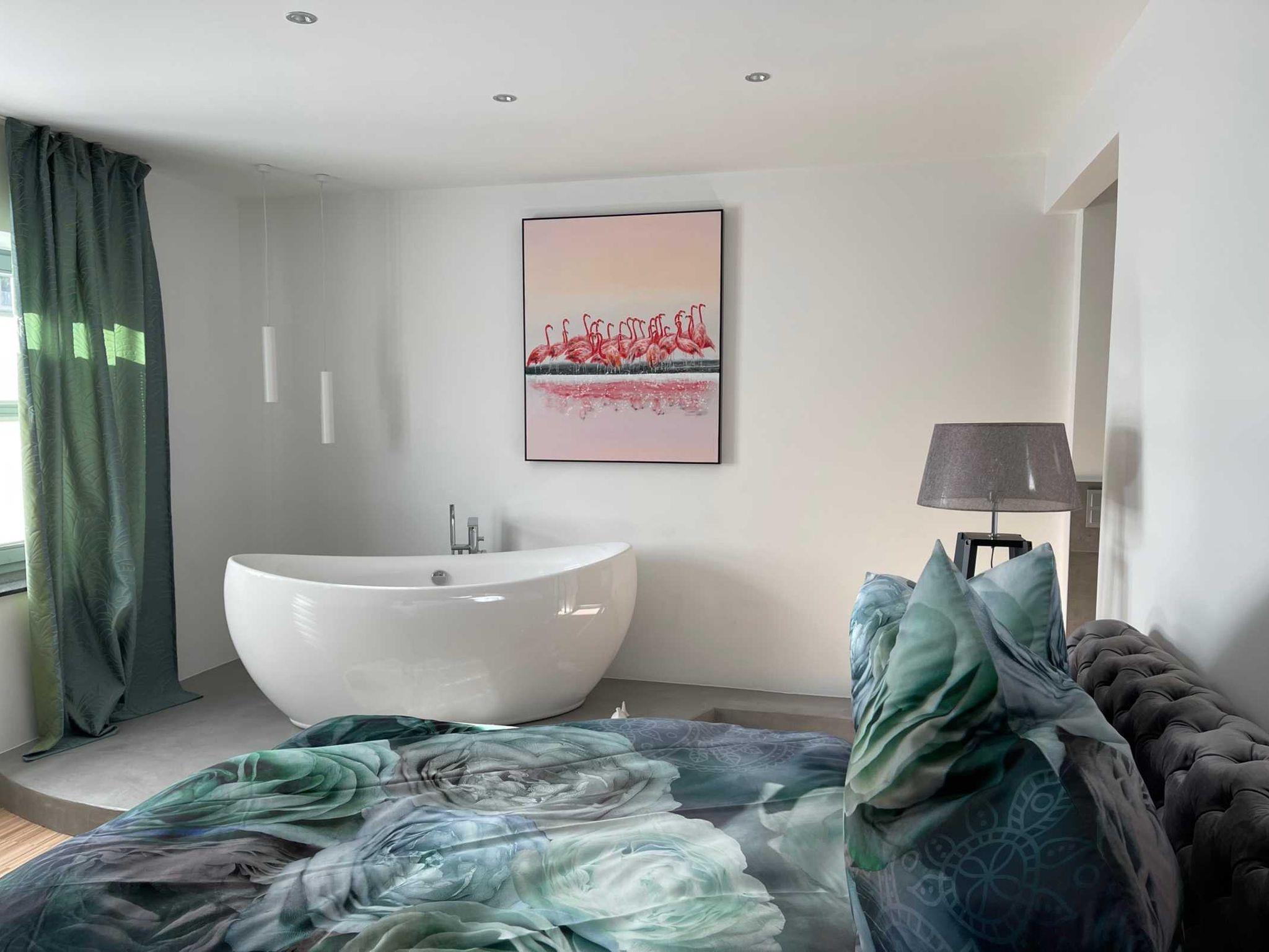 freistehende Badewanne im Schlafraum. Die Wohnung befindet sich in der